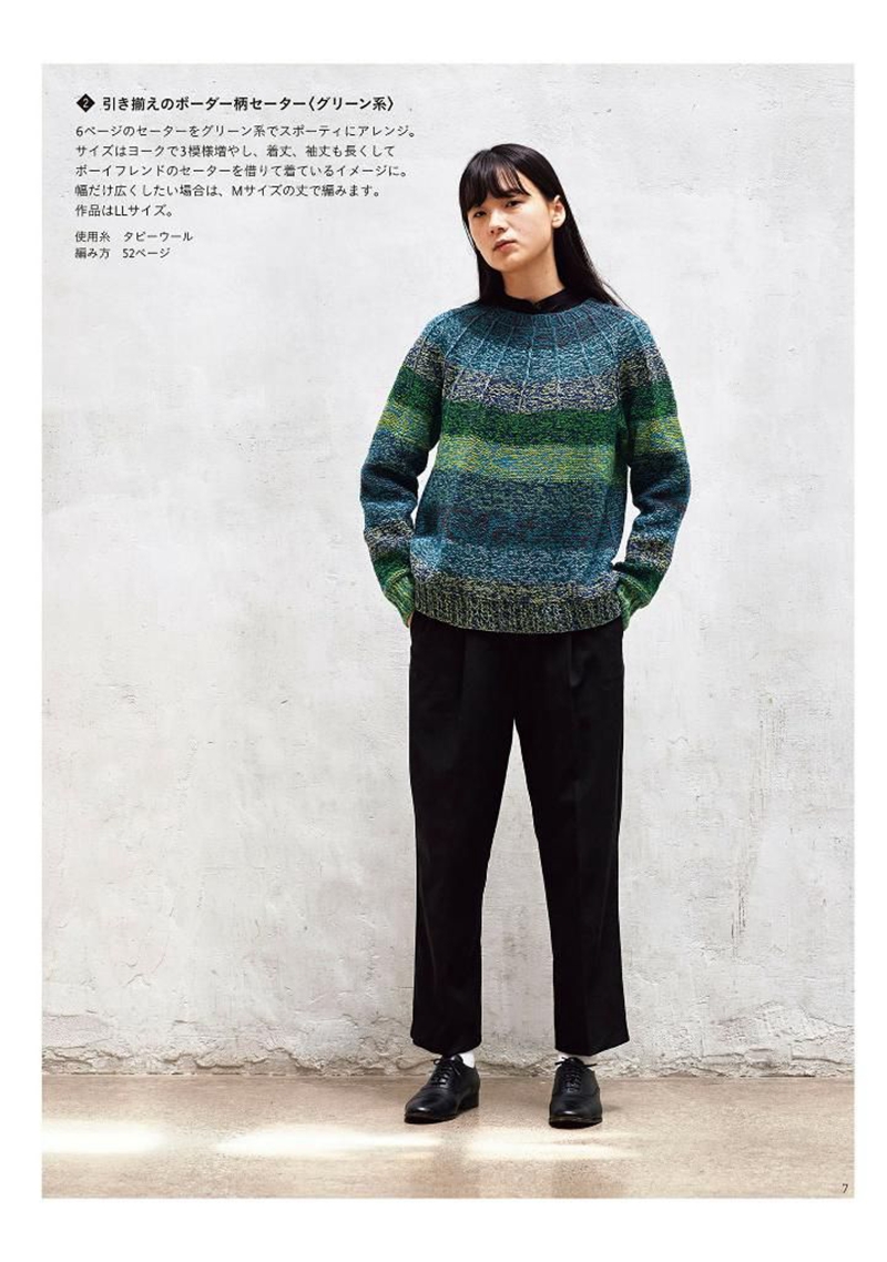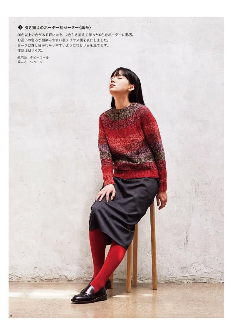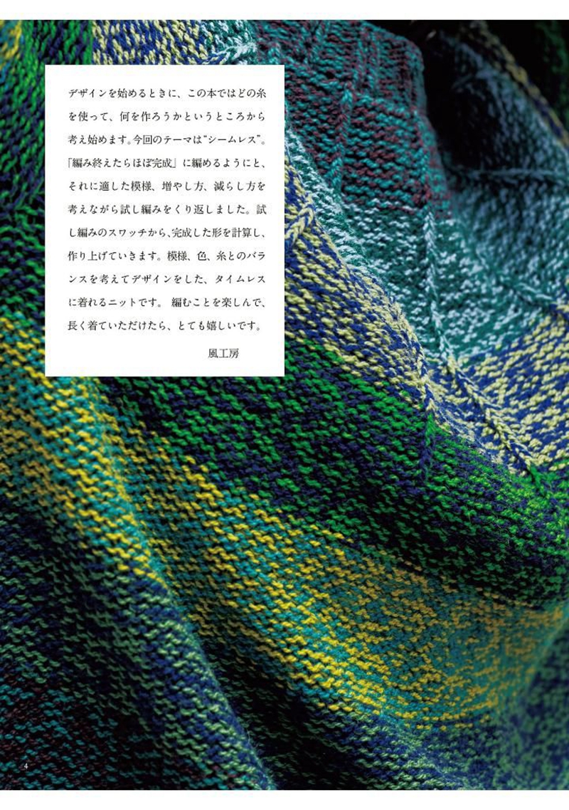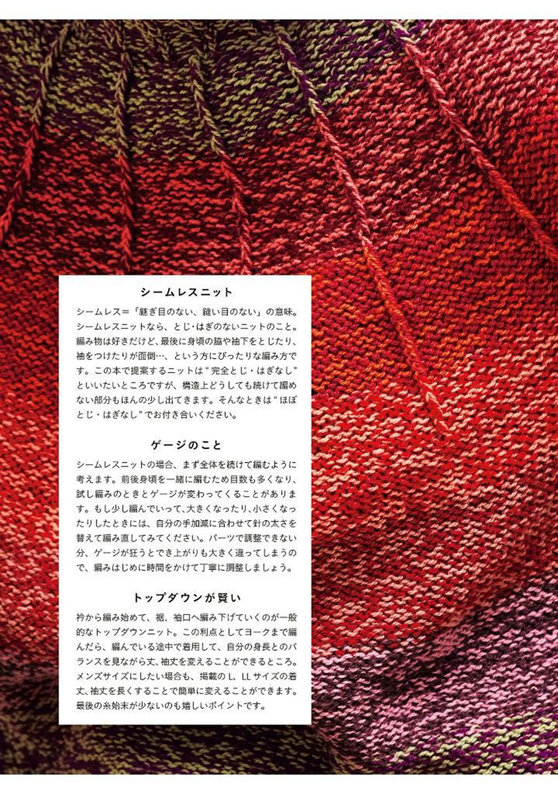 本のテーマは、ずばり“シームレス”。トップダウンで編むやさしい地模様や編み込みの丸ヨークニットをはじめ、ラグランスリーブのカーディガン、肩下がりをつけながら編み下ろすベスト、ボトムアップのセーター、多色を引き揃えた著者らしいカラーのニットなど、M・L・LLサイズ展開で紹介。