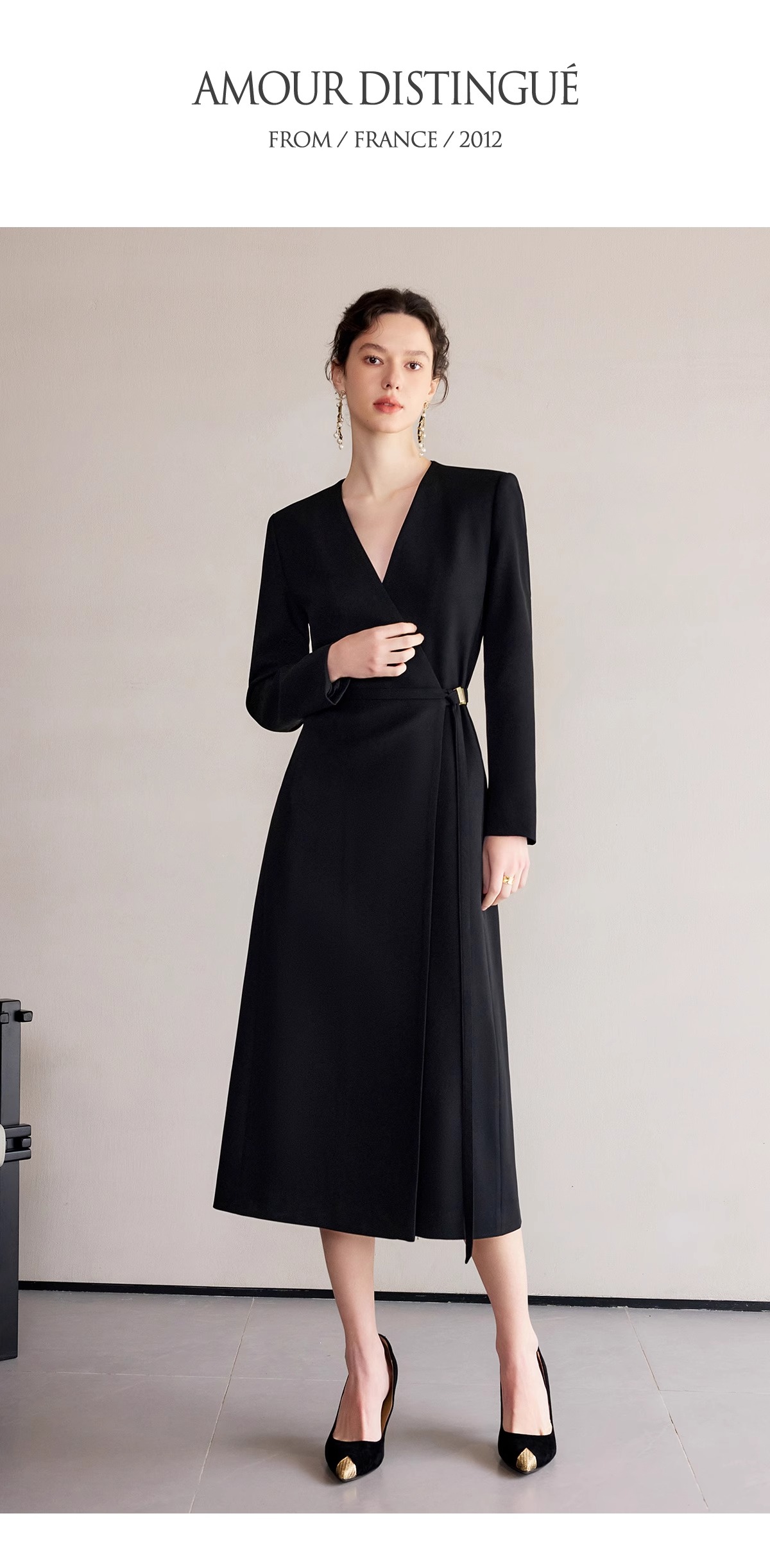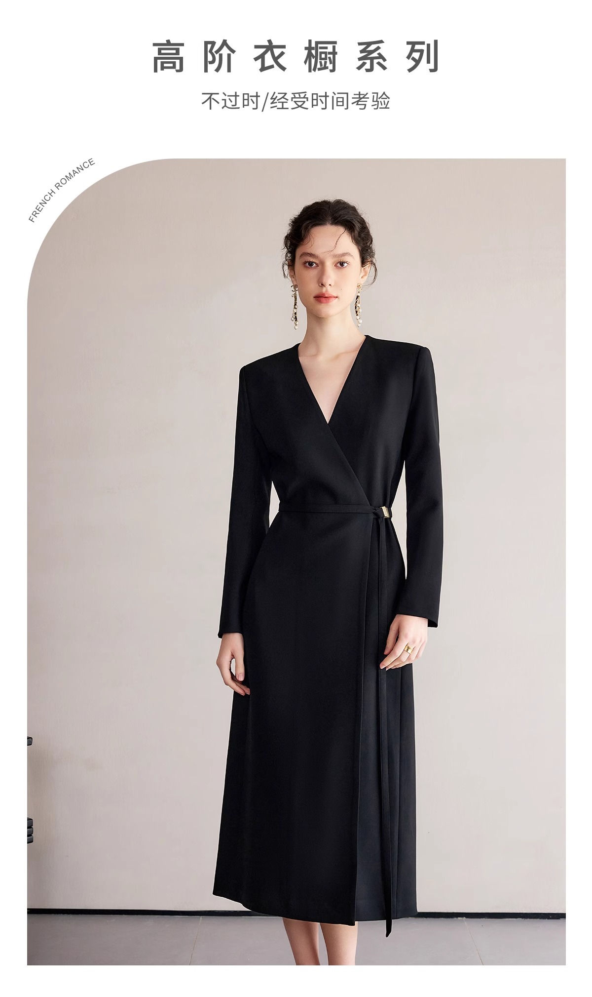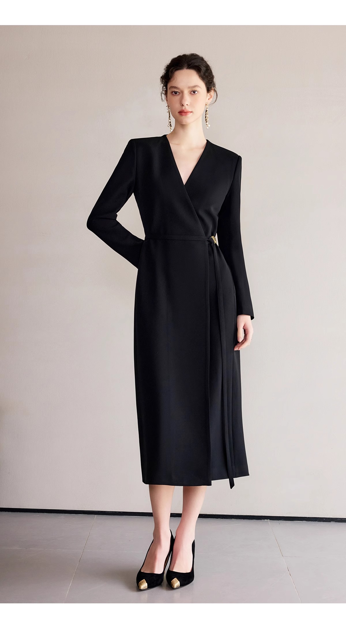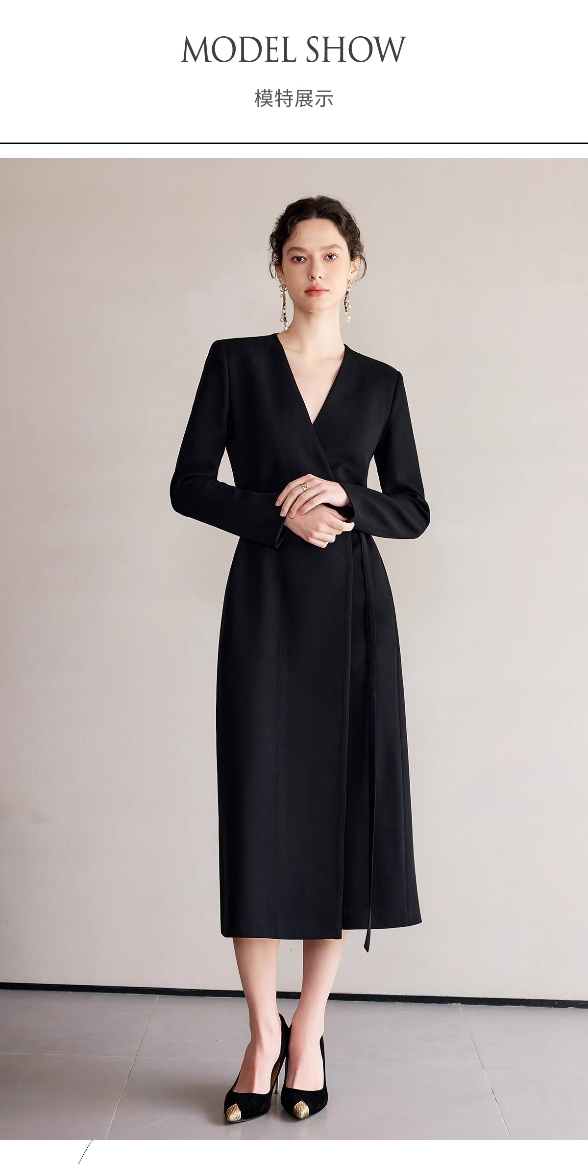 IWY/冷淡系别致裙子深V领连衣裙职业装中长款系带西装小黑长裙礼服 Q1248