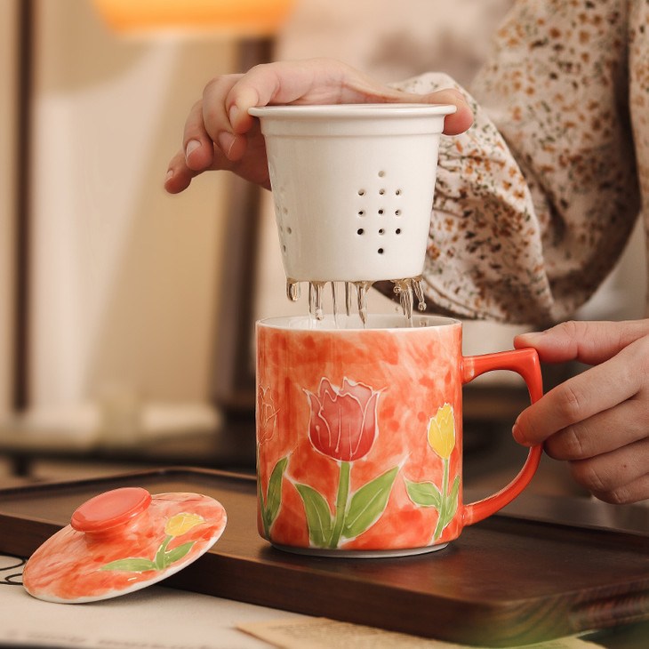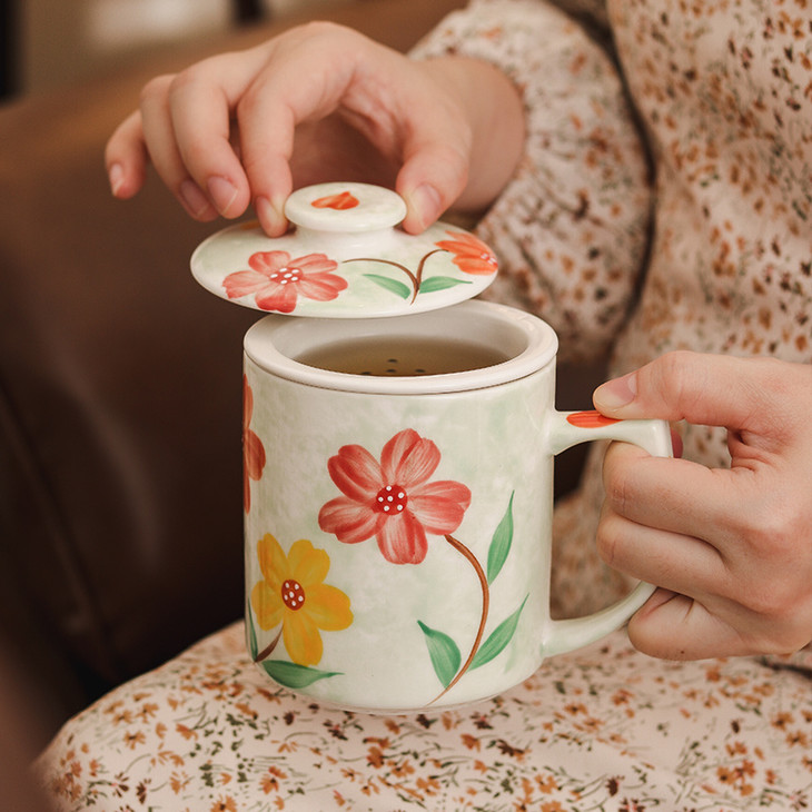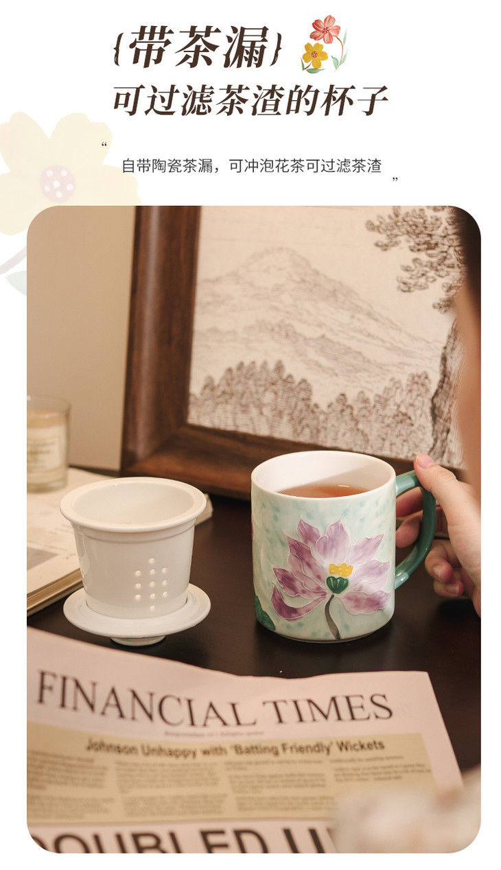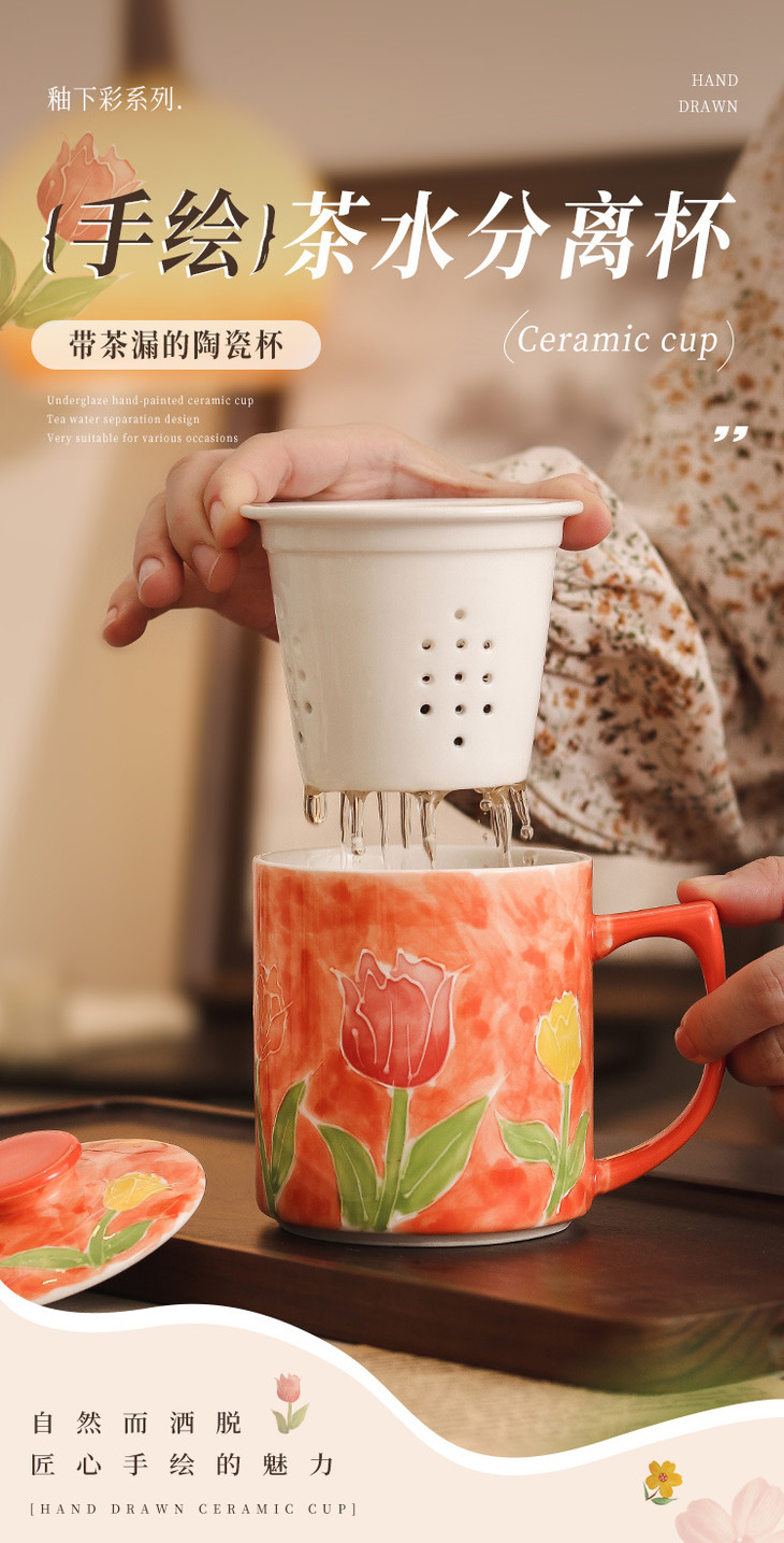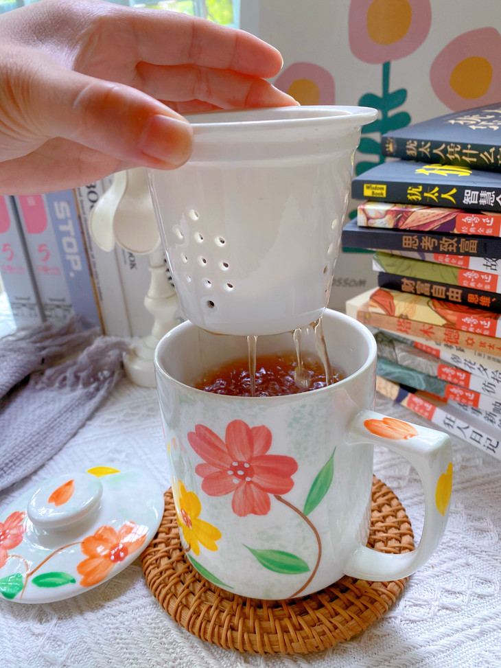 除了美丽的外观,这款茶杯还带有实用的茶隔设计。 对于爱喝茶的妈妈来说,这简直是贴心的礼物。茶隔可以有效地将茶叶与茶水分离,让妈妈在享受茶香的同时,不再为喝到茶叶而烦恼。 无论是泡一杯清香的绿茶,还是浓郁的红茶,都能轻松实现茶水分离,让每一口茶都口感纯正。 想象一下,妈妈在午后的阳光下,坐在摇椅上,品着茶,看着手中这个精致的茶杯,该是多么惬意的一件事。