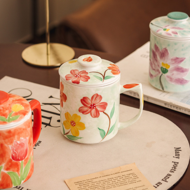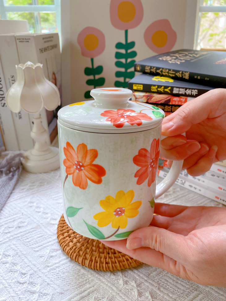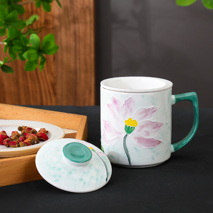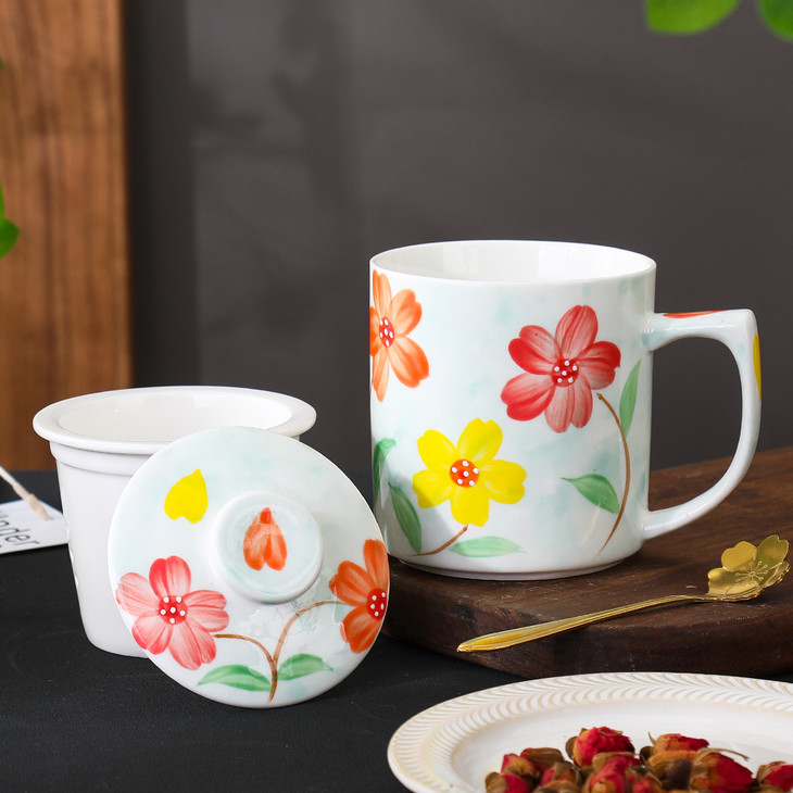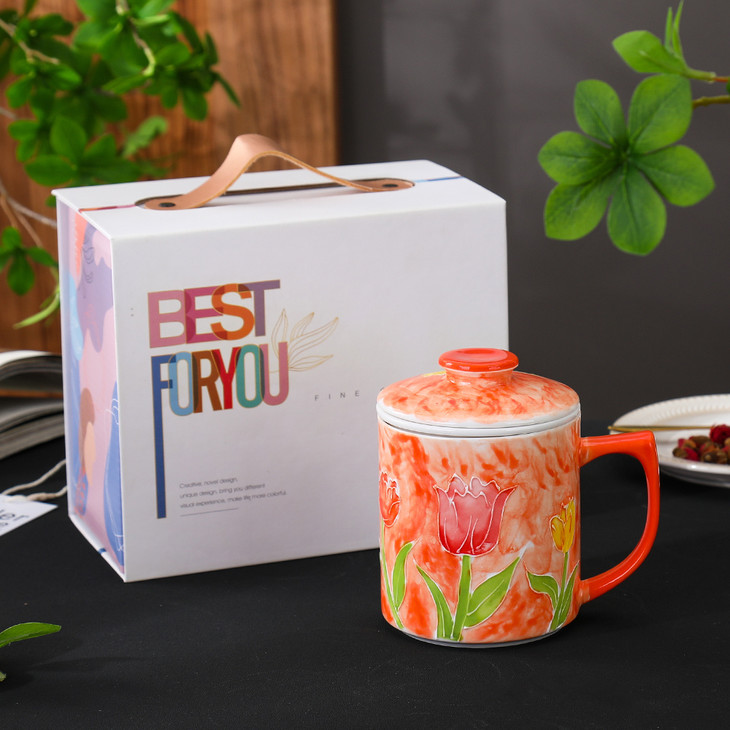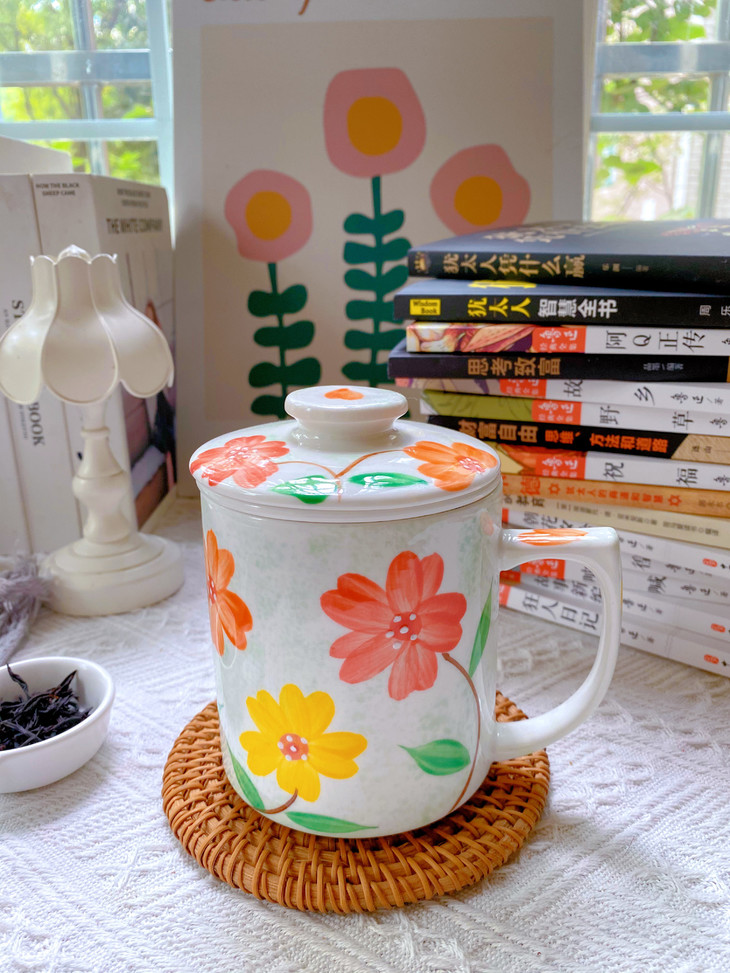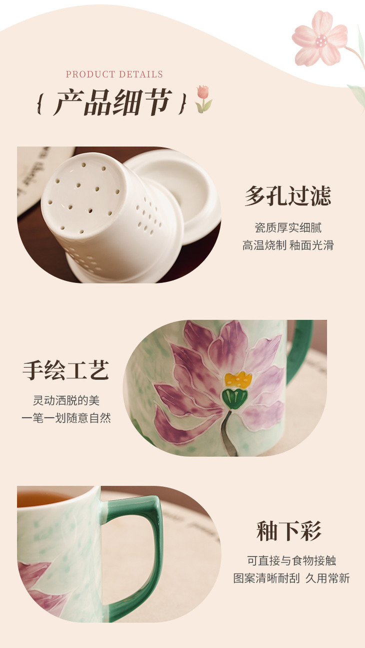 永远相信美好的事情即将发生 满足全部喝水需求的办公杯~~~ 羊脂玉材质细腻,花色清新淡雅 自带过滤内胆,自由控制茶汤浓淡,实现茶水分离。 盖子可以倒扣用来放置过滤,不用担心滴落茶水。 一只高颜值的办公杯,可以提升办公幸福感~~~ 容量400毫升,大口径大容量 满足整天的喝水需求 因为忙起来,真的连倒水的时间都没有~~~ 泡上一杯花茶,咕噜咕噜,一大杯花茶下去,真的太爽了 每天喝水的时候,都会看到这个精美实用的杯子,感受到送礼人满满的心意!!!