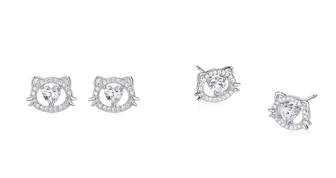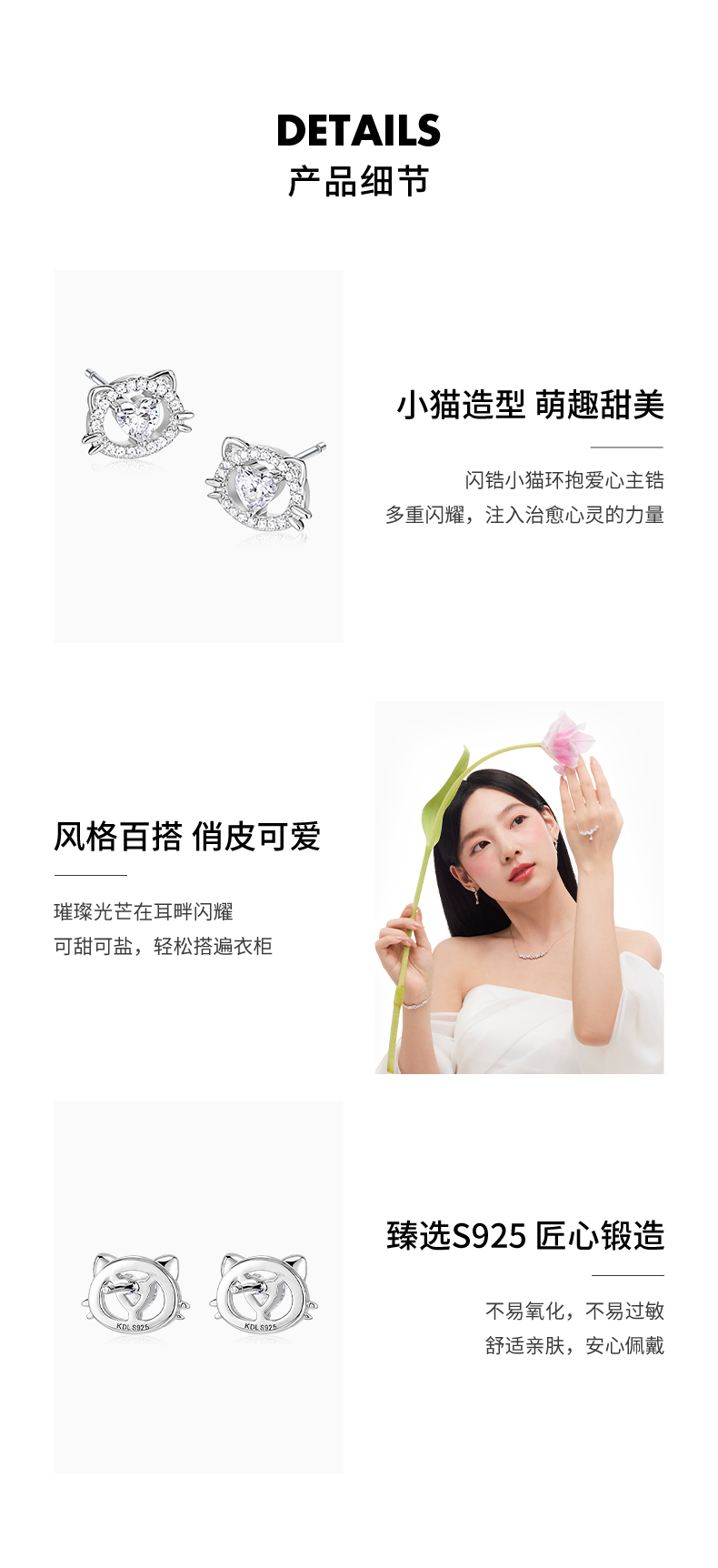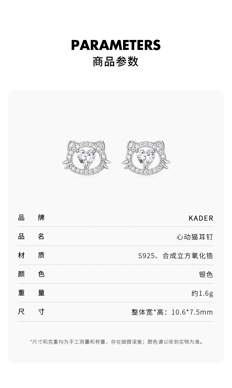卡蒂罗/KADER 心动猫耳钉 轻奢时尚可爱萌趣猫咪造型设计耳饰 甜美灵动经典爱心闪钻配饰养耳洞 925银 送女生女友