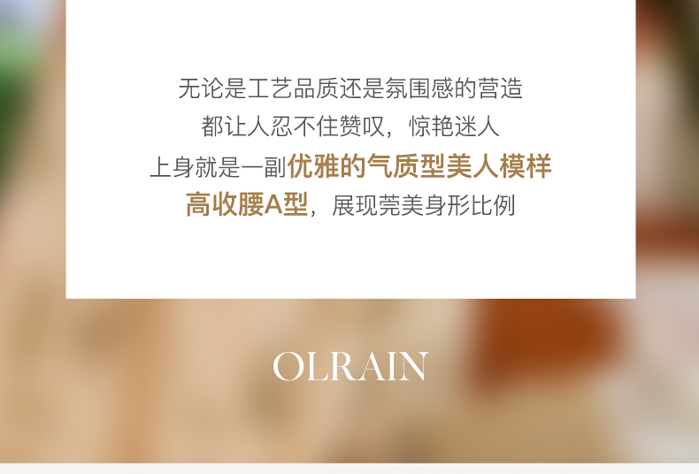 - “精致”是欧芮儿olrain品牌文化的核心,欧芮儿认为,精致的女人,不但要外在动人,更要内在迷人,内外兼修,有魅力、有气质、有内涵,自信而不自傲,优雅而不矫揉,自有万种风情而不轻浮,更不故作矜持。