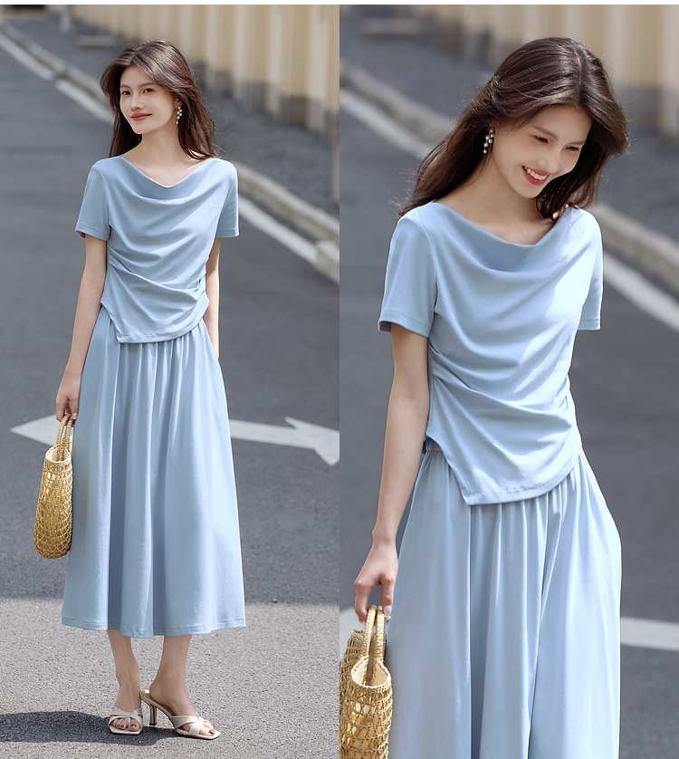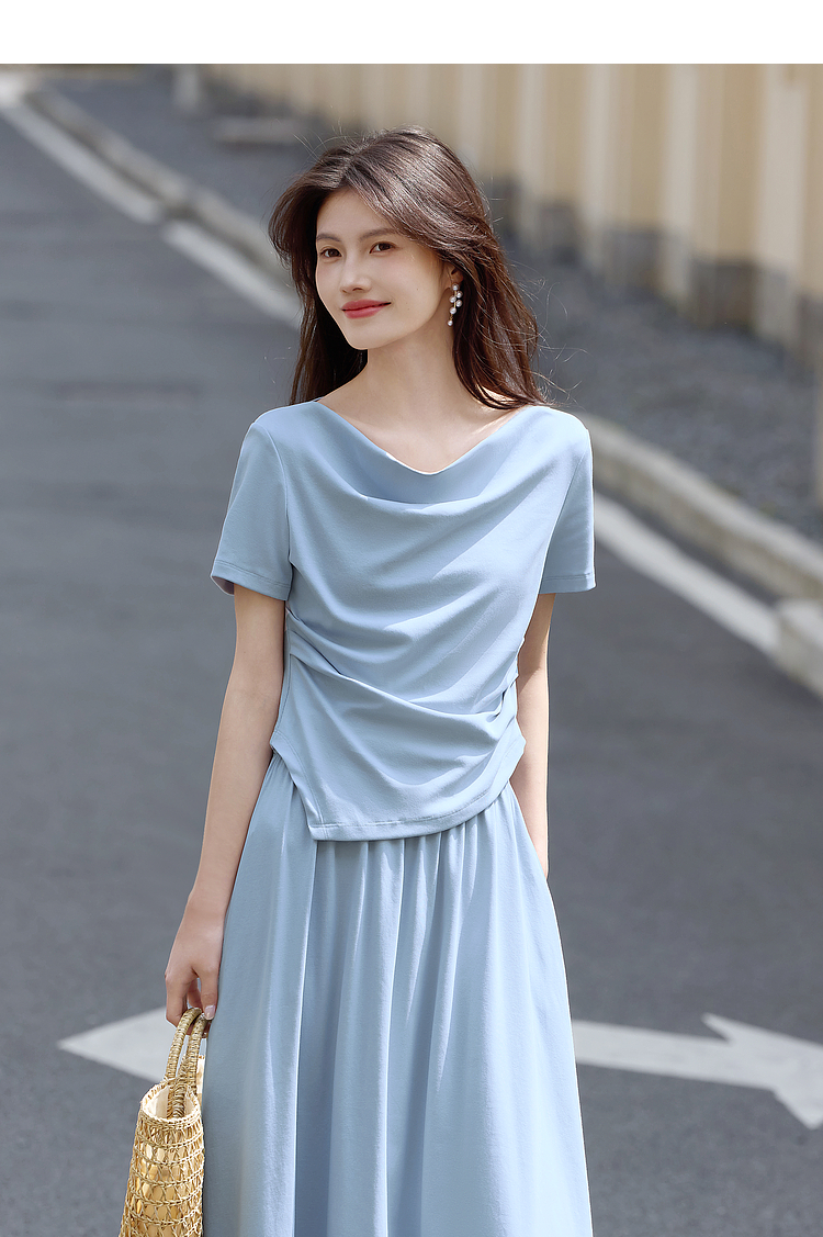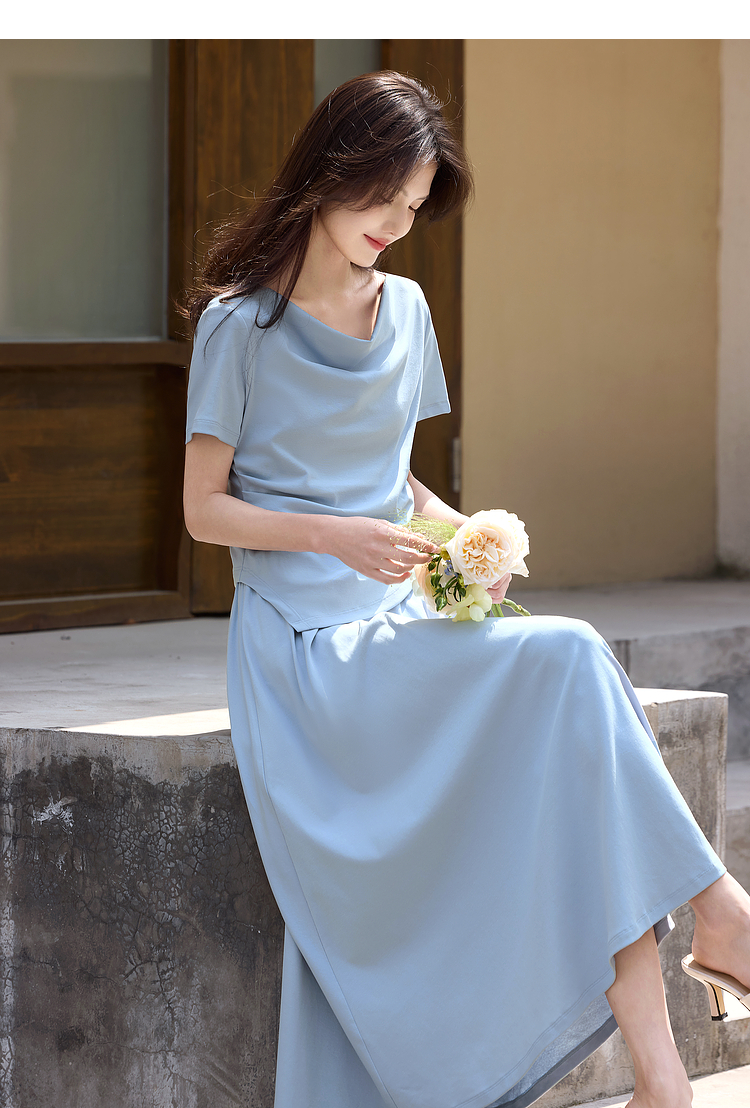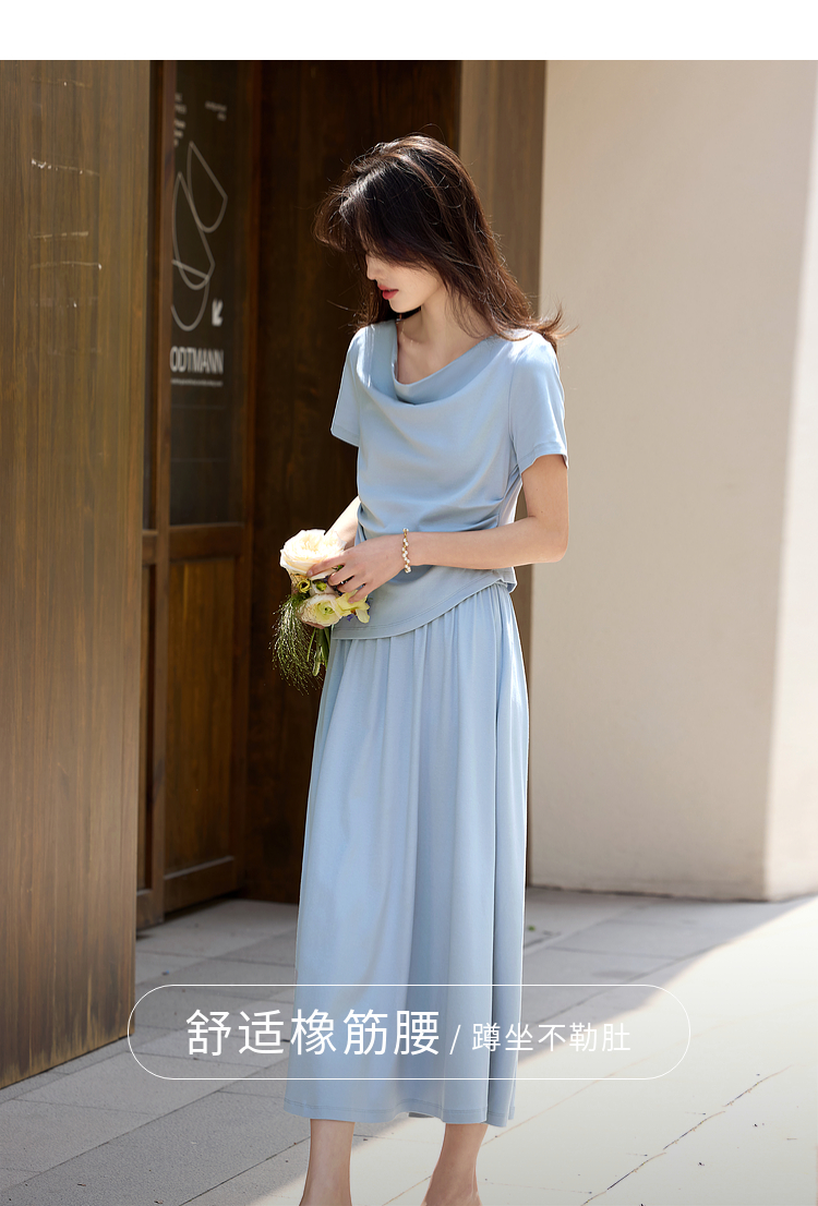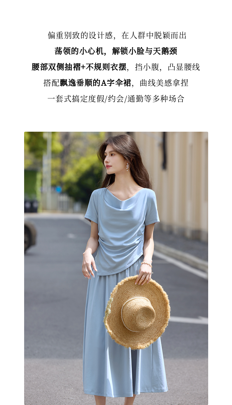 【专属特价】熙世界淡人穿搭气质荡领上衣a字半身裙两件套女夏季时尚减龄套装