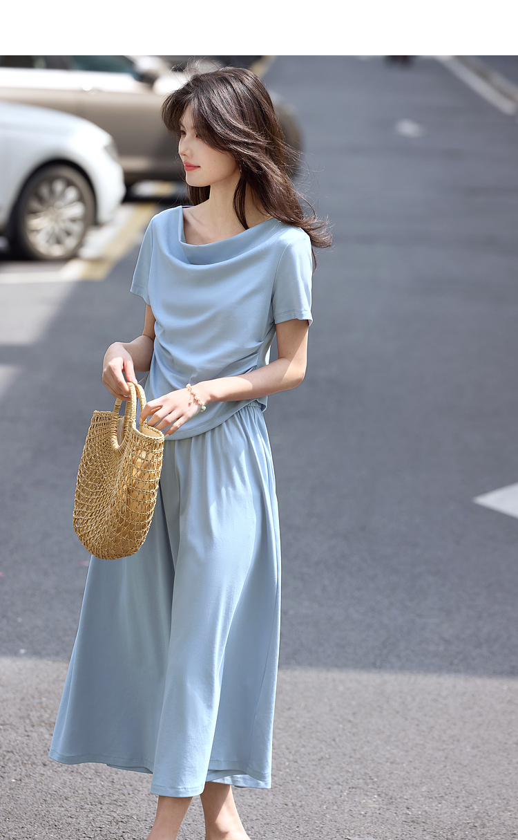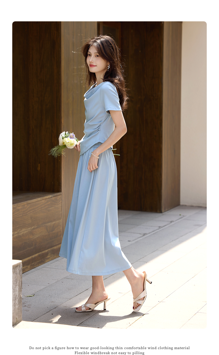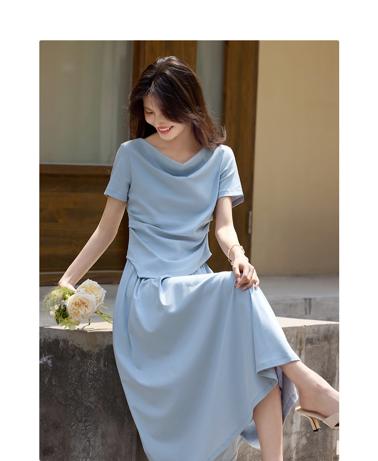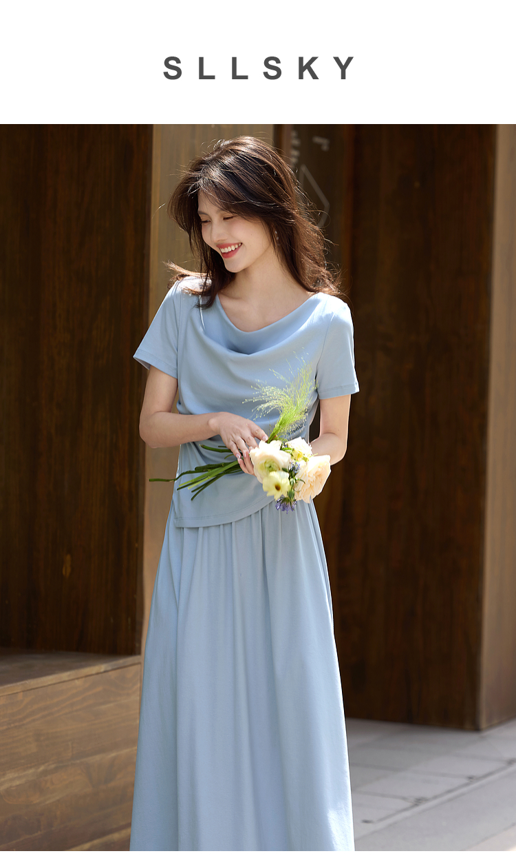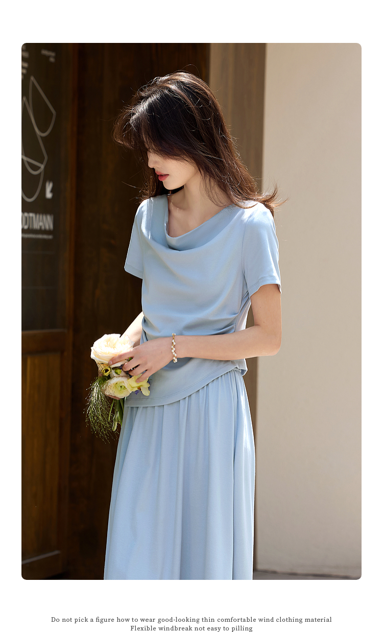 【专属特价】熙世界淡人穿搭气质荡领上衣a字半身裙两件套女夏季时尚减龄套装