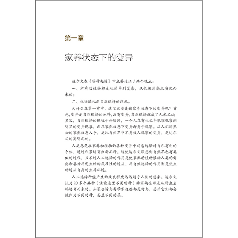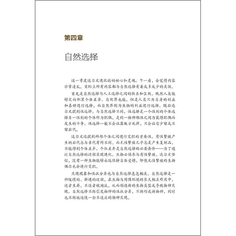 人类只能对外在的可见性状进行选择,而自然界却不在乎外表,除非外表对生物有用。自然界作用于每一个内部器官、每一个体质上的细小差别和整个生物体。人类只为自身利益进行选择,而自然界则只为它所照管的生物进行选择。每一个被选择的性状都会在自然界中得到充分的锻炼。无须惊叹,与人工作品相比,大自然的作品更货真价实,在对极复杂生存环境的适应上亦是完胜。