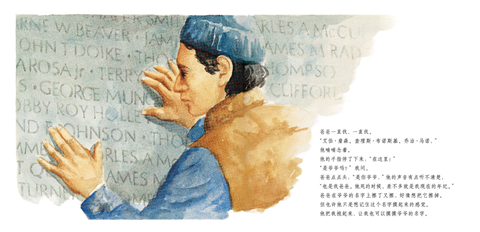编辑推荐位于华盛顿特区的越战纪念墙,上面刻着五万八千个士兵的名字,他们都是在越战中牺牲或失踪的。小男孩和爸爸从很远的地方到这里来,花了很长的时间在墙上寻找爷爷的名字,然后在一张纸上,用铅笔把名字拓下来,郑重地带回家。