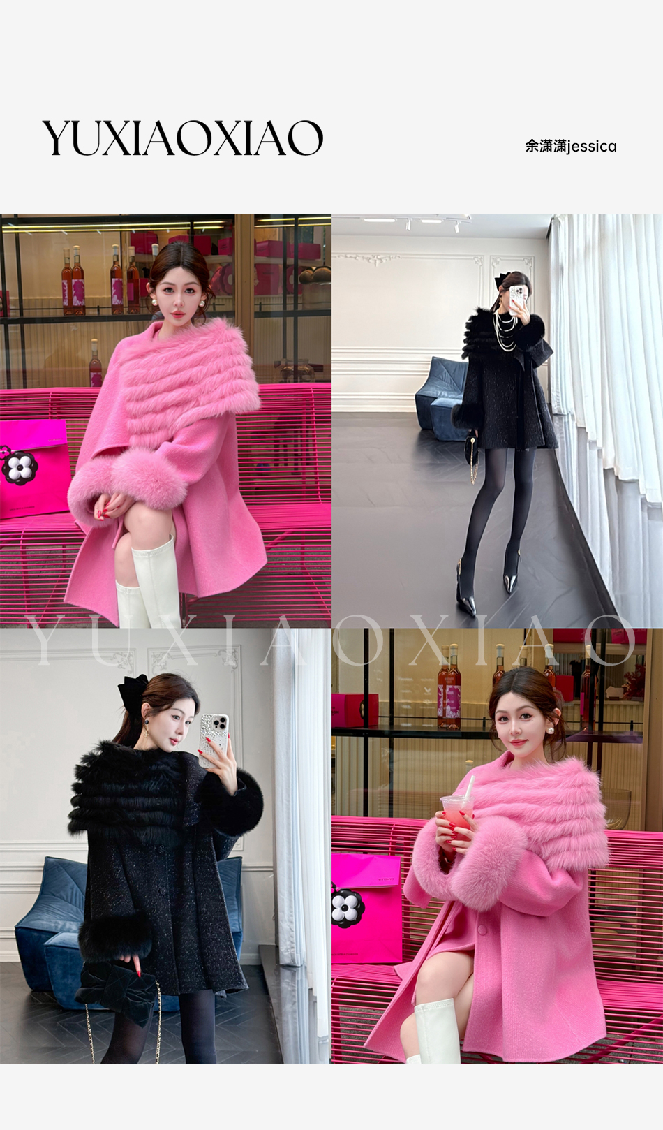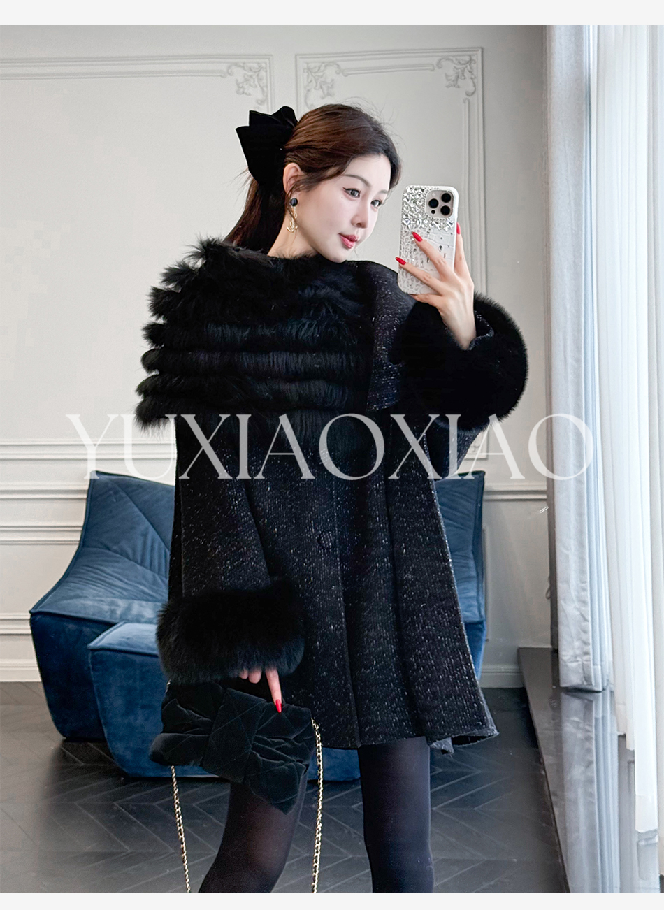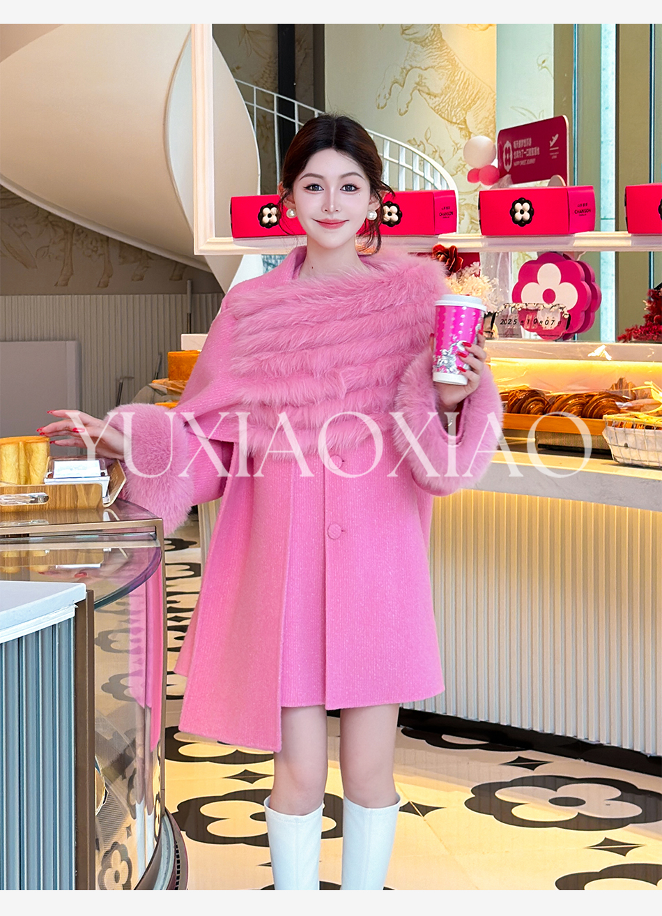 余潇潇【粉黛倾城】羊驼毛绵羊毛肌理感可拆卸狐狸毛披肩袖子大衣