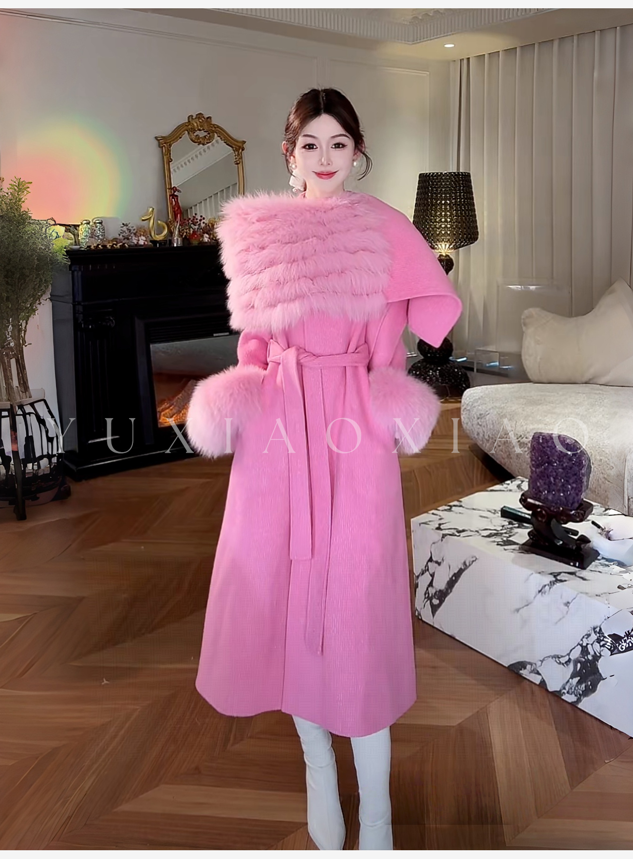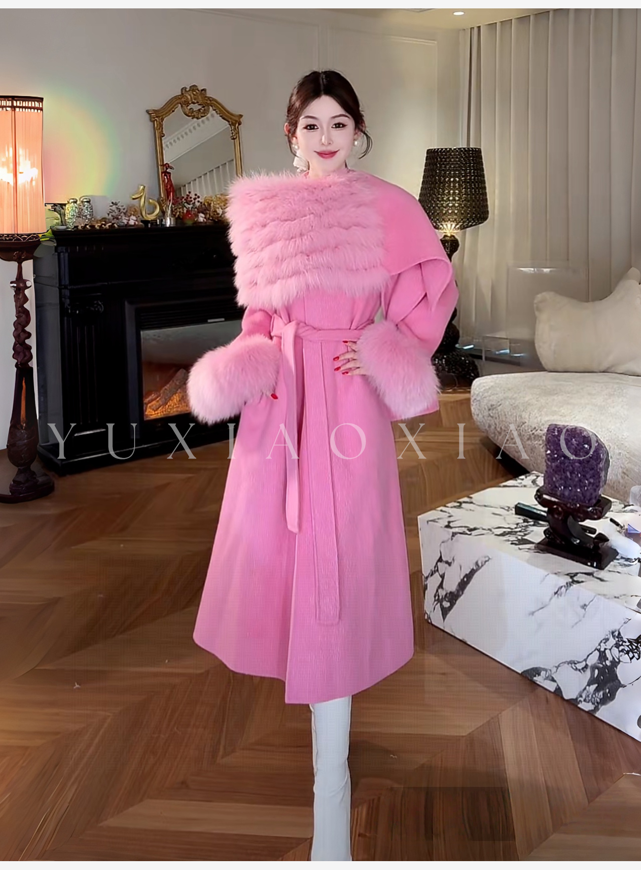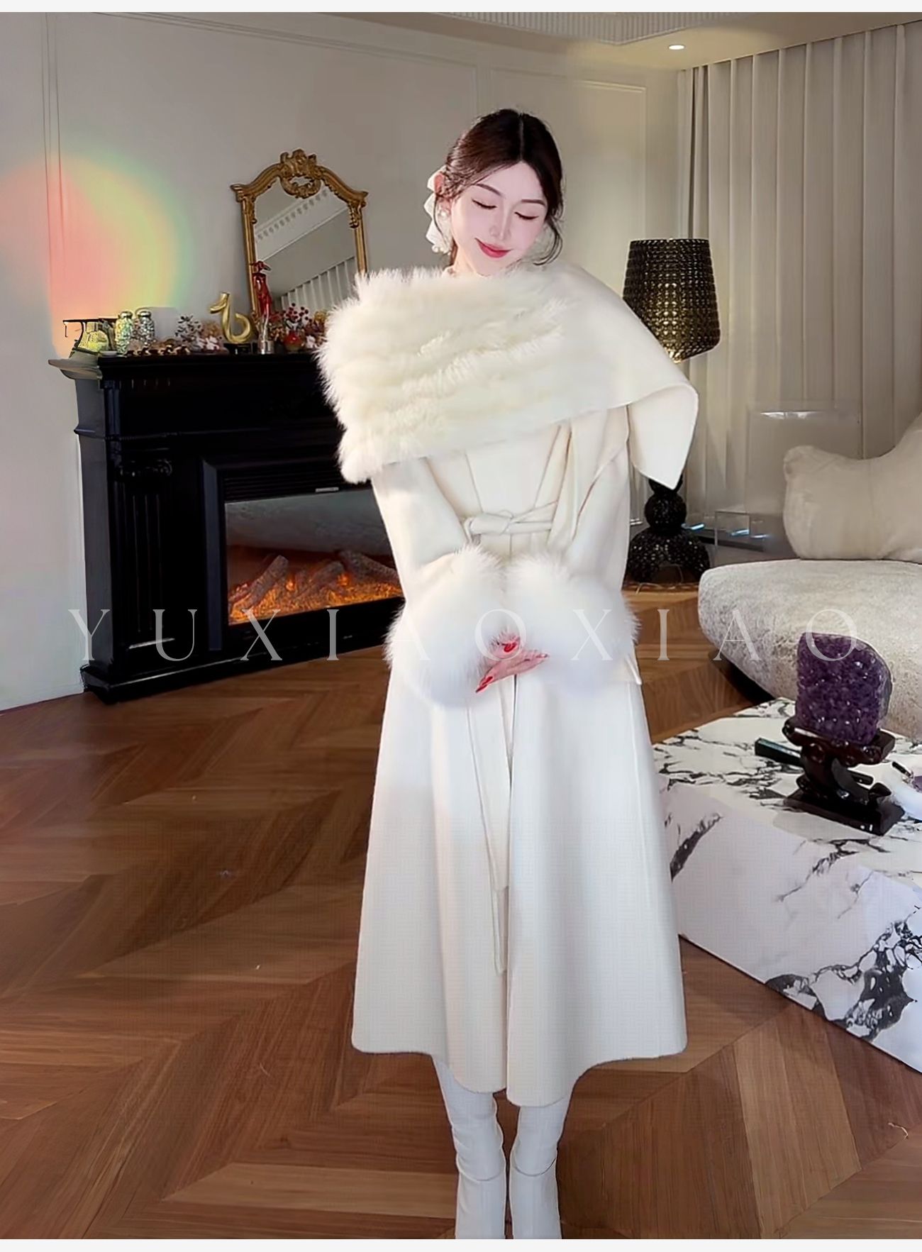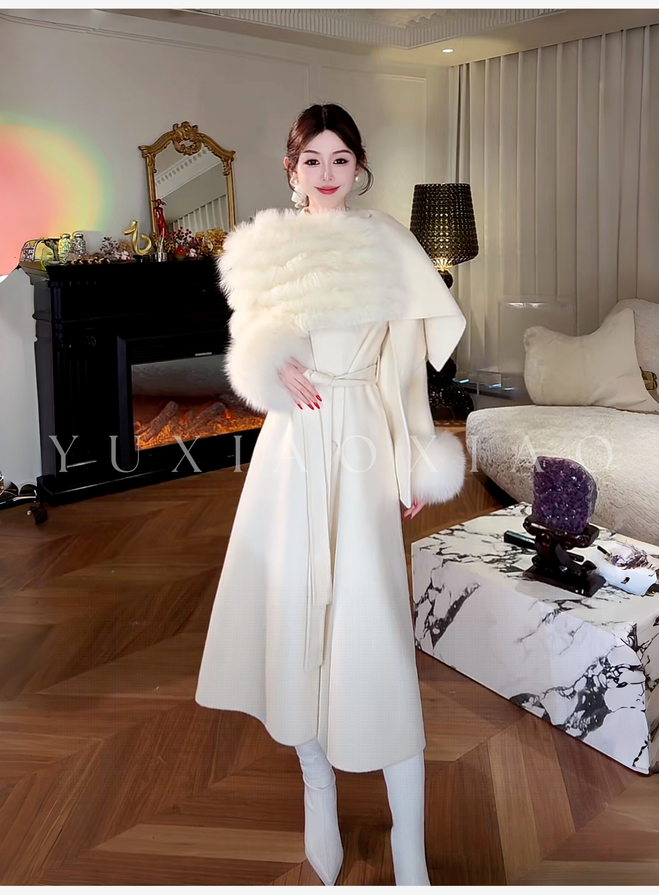 余潇潇【粉黛倾城】羊驼毛绵羊毛肌理感可拆卸狐狸毛披肩袖子大衣 商品图4