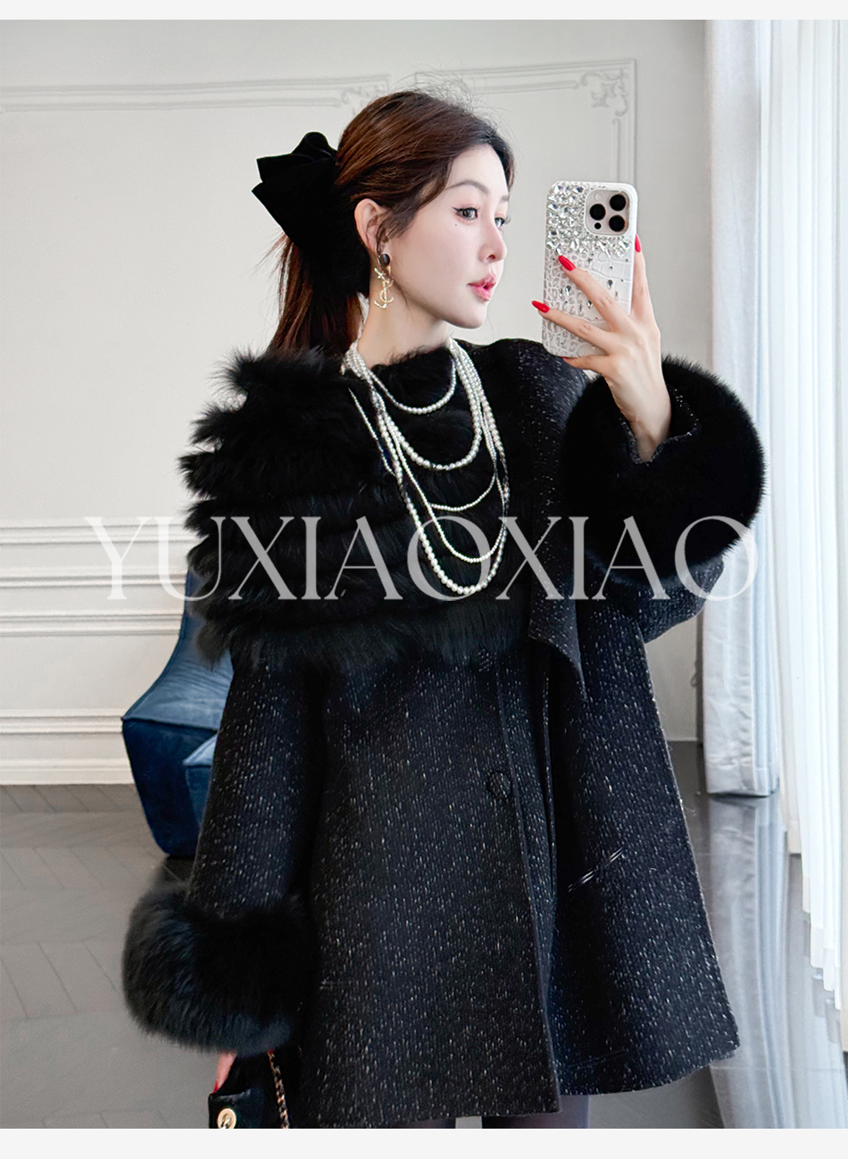 余潇潇【粉黛倾城】羊驼毛绵羊毛肌理感可拆卸狐狸毛披肩袖子大衣 商品图1