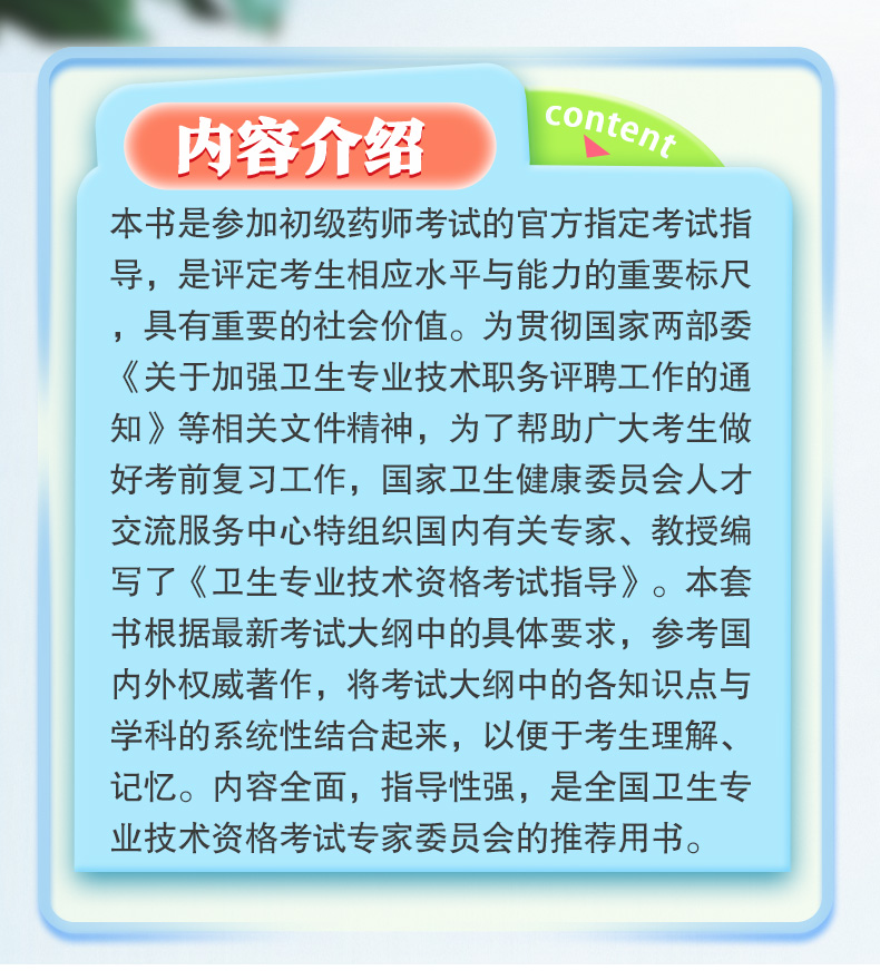 本书是参加初级药师考试的官方指定考试指导,是评定考生相应水平与能力的重要标尺,具有重要的社会价值。为贯彻国家两部委《关于加强卫生专业技术职务评聘工作的通知》等相关文件精神,为了帮助广大考生做好考前复习工作,国家卫生健康委员会人才交流服务中心特组织国内有关专家、教授编写了《卫生专业技术资格考试指导》。本套书根据最新考试大纲中的具体要求,参考国内外权威著作,将考试大纲中的各知识点与学科的系统性结合起来,以便于考生理解、记忆。内容全面,指导性强,是全国卫生专业技术资格考试专家委员会的推荐用书。