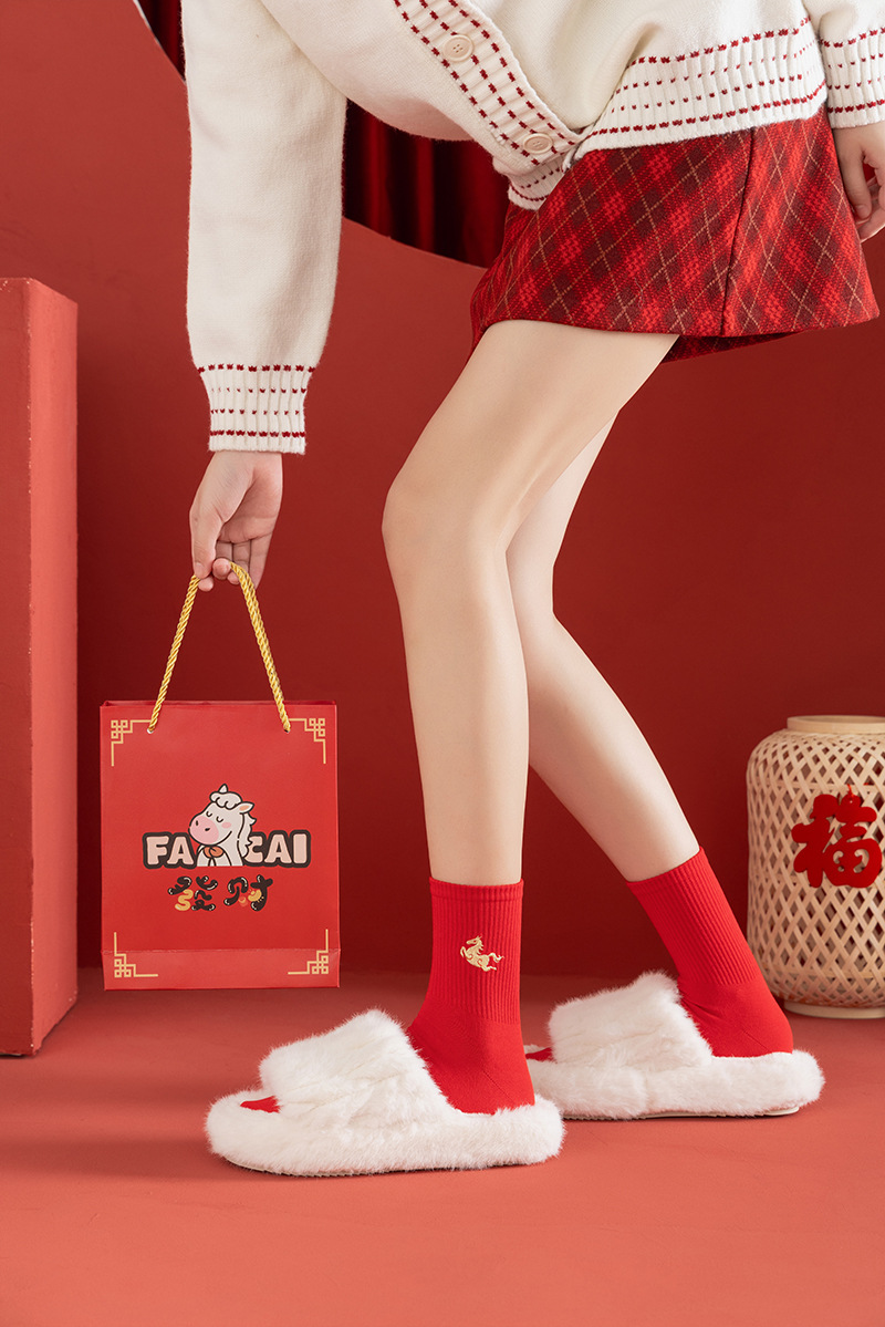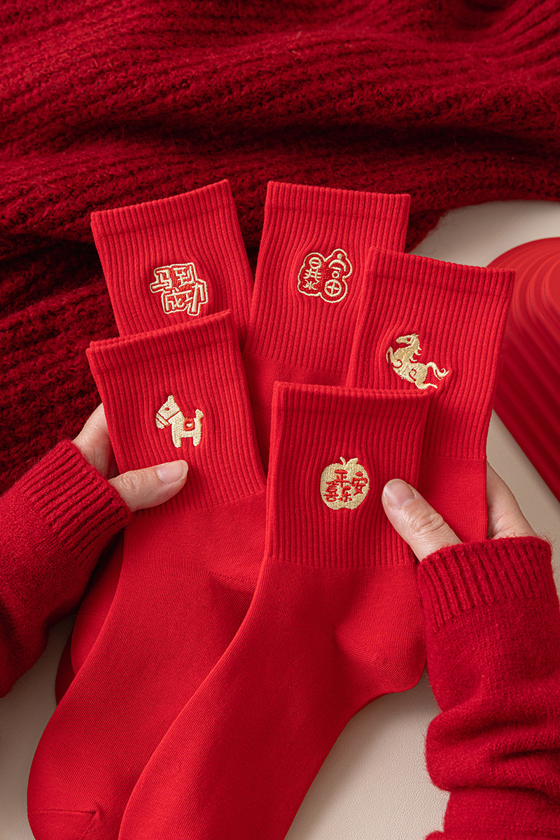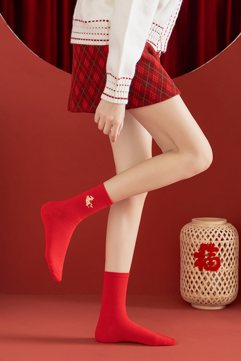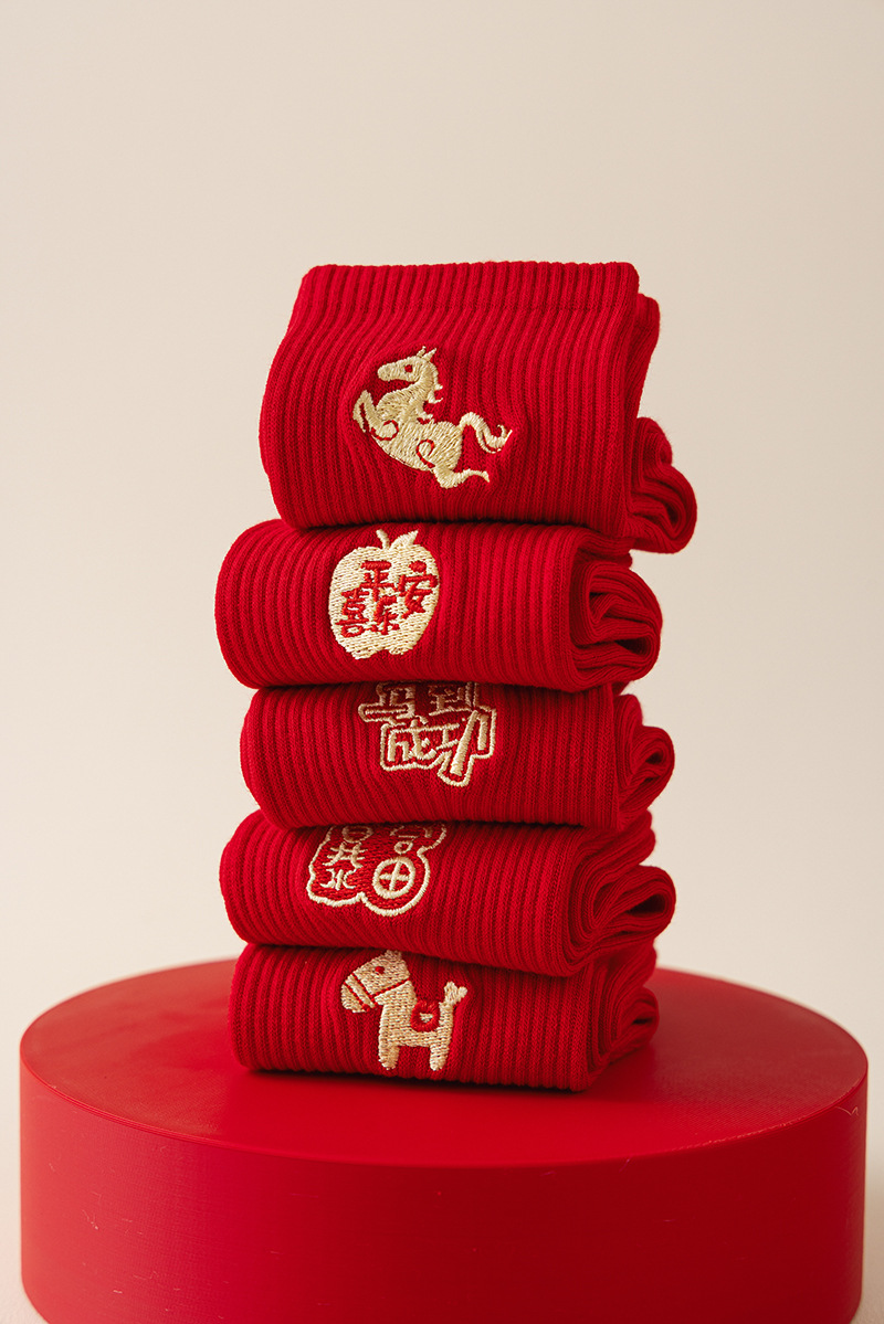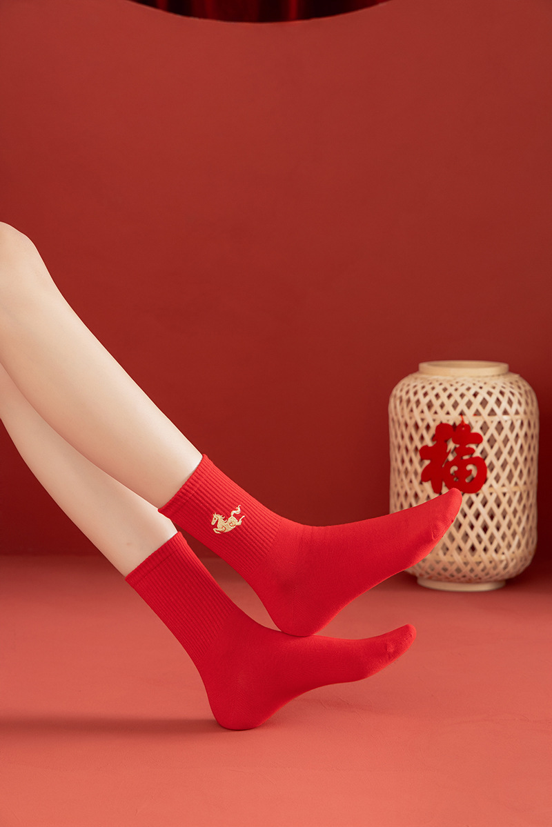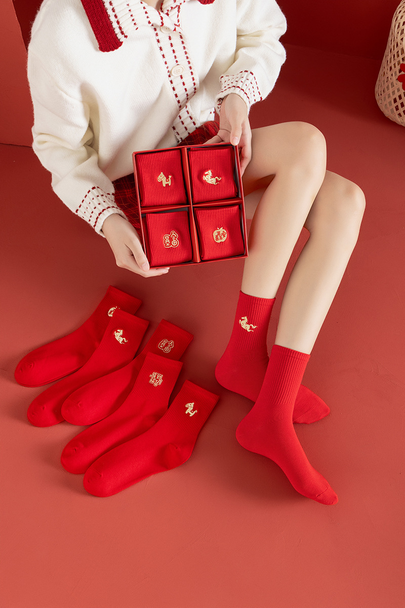 【本命年鸿运袜❗️精美礼盒装】2026马年新年大红袜子本命年红色袜子礼盒刺绣高橡筋中筒棉袜礼物。jc