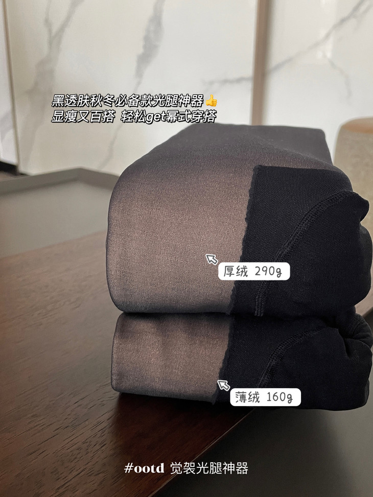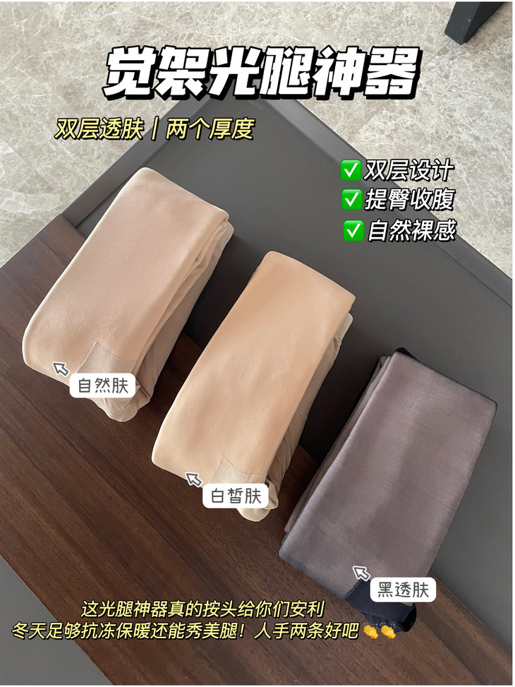 我不允许还有姐妹不知道这光腿神器🤩🤩 今年觉袈【光腿神器】让你一秒变女神💃 今年醉好穿的光腿神器,没有之一! ✅双层加绒 不显臃肿 ✅柔软保暖 不冻腿 ✅弹力巨好 舒适不紧绷 面料细腻,上腿完全没有裂痕 肉眼看又光滑又自然,不反光不假白 如同粉底液一样修饰腿部肌肤,自然程度绝绝子 做工上面就甩普通光腿神器好几条街!! 觉袈好品质每年都能给人带来惊喜🤩
