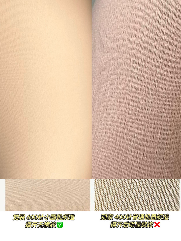 市面上普通的光腿神器和觉袈的比起来 觉袈依然能看到细腻的肌理,而普通的光腿神器纹理粗糙像树皮 这都是由于觉袈用了一种专门用来生产无接缝内衣或特殊面料的小圆机来制作 针数更密实更细腻 更逼真 相对的厚度增加 再冷一下也能抗住!!