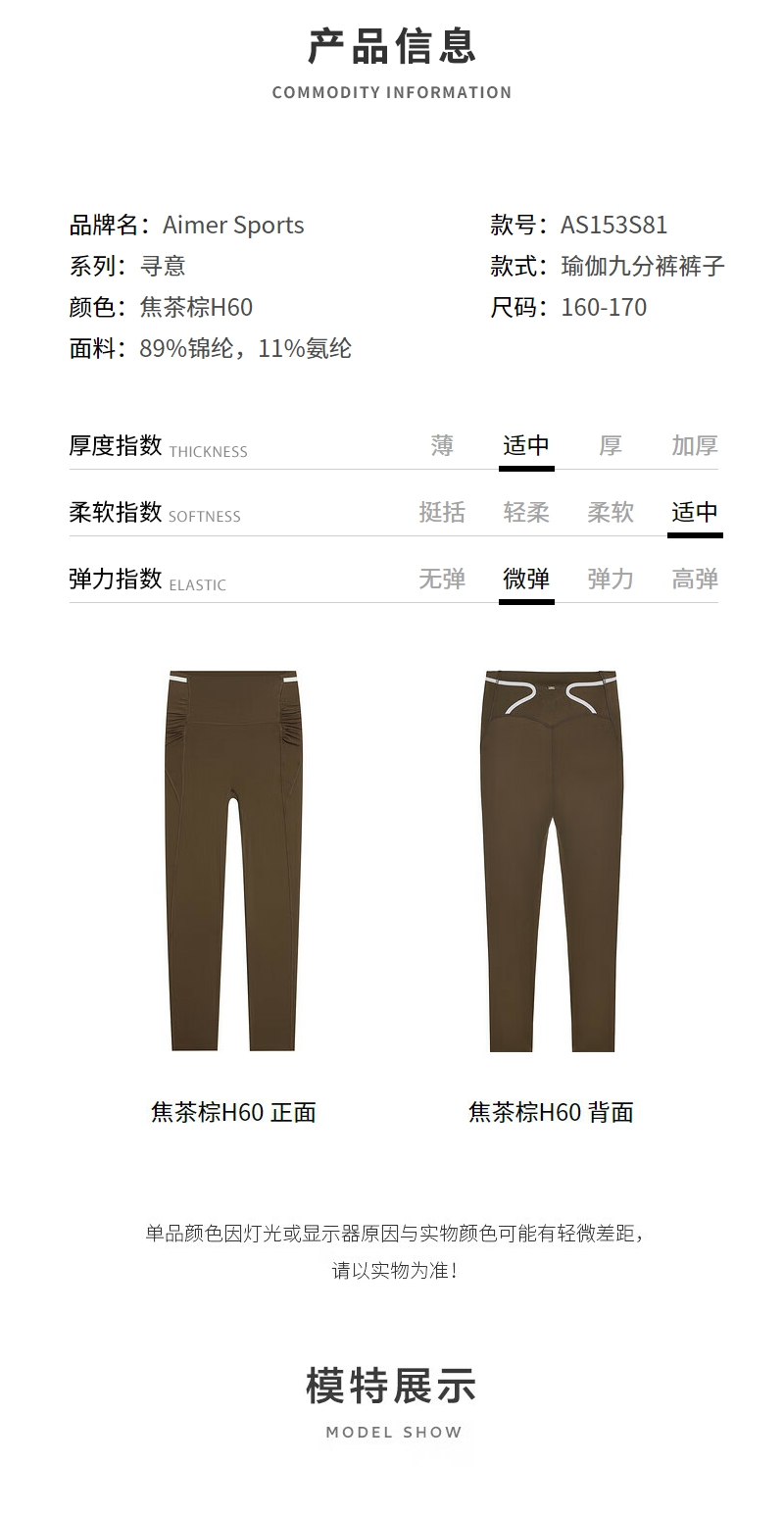 【直发】爱慕运动瑜伽裤女士寻意瑜伽九分裤legging鲨鱼裤AS153S81 焦茶棕H60 170