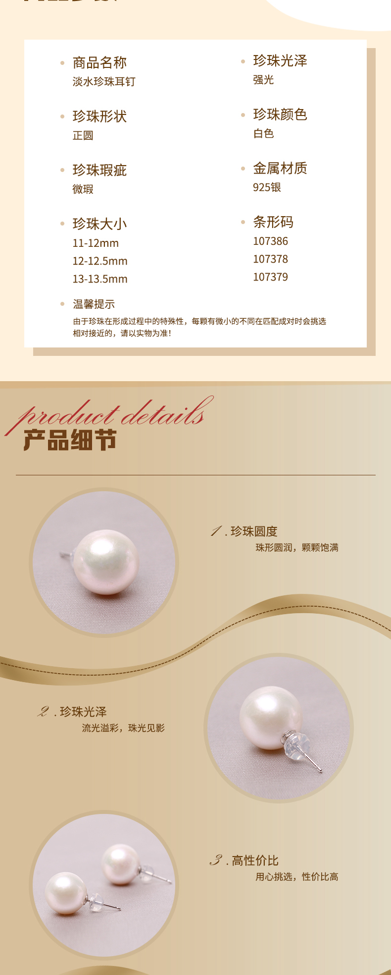 银925淡水珍珠耳钉11-13.5mm 107378 107386 107379