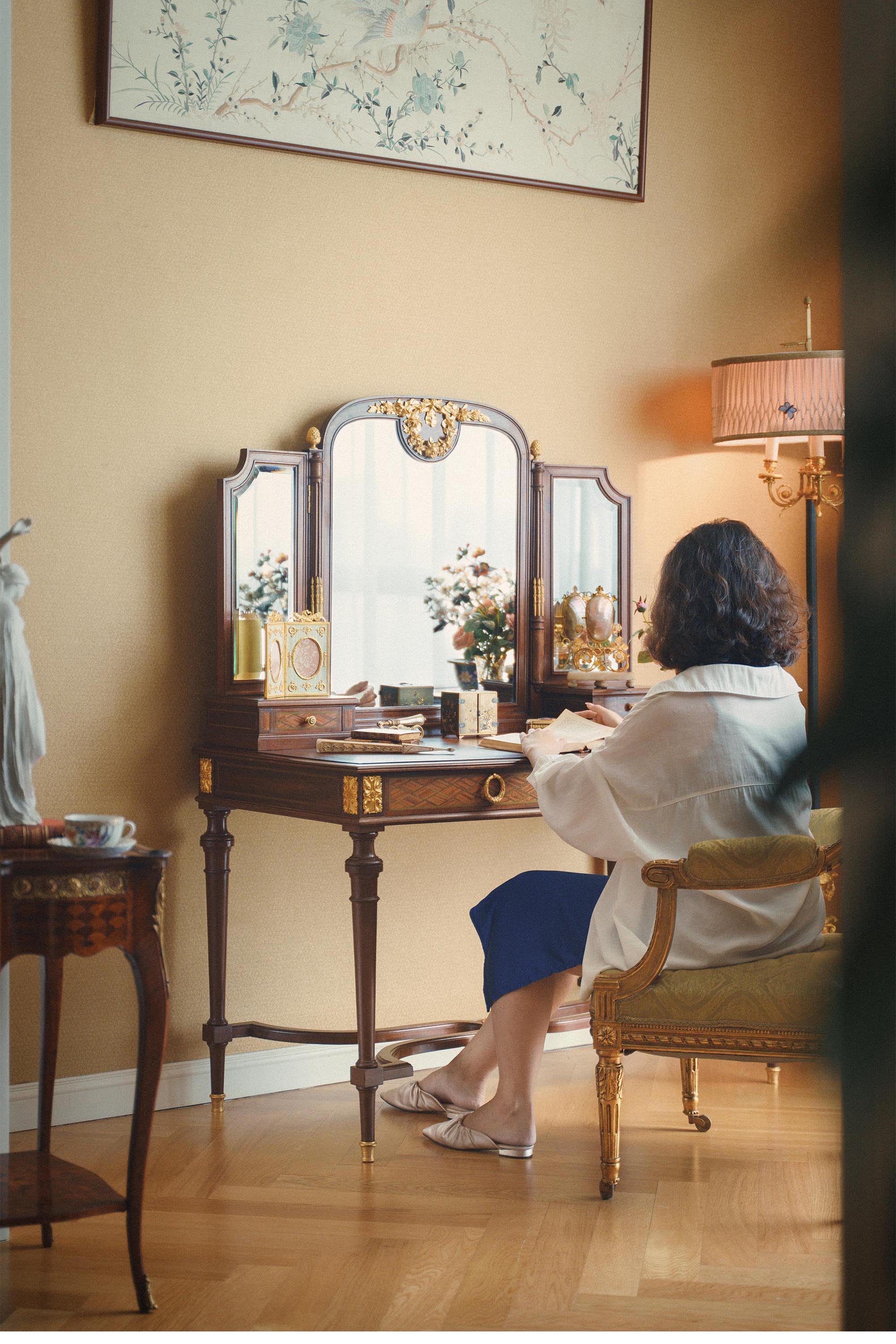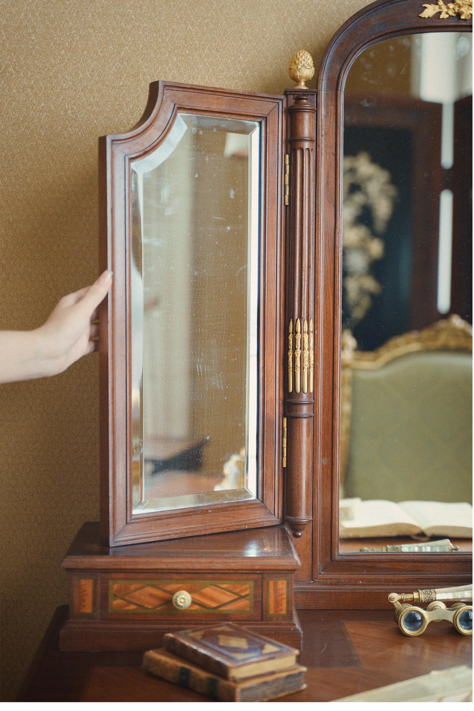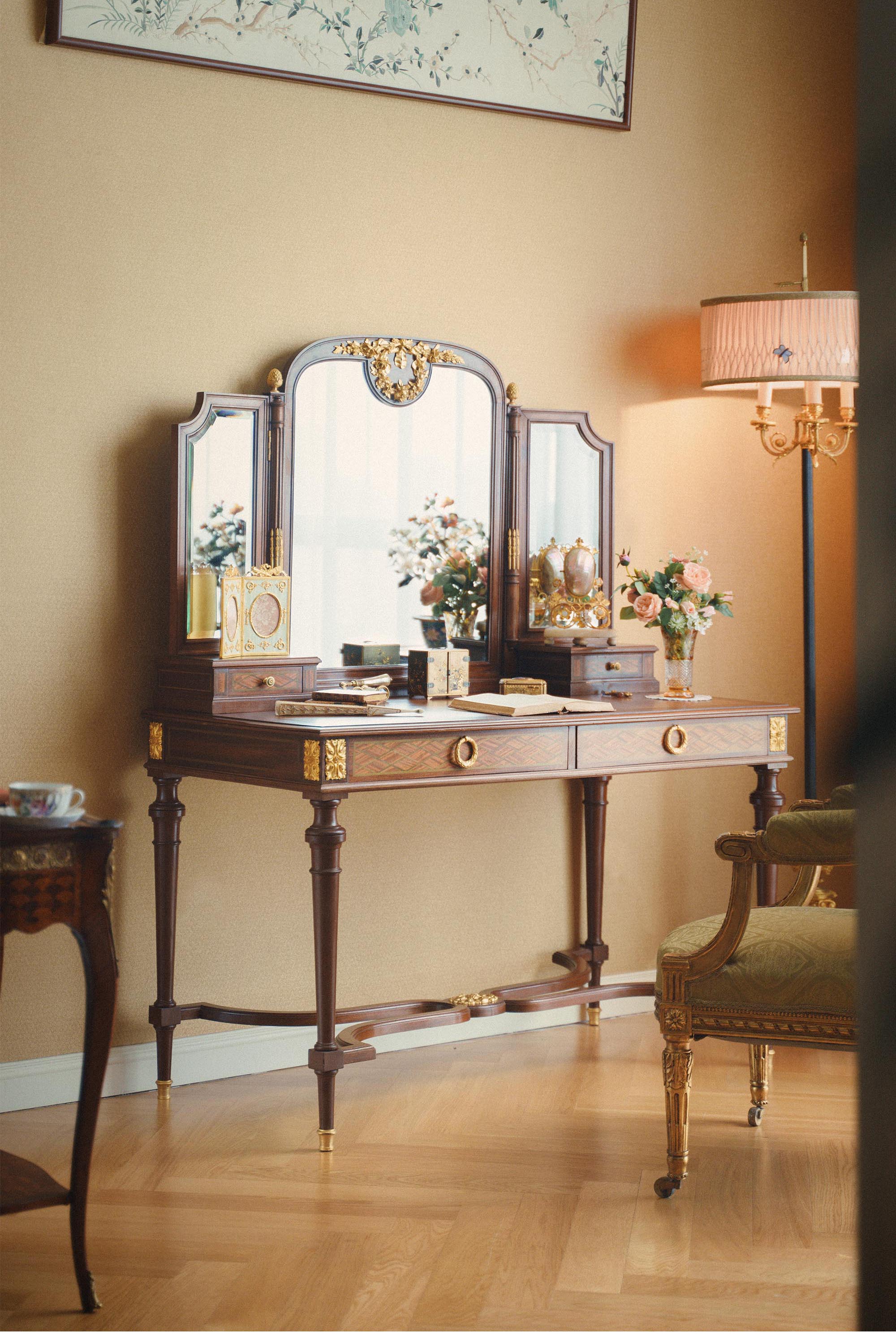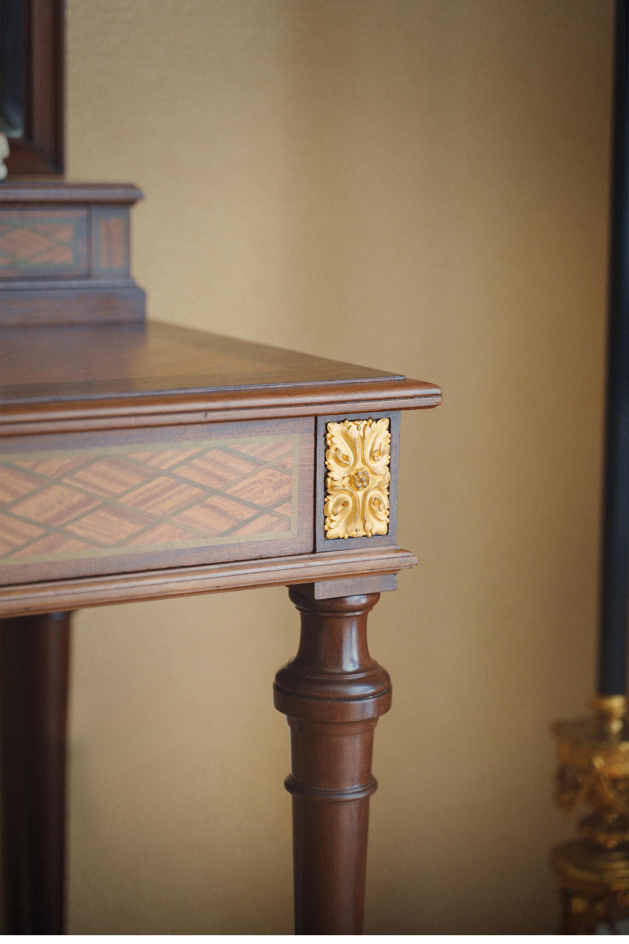 19世纪末法国出品路易十六风格铜鎏金精雕花环装饰细木镶嵌梳妆台