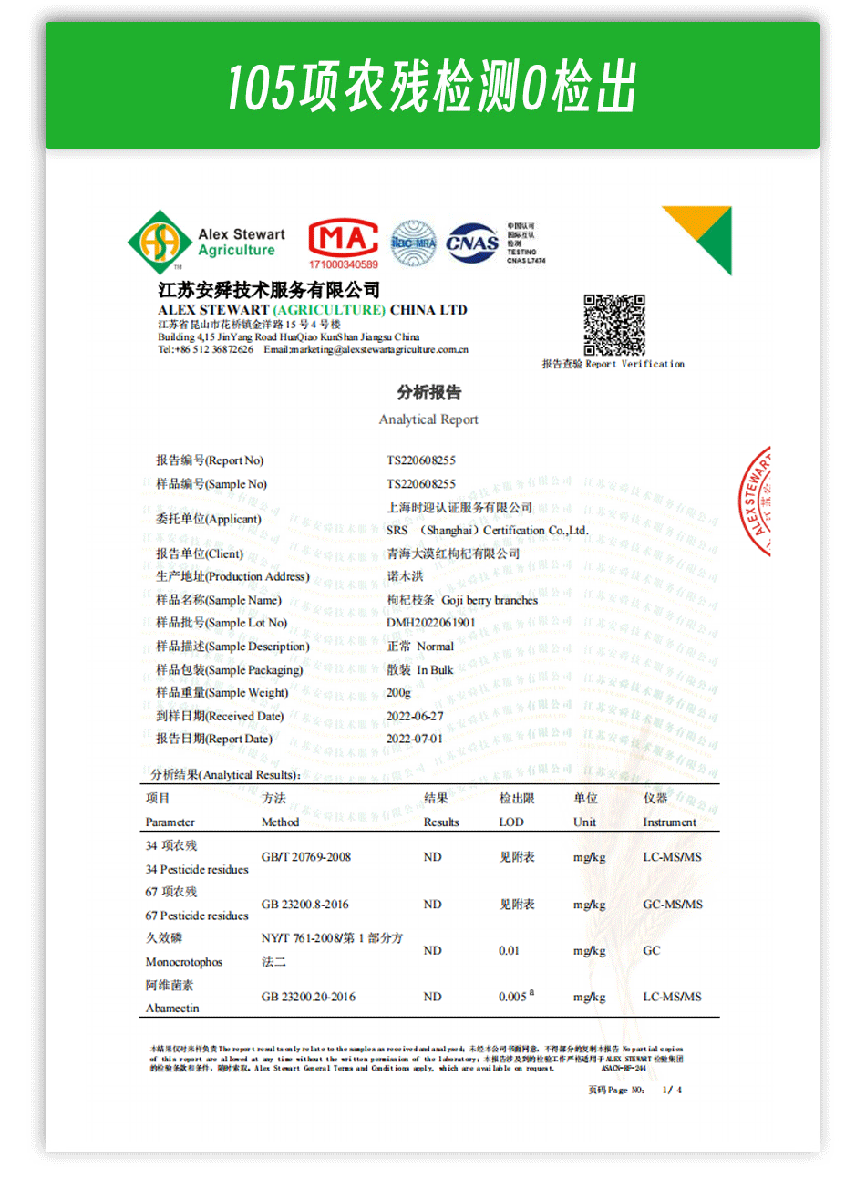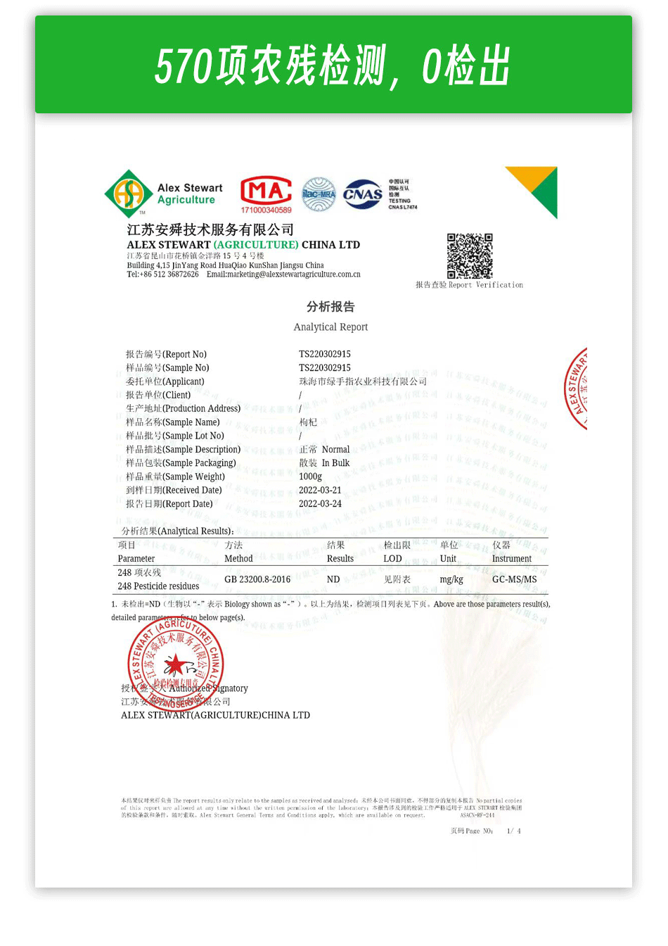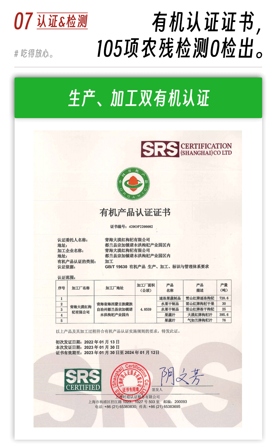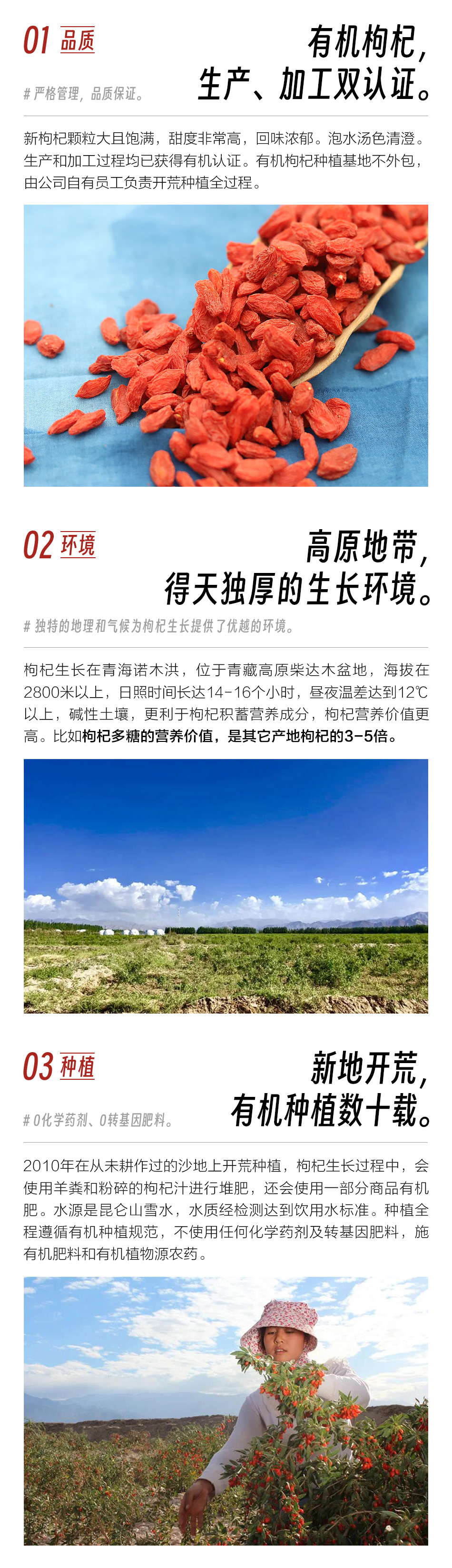 【净含量】250g 【原料】有机鲜枸杞 【产品种类】低温干燥枸杞 【产地】青海省柴达木盆地 【贮存条件】请置于阴凉、干燥、通风良好处保存 【生产日期】见包装 【执行标准】GB/T18672-2014 【生产方式】2010年开始在未耕作的沙地上按照有机方式种植构杞,施用有机肥,使用有机允许的植物源药剂防治病虫害、石硫合剂清园,人工除草。低温烘干,不使用二氧化硫、亚硫酸钠等防腐剂。 【生产许可证】SC10663282201139 【生产商】青海大漠红枸杞有限公司 【产地】青海省柴达木(国家级)循环经济试验区都兰县诺木洪枸杞产业园 【保质期】密封18个月,开封后请尽快食用 【食用禁忌】 1、外邪实热,脾虚有湿及泄泻者不建议食用枸杞。 2、由于枸杞温热身体的效果相当强,正在感冒发热、身体有炎症的人不建议食用枸杞。 3、患有高血压病、性情太过急躁的人,或平日大量摄取肉类导致面泛红光的人不建议食用枸杞。 4、虚寒的人服用会有滑脱泄泻之弊,有内热未清者慎用。