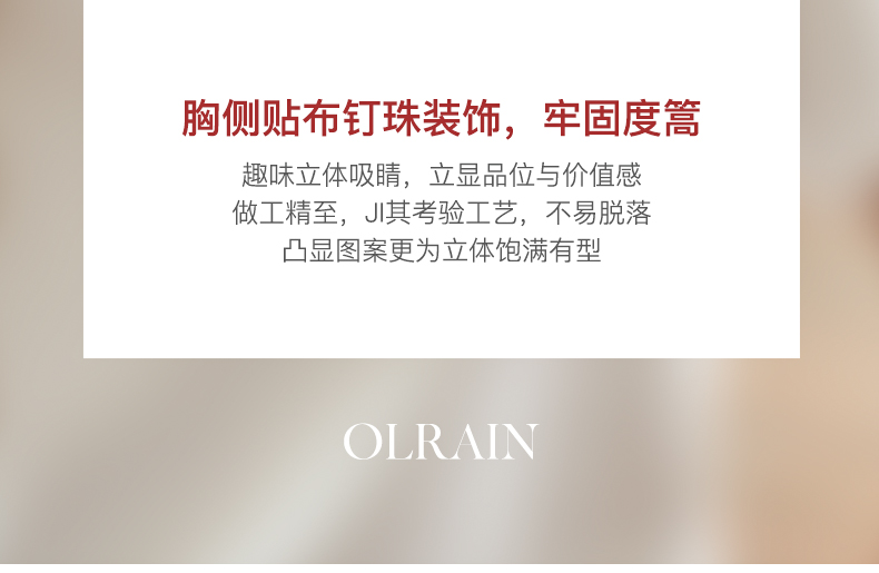 - “精致”是欧芮儿olrain品牌文化的核心,欧芮儿认为,精致的女人,不但要外在动人,更要内在迷人,内外兼修,有魅力、有气质、有内涵,自信而不自傲,优雅而不矫揉,自有万种风情而不轻浮,更不故作矜持。