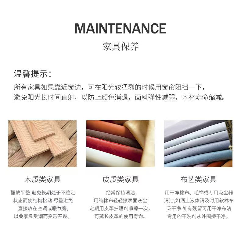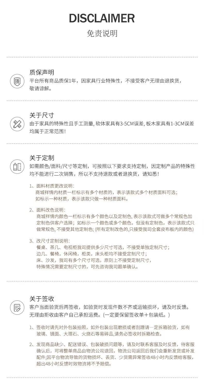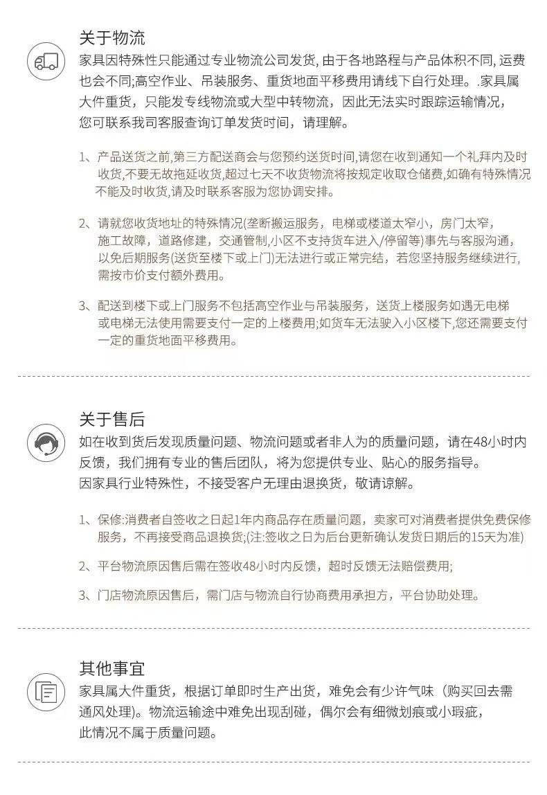 所有家具为下单后排产制作,生产启动后非质量问题不支持退换货,敬请谅解。