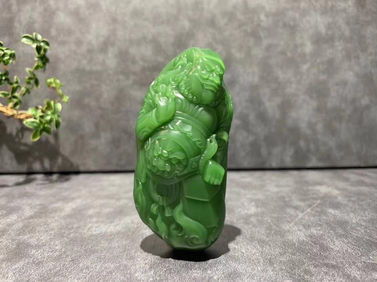 这款作品选自俄罗斯7号坑冰底碧玉老料,颜色为罕见的鲜艳果绿色,玉质温润细腻,通体冰底起荧光,过灯无结构。其设计精妙,雕工精细,细节刻画栩栩如生。这一切,构成了这款收藏传家级的作品。