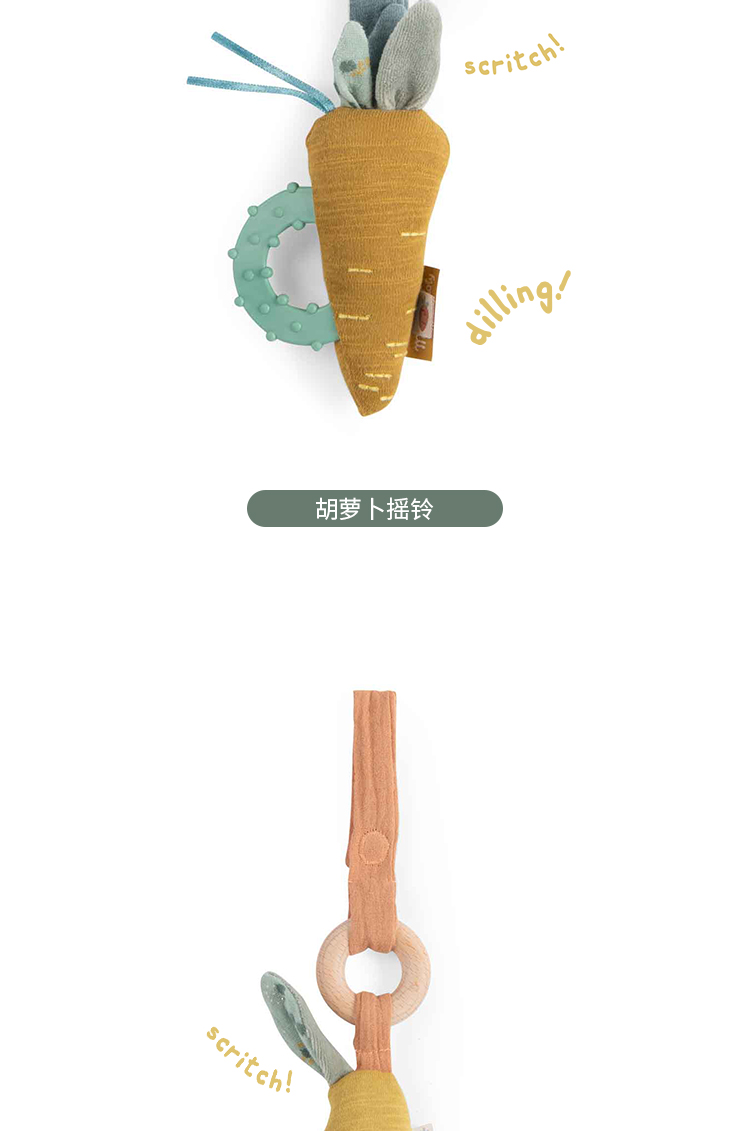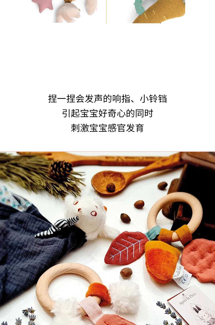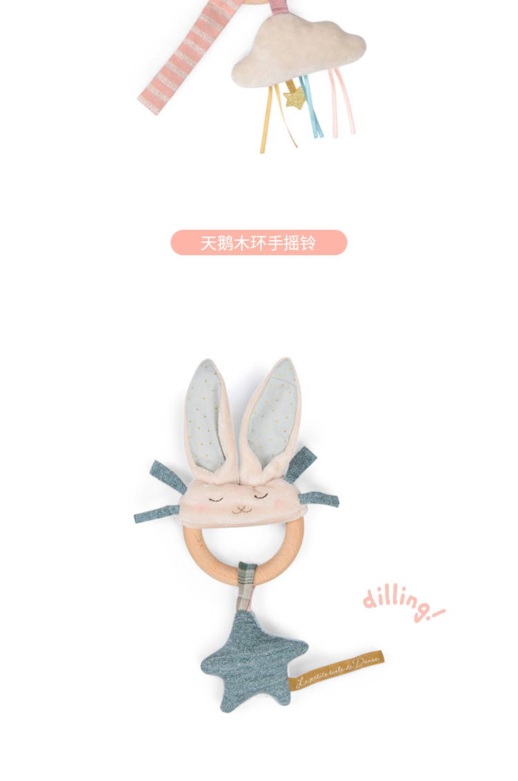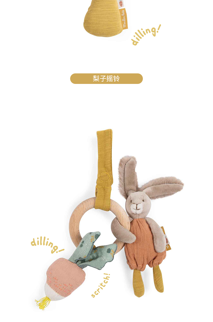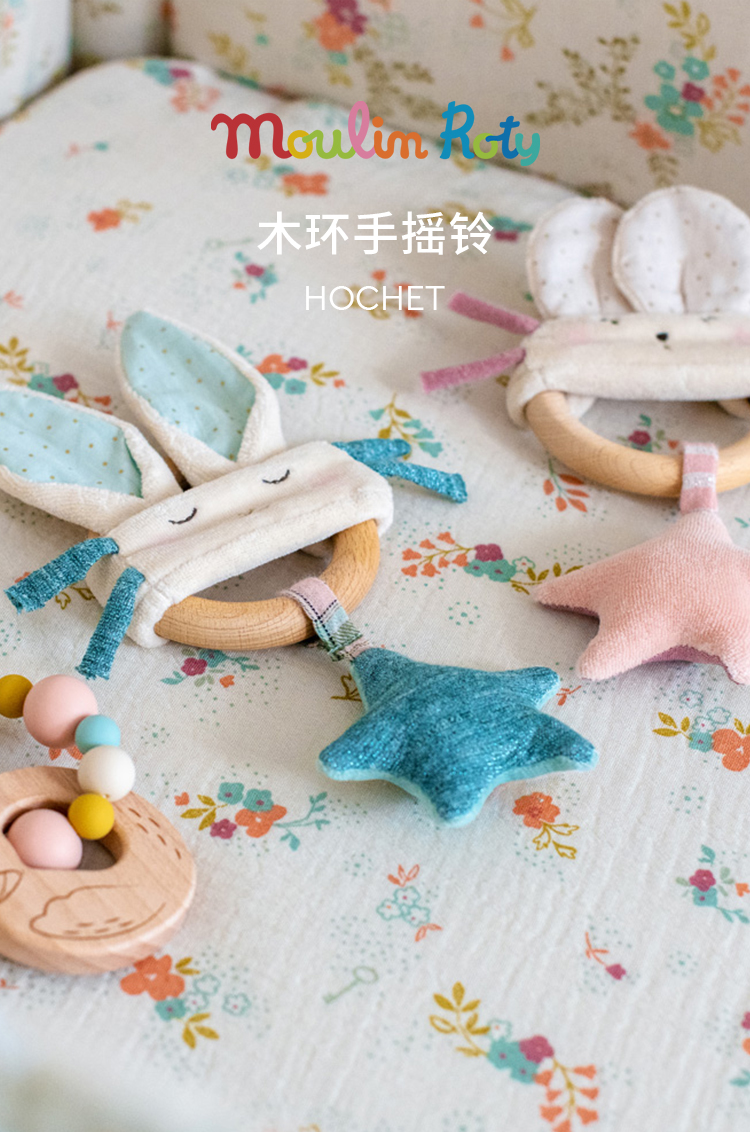 Moulin Roty 橘黄兔木环 手摇铃 适合0岁+ 可悬挂 三只邦尼兔系列 法国品牌-678009