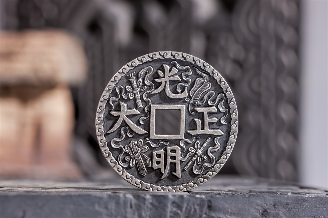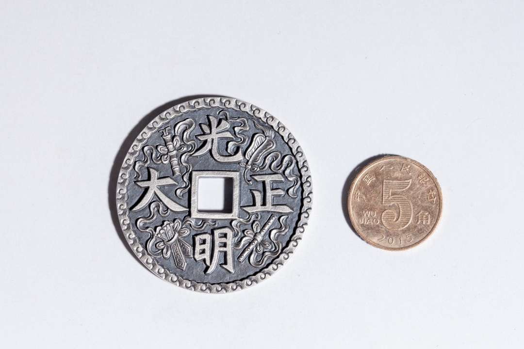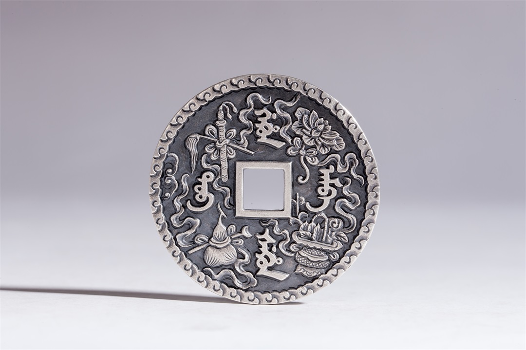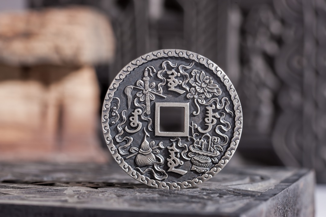 金币穿孔处錾有十二地支,对应金币两面满汉十二句祈福吉语,分别为“子-天下太平、丑-长治久安、寅-政通人和、卯-和风甘雨、辰-国泰民安、巳-光明正大、午-受天之祐、未-福祚绵长、申-寿富康宁、酉-吉祥安康、戌-紫气东来、亥-万寿无疆”,并配有“宝剑、葫芦、荷花、阴阳玉板、渔鼓、花篮、横笛,芭蕉扇”八个“暗八仙”图案,雕工很是精湛。