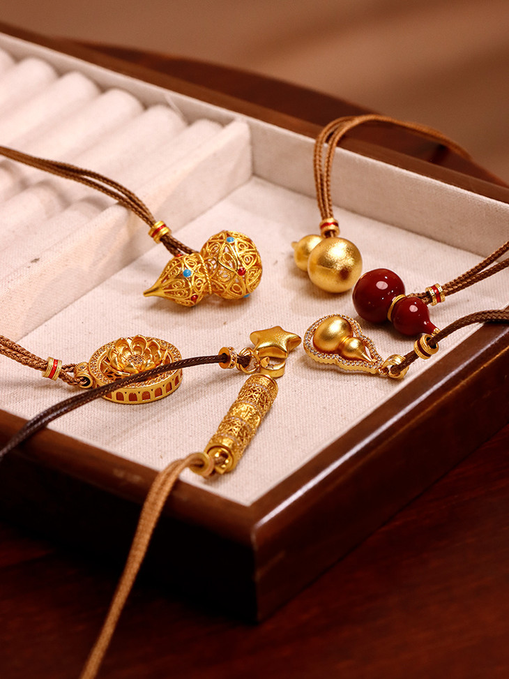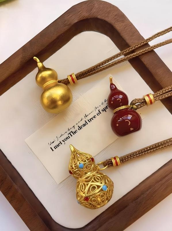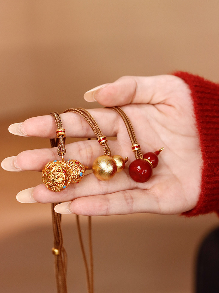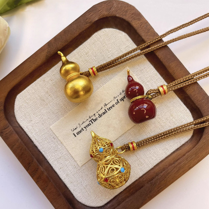 这组葫芦在质感上玩出了满满新意 —— 从亮泽细腻的光面、温润透亮的酒红釉面, 到自带复古肌理的镂空雕花、色彩鲜活的珐琅彩, 再到哑光高级的磨砂质感, 每一种都戳中不同的审美偏好 碎钻添上几分轻奢闪耀,彩宝衬出亮眼层次 撞色扣饰更添灵动趣味