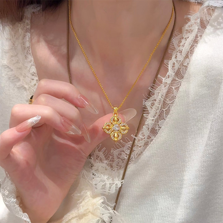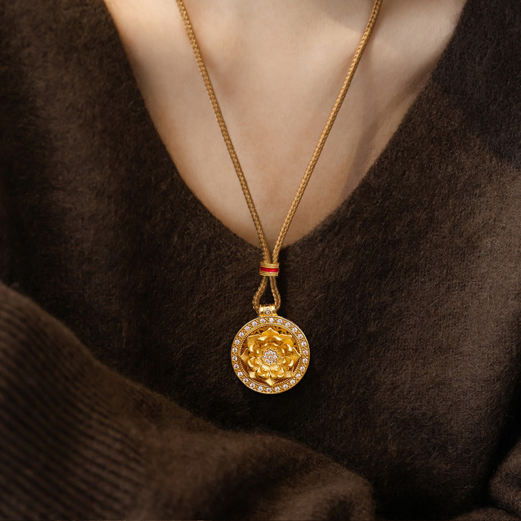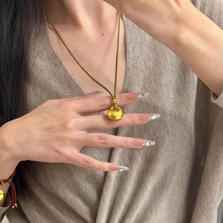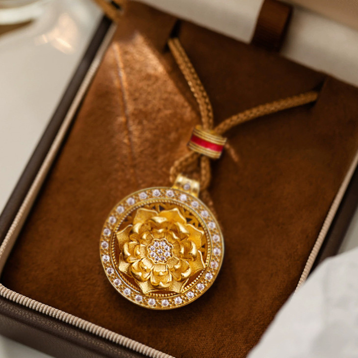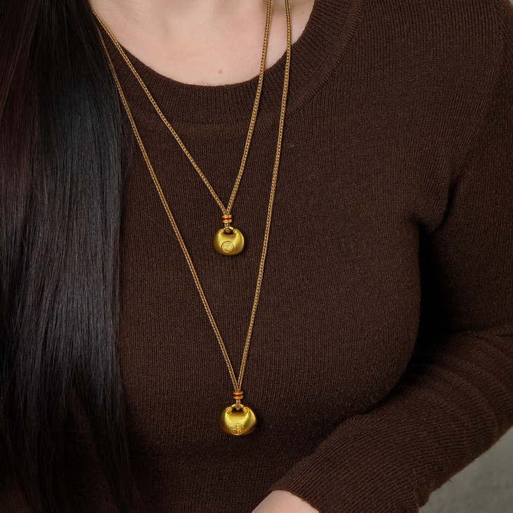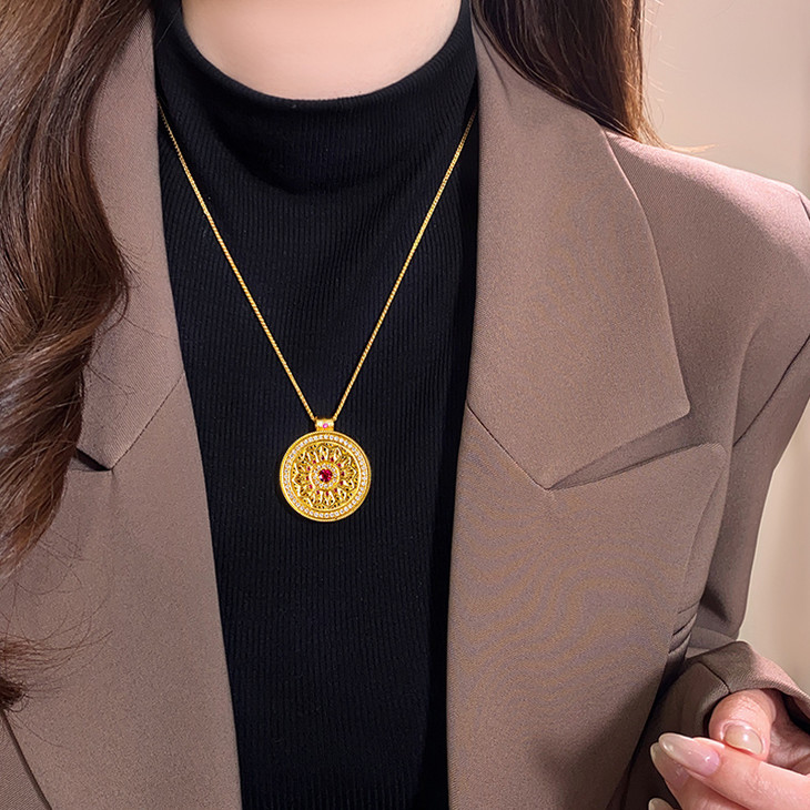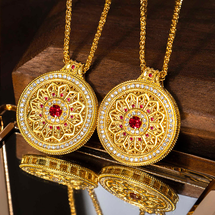 玫瑰花窗式的镂空花丝铺满圆牌 一颗红宝石点睛提亮 古法沙金的厚重质感裹着钻饰的细碎光泽 轻奢又显贵,锁骨间的细节直接戳中奢华审美 镂空花丝圆牌则藏着 “圆满无缺” 的祈愿 把 “鸿运当头、生活圆满” 的好兆头戴在颈间