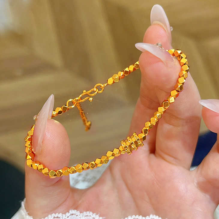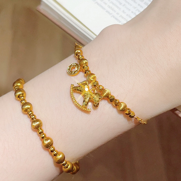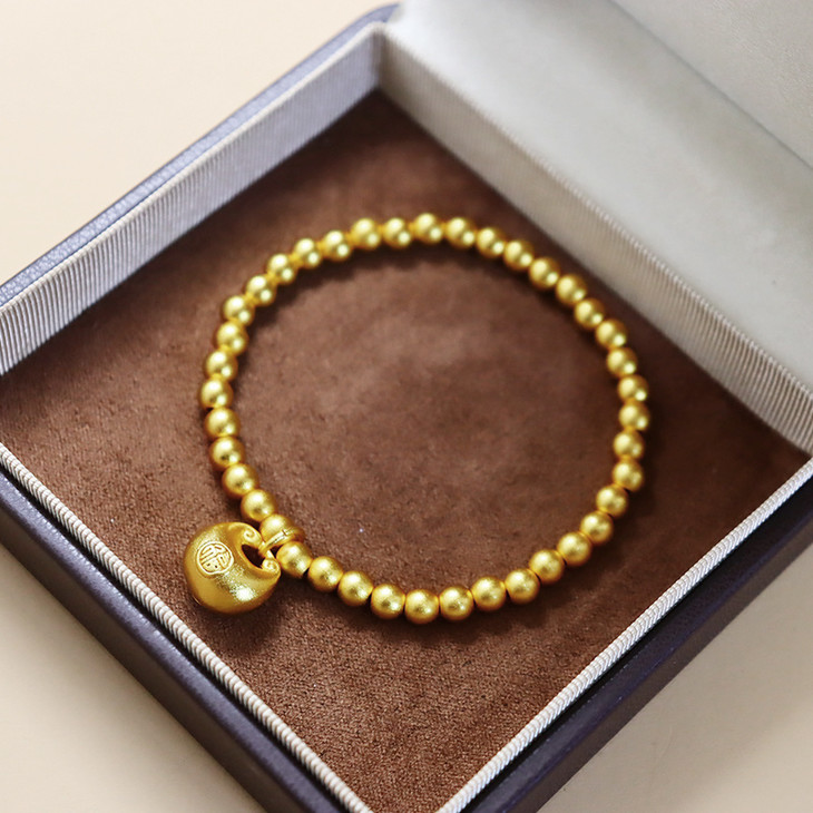 沙金小蛮腰蹦迪珠手链,链身多面切割的小蹦迪珠 光线折射下光泽灵动,嵌纤细流畅的 “小蛮腰” 扣饰 线条柔美且辨识度高 古法沙金福字小胖福手链 既是颜值款也是 “福气担当”: 圆润的古法转运珠串起温润沙金光泽 自带 “时来运转” 的祈愿; 坠着的胖福锁吊坠,“福” 字醒目又讨喜