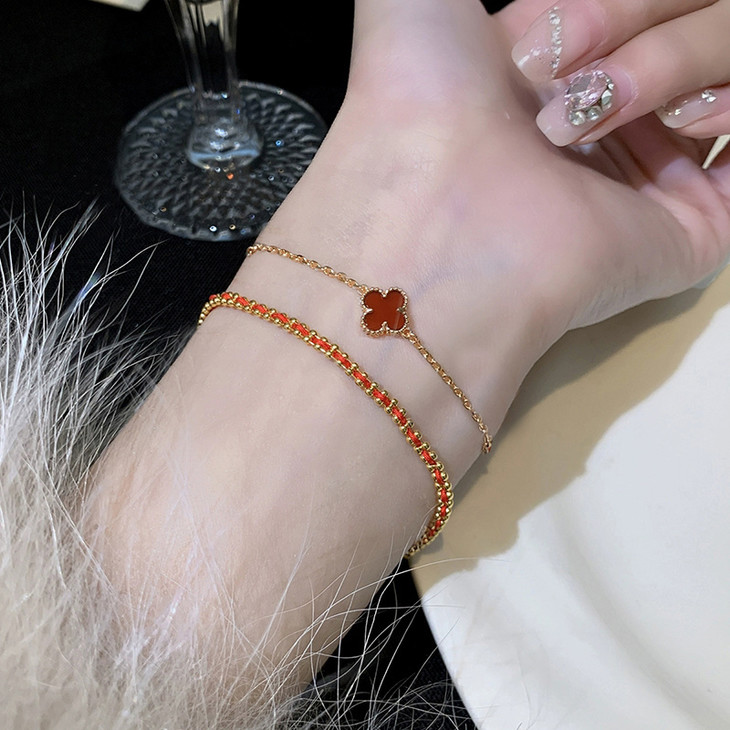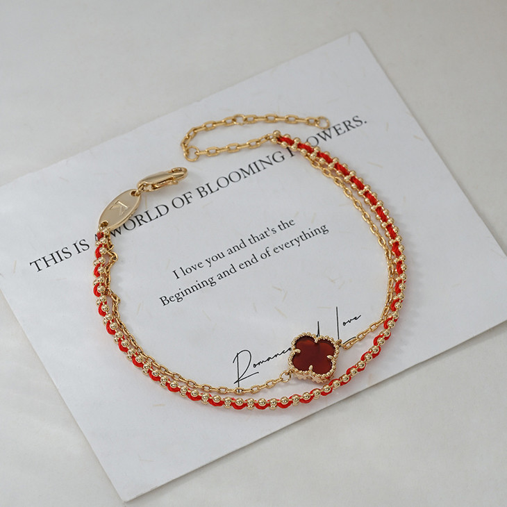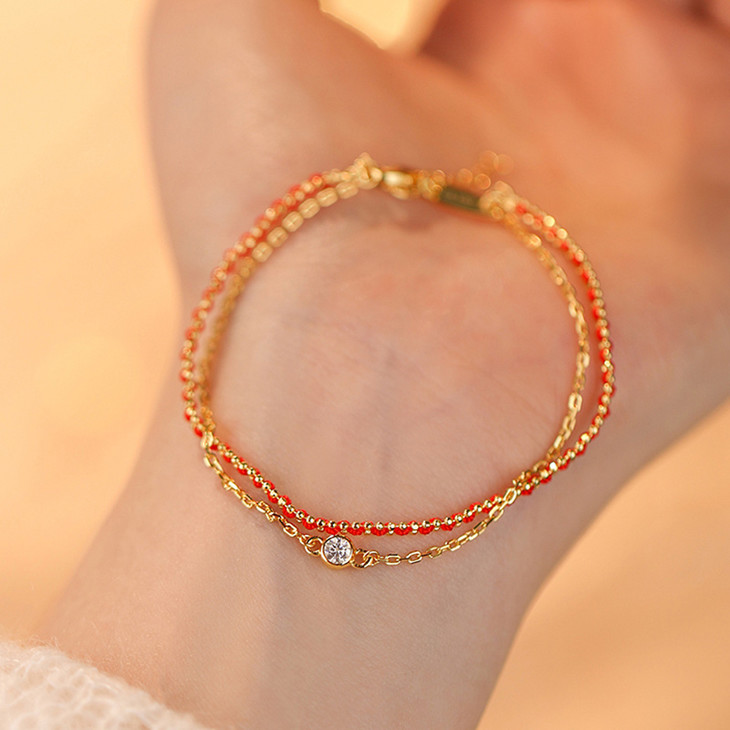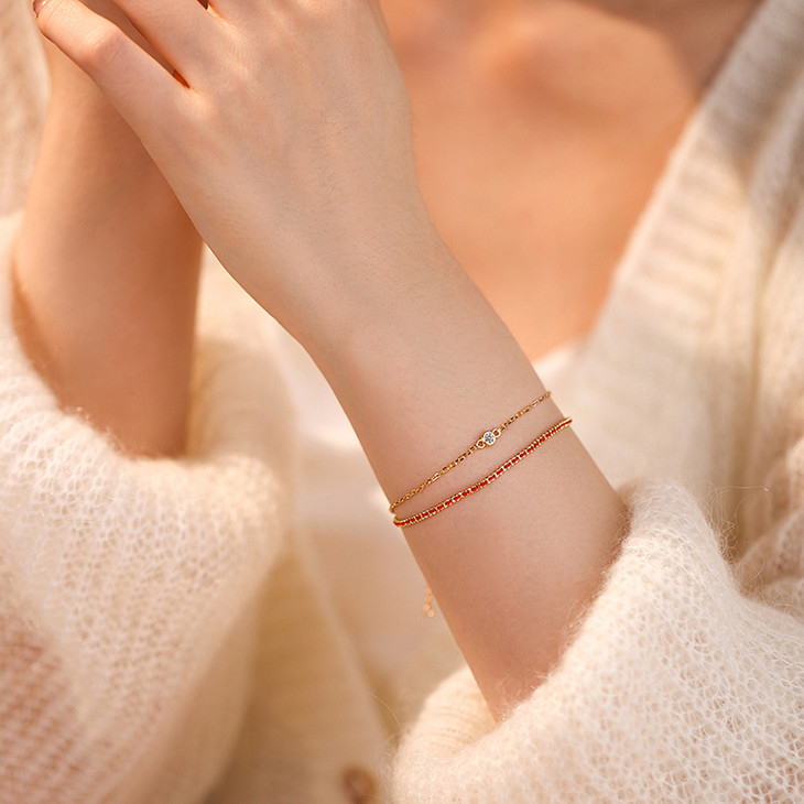 ✅红金双色链条叠戴,搭配沙金四叶草吊坠; 红色饰链自带喜庆质感,四叶草造型精致小巧 双层红金链条交织,点缀一颗小钻; 链条纤细轻盈,钻饰增加细节闪耀感 红色对应 “喜庆辟邪、吉祥顺遂” 四叶草象征 “幸运加持”,钻饰对应 “生活闪耀” 叠戴设计暗含 “双倍好运” 的祈愿