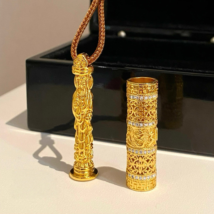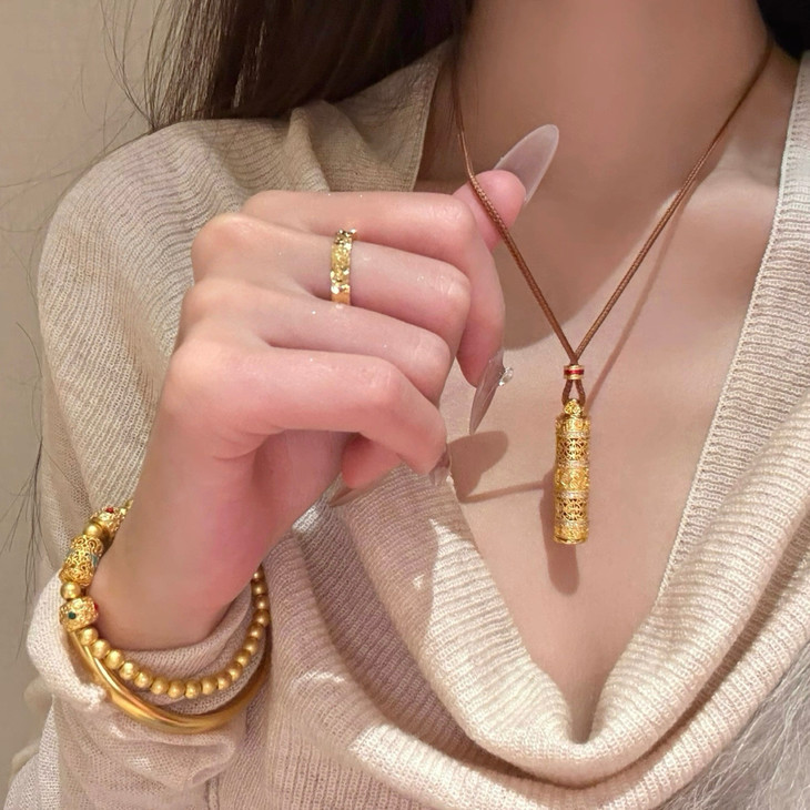 ✅重工古法沙金饰品 把吉祥寓意揉进了每一处设计细节里 是自带 “祈福 buff” 的佩戴好物 古法金转经筒六字真言 重工镂空花丝裹满温润的古法金肌理 自带藏式祈福属性:转动转经筒 便藏着 “消灾解厄、平安顺遂” 的祈愿 古法金的厚重质感 更像一层 “守护结界”,把安稳福气裹在日常佩戴里