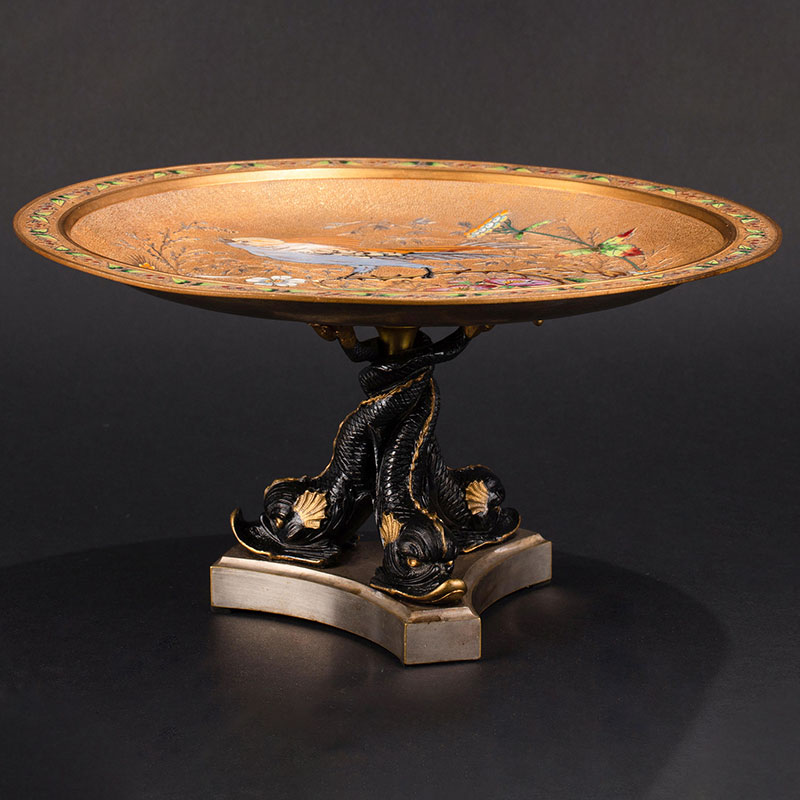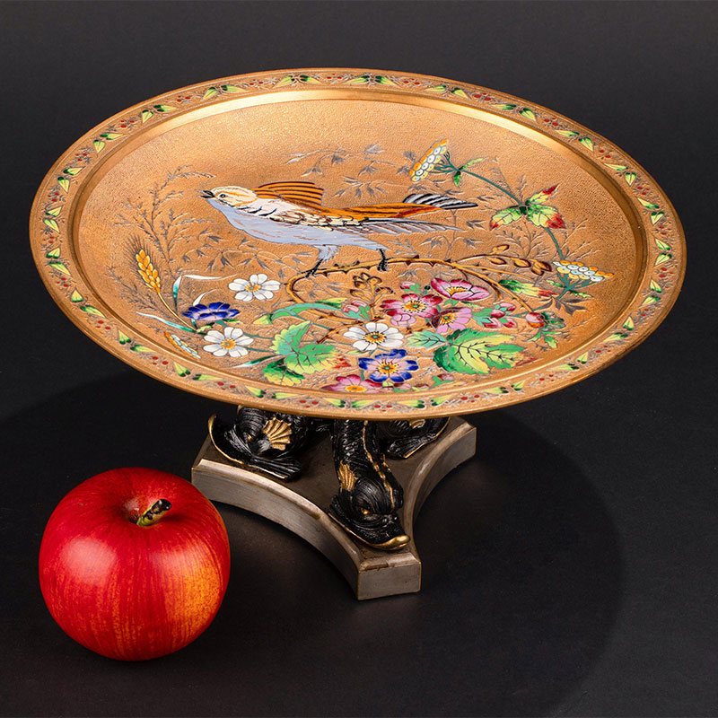 1890年代法国出品东方风格花鸟主题珐琅彩绘铜鎏金赏盘