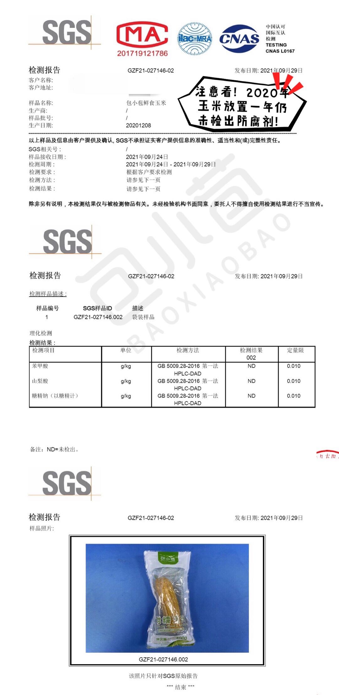 能够常温保鲜也不是依靠防腐剂,而是依靠瞬时高温灭菌科技的力量, 看下面的检测报告玉米放置一年后仍未检测出防腐剂。(前提是真空袋不漏气哦)