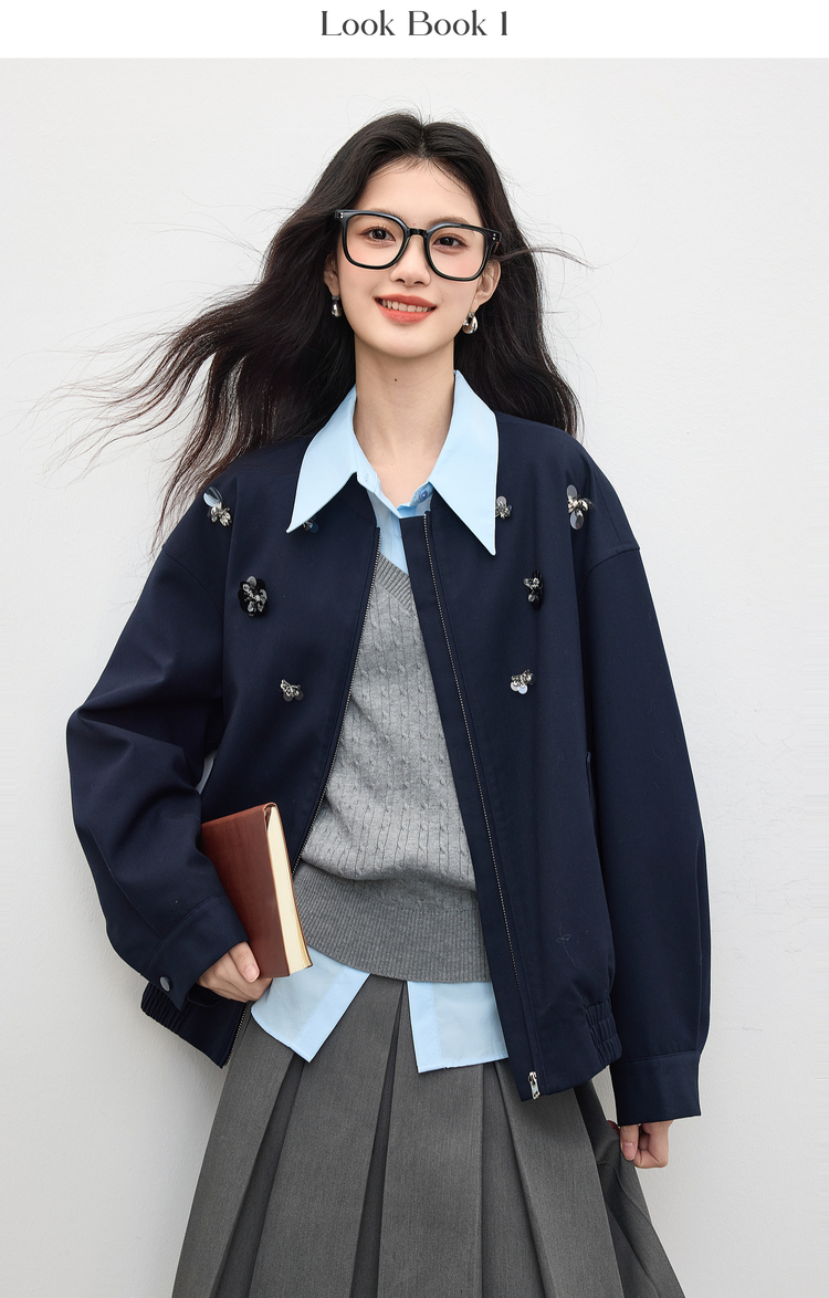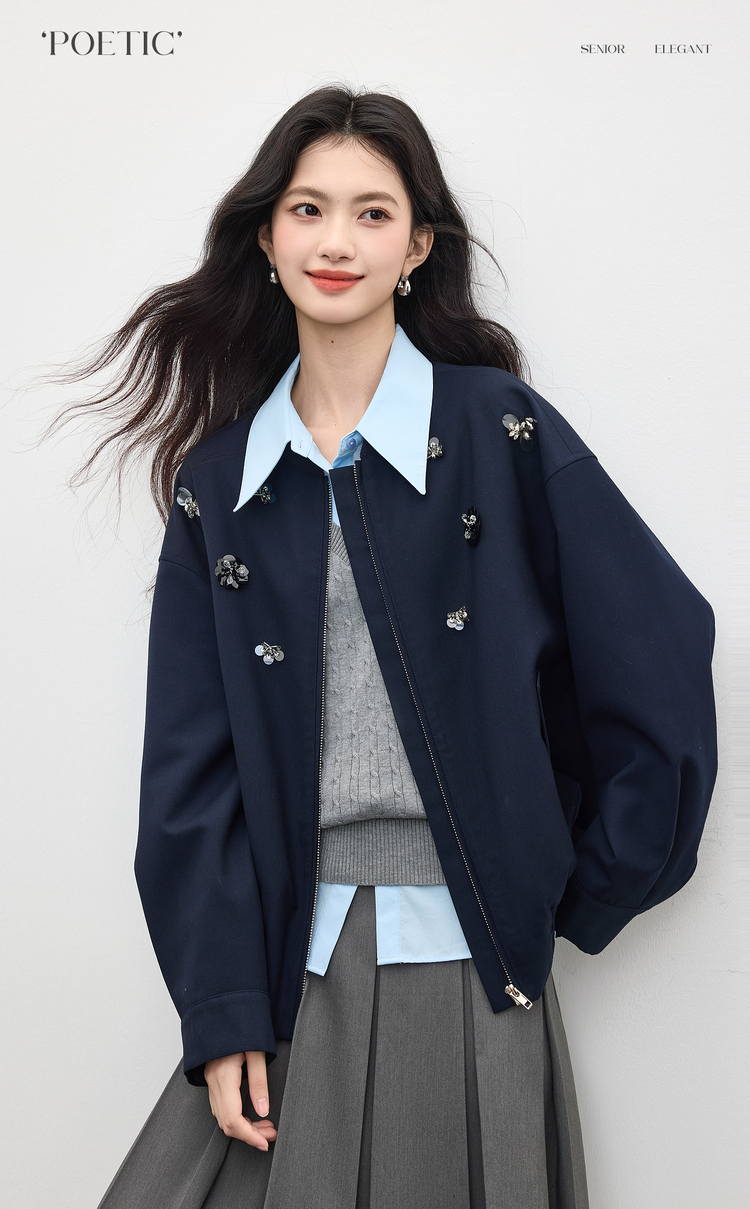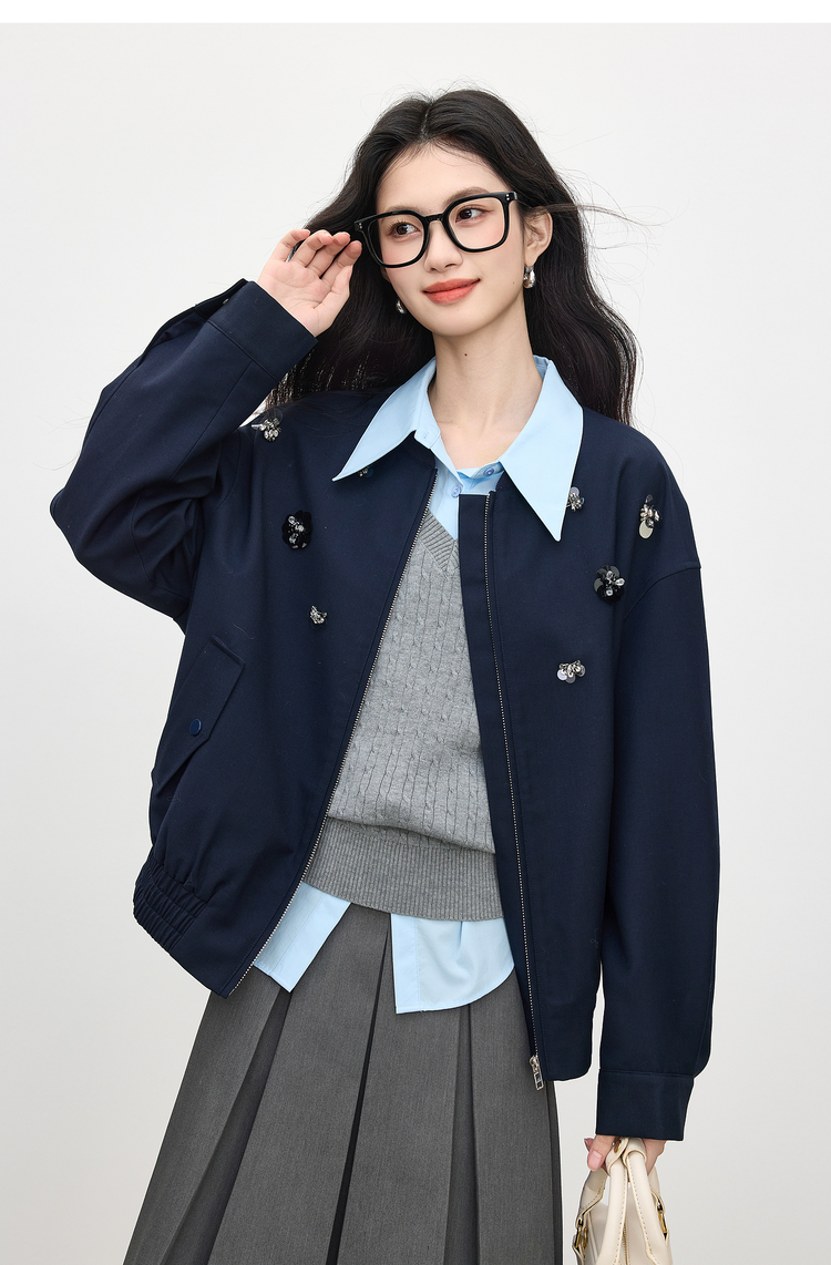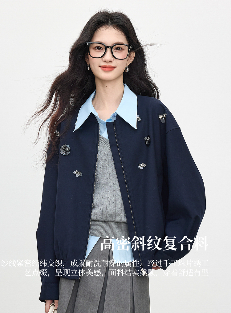 【10/1新品】熙世界立体珠片绣棒球领夹克上衣女秋季休闲百搭松弛感花苞短外套