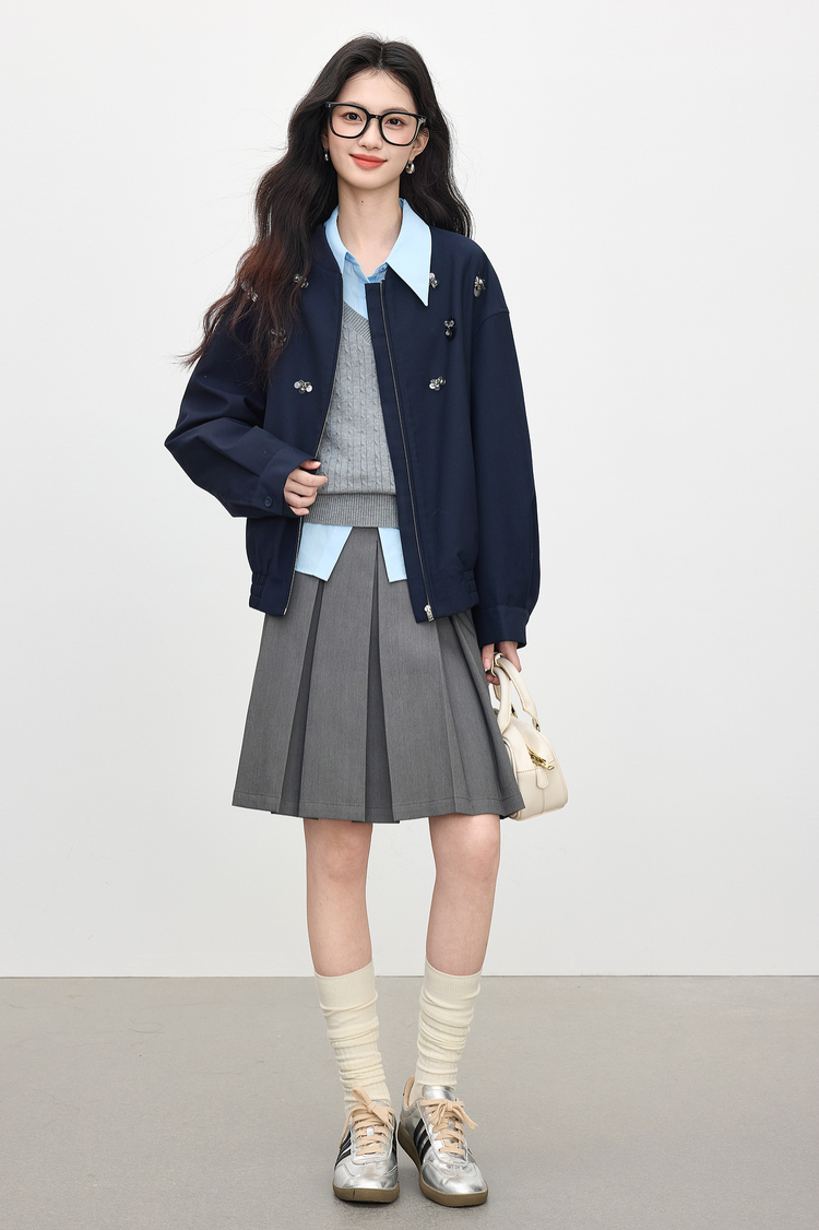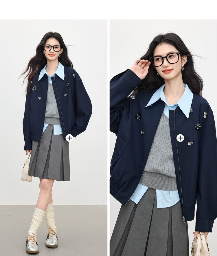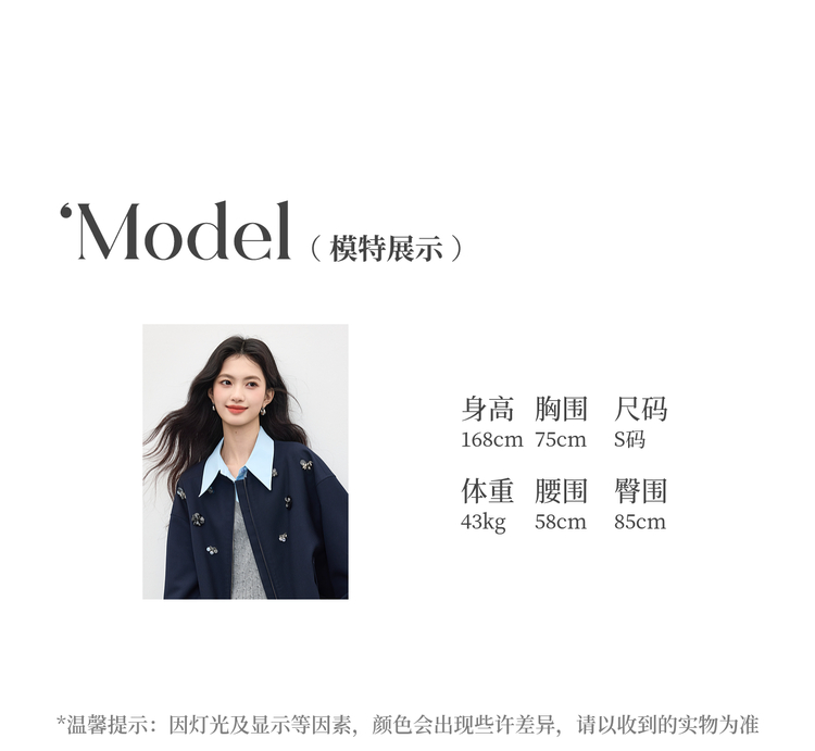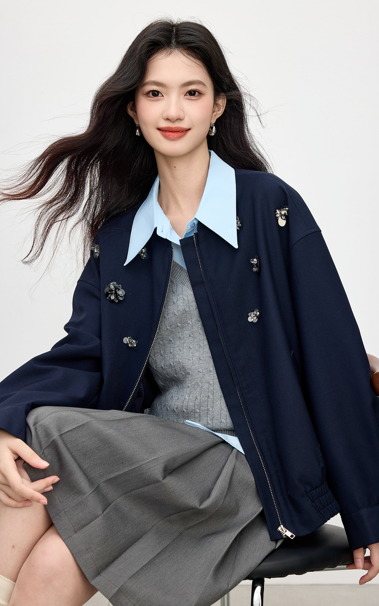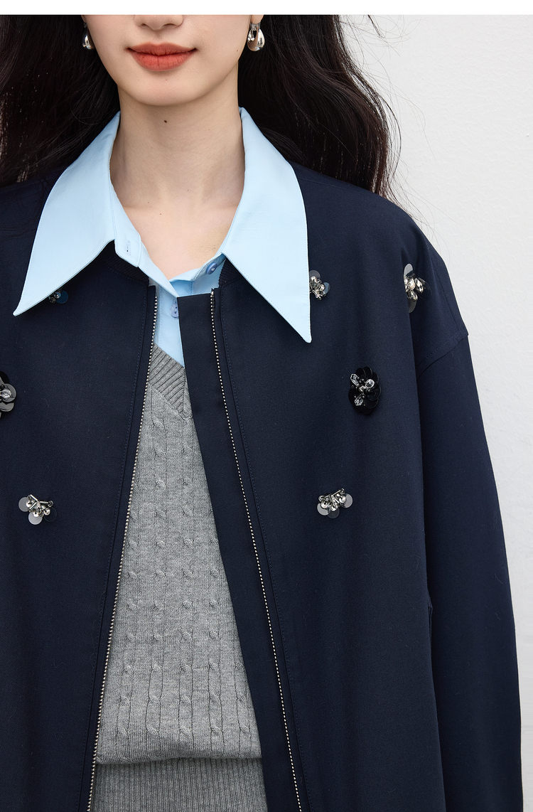 【10/1新品】熙世界立体珠片绣棒球领夹克上衣女秋季休闲百搭松弛感花苞短外套