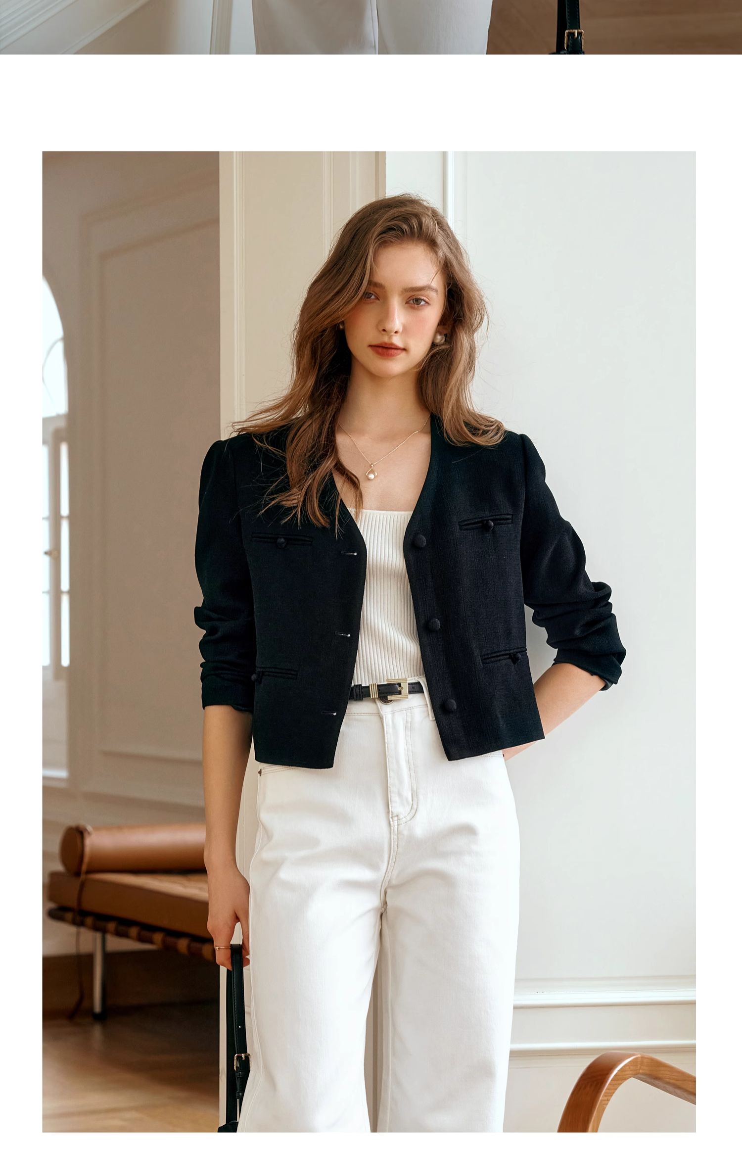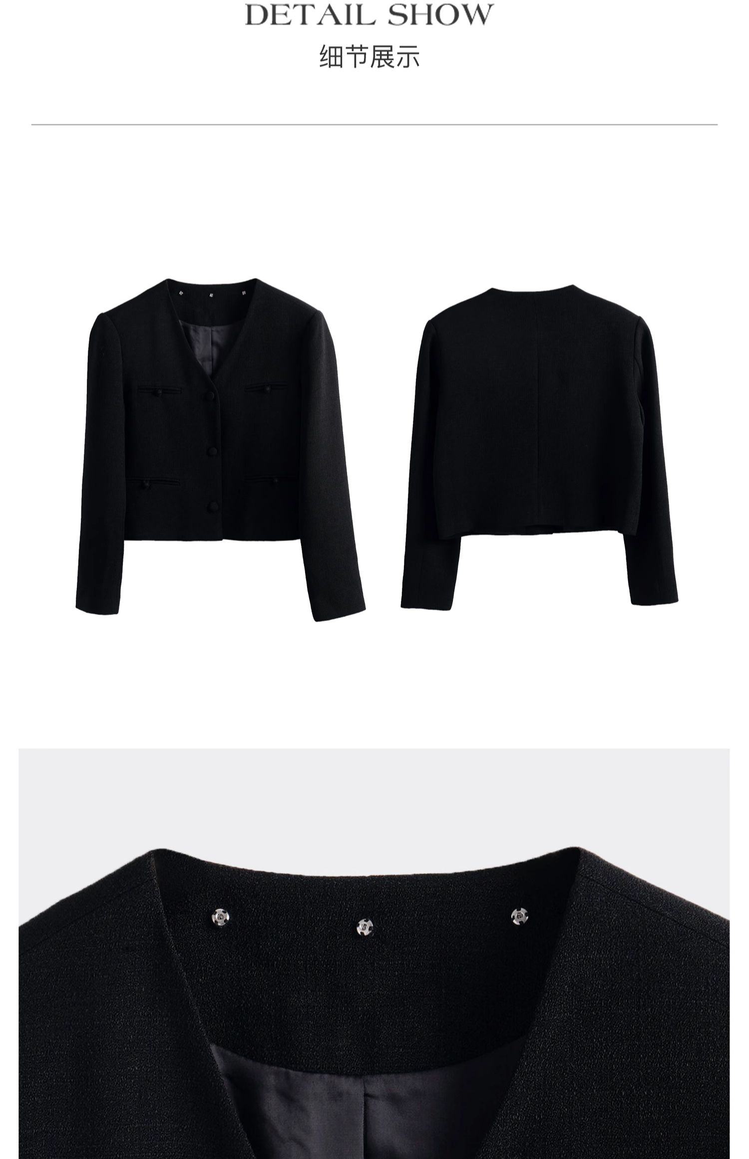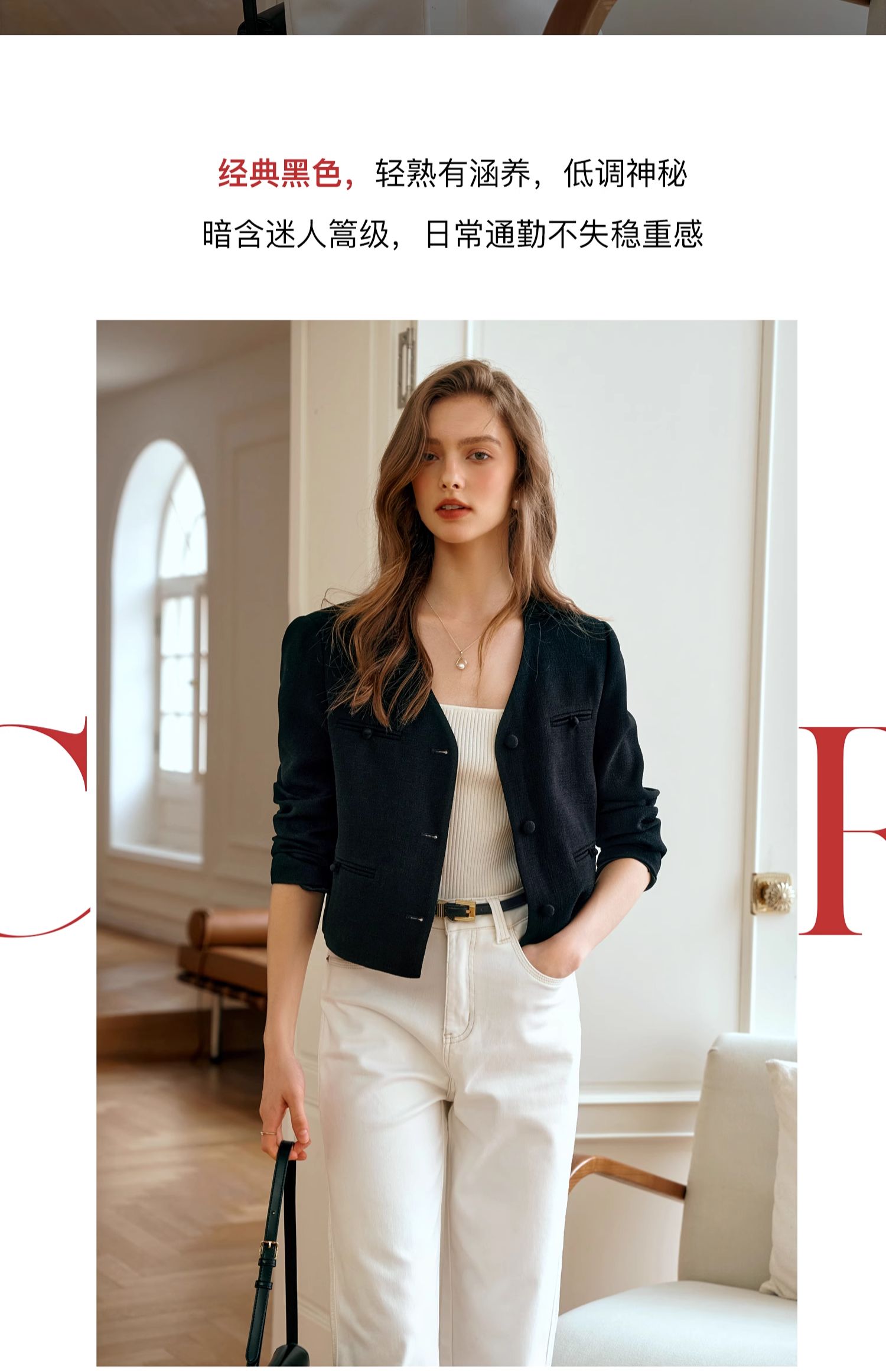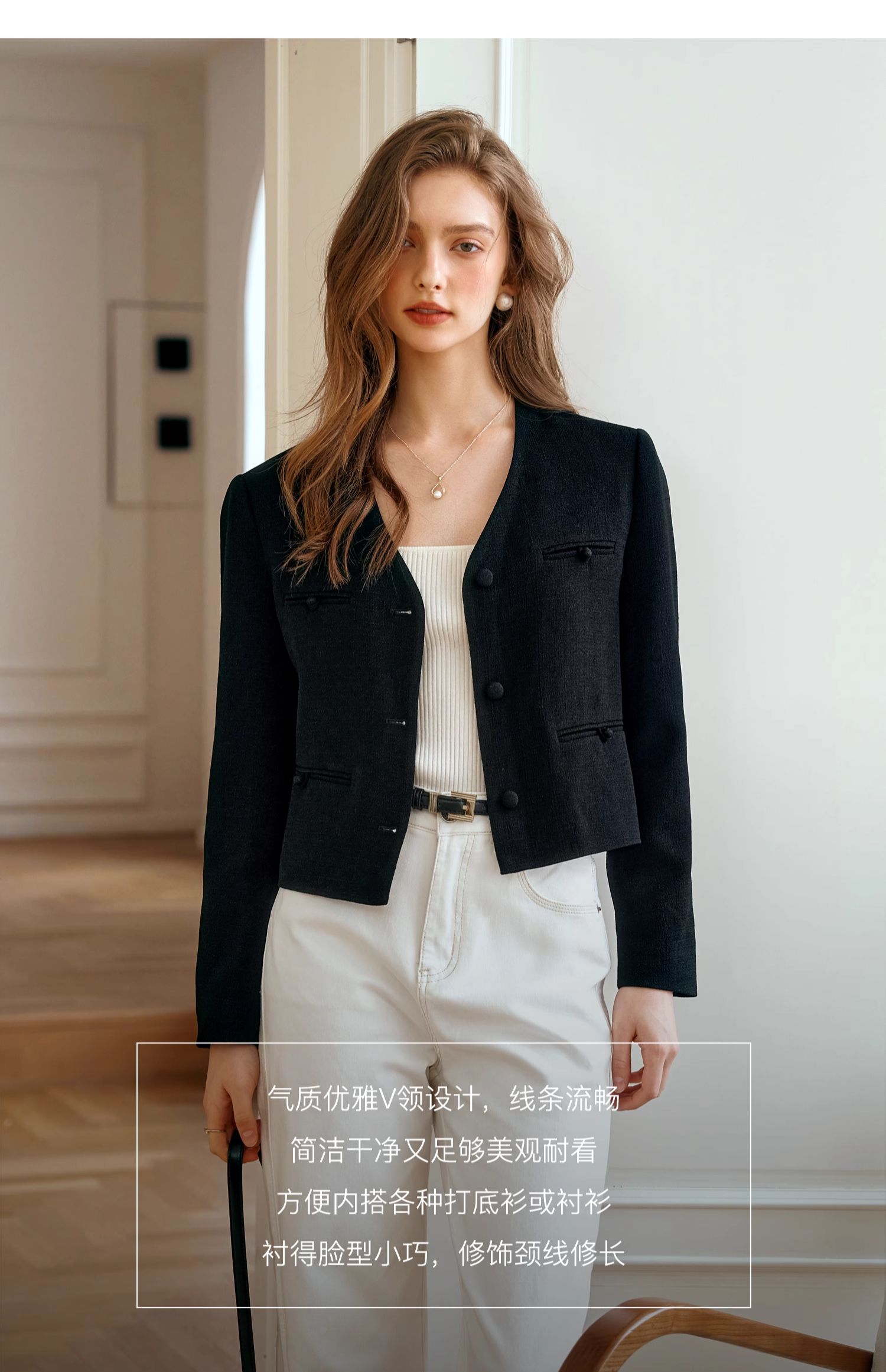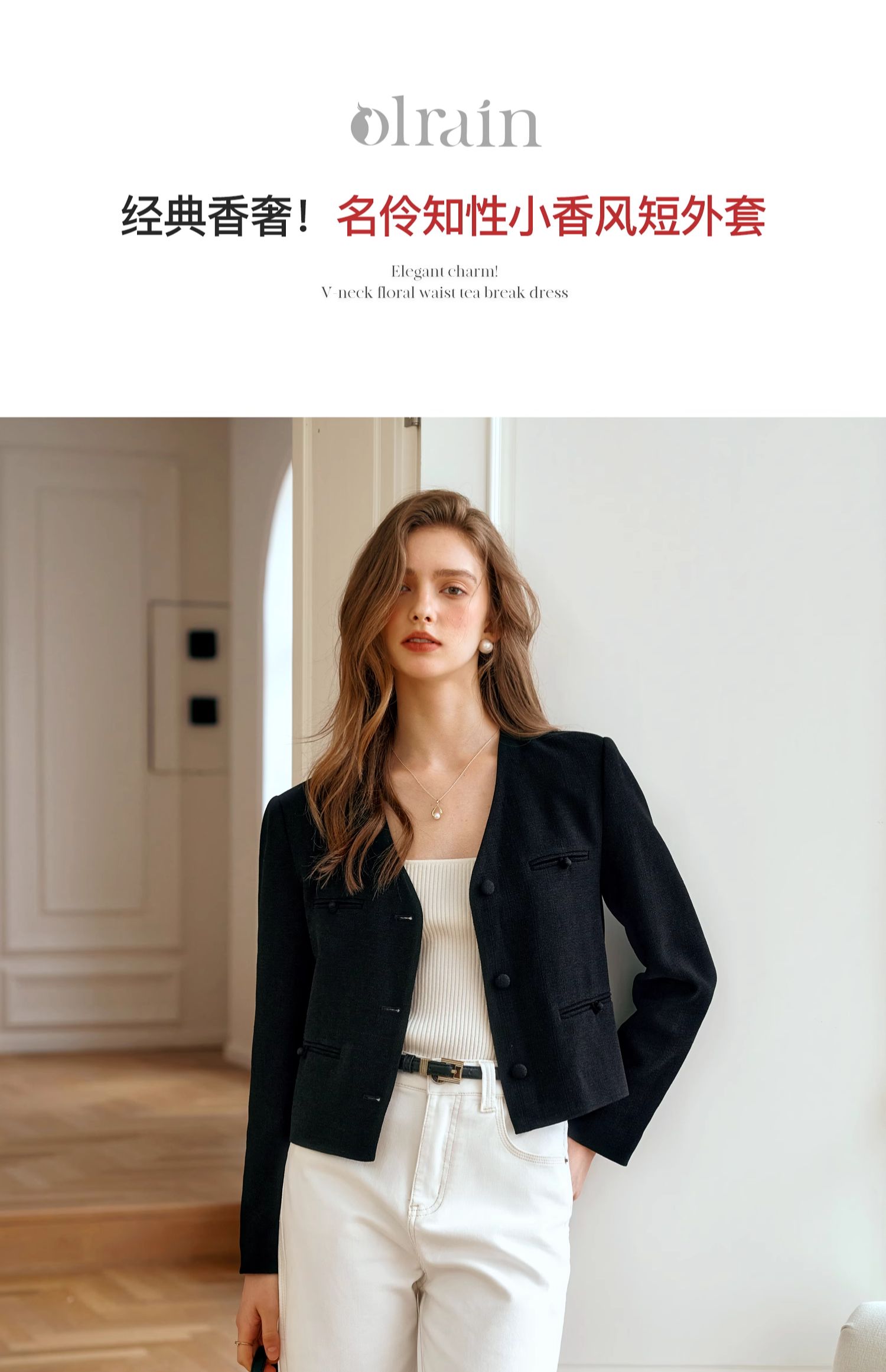 OLrain欧芮儿法式黑色小香风短外套女早秋2024新款通勤V领上衣
