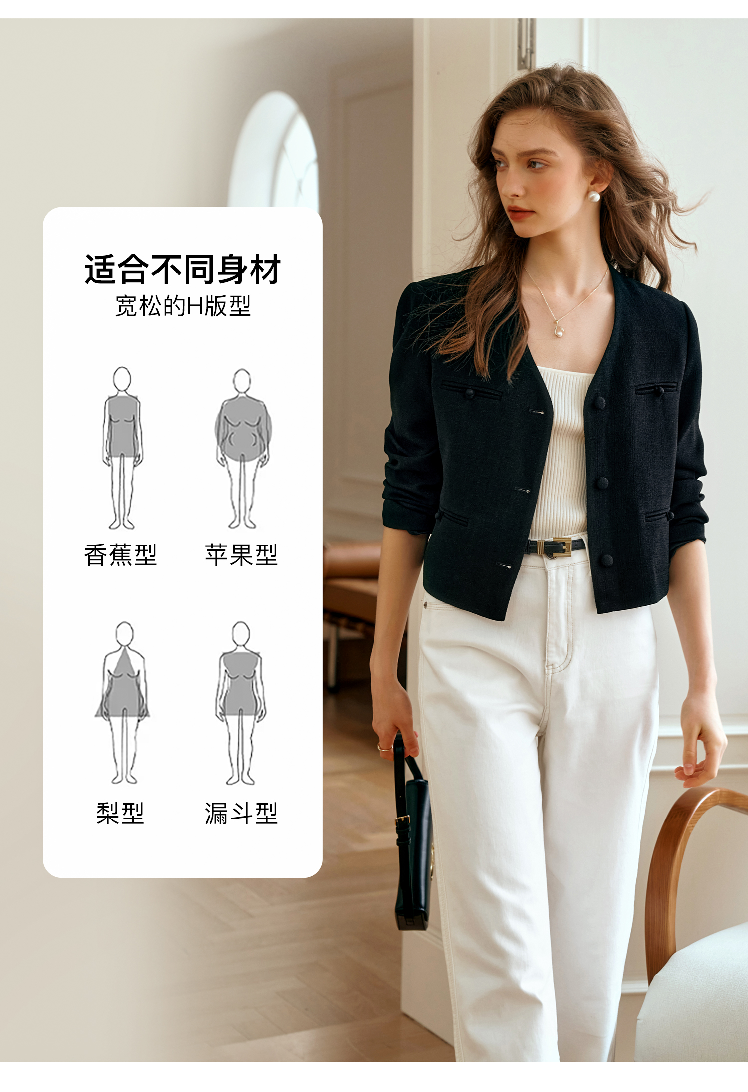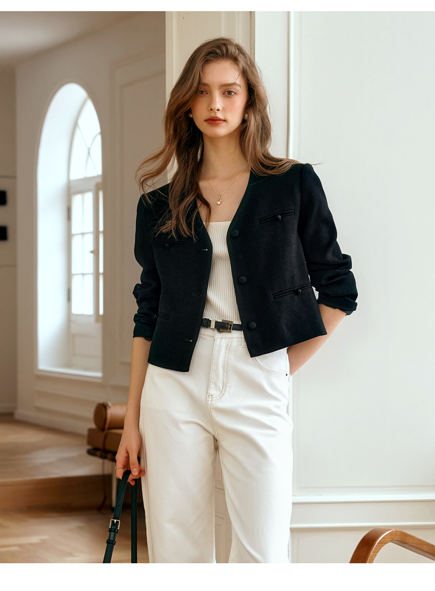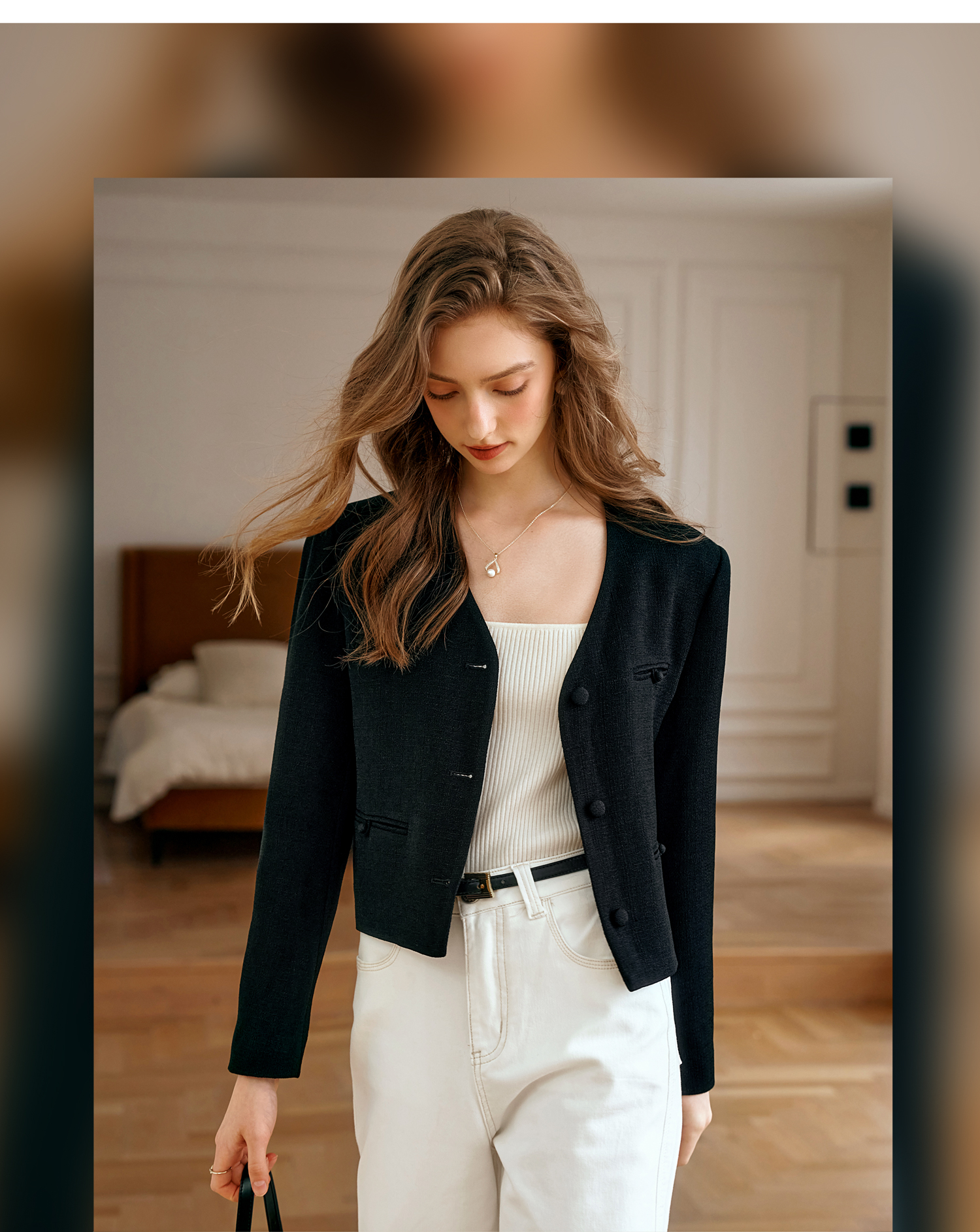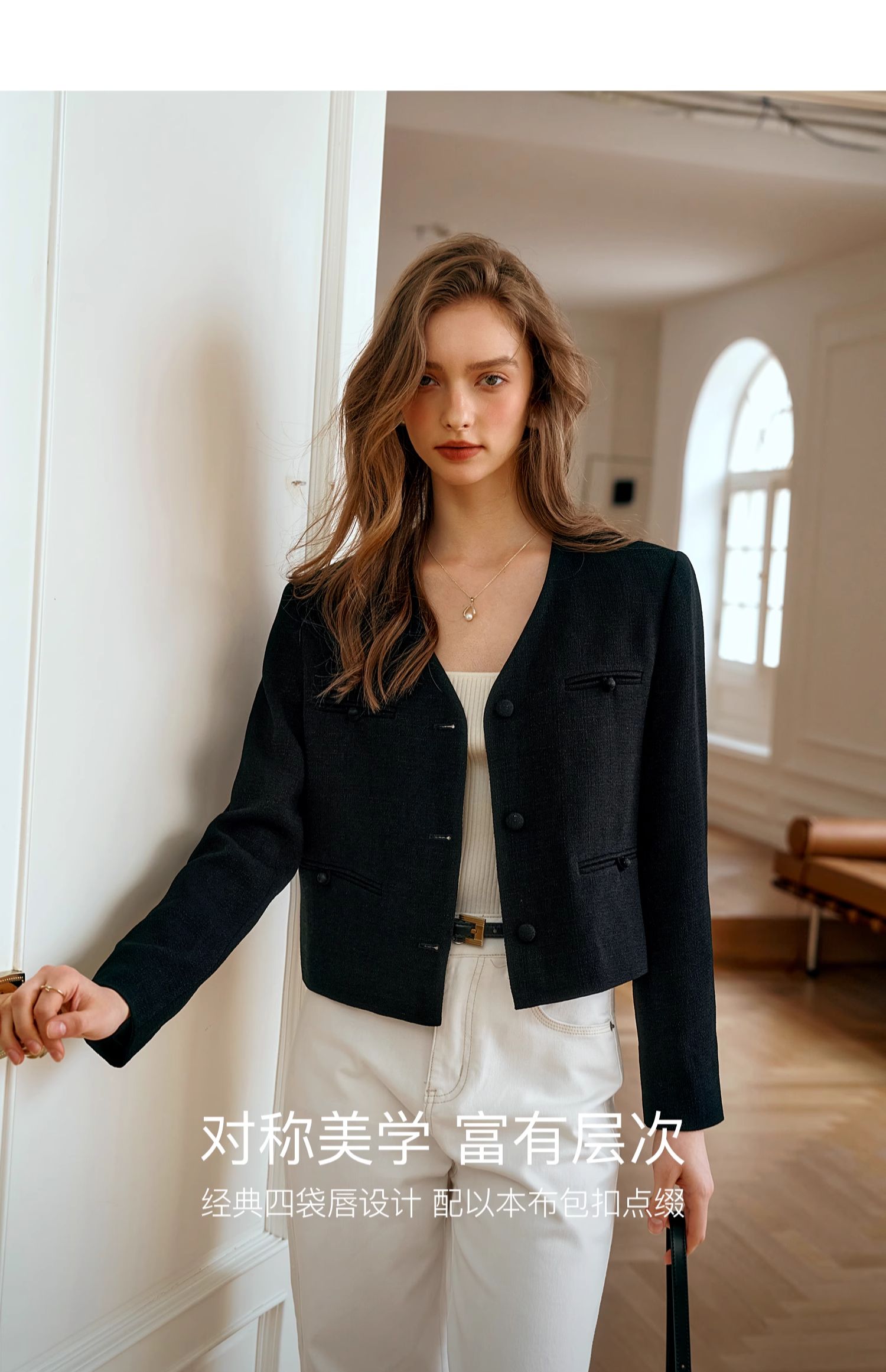 OLrain欧芮儿法式黑色小香风短外套女早秋2024新款通勤V领上衣