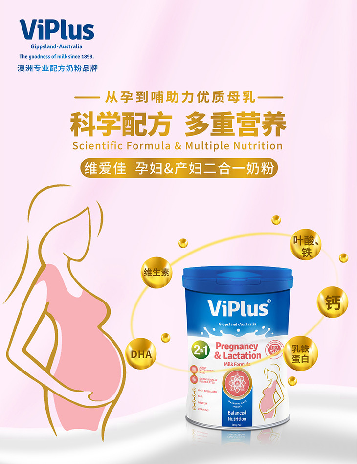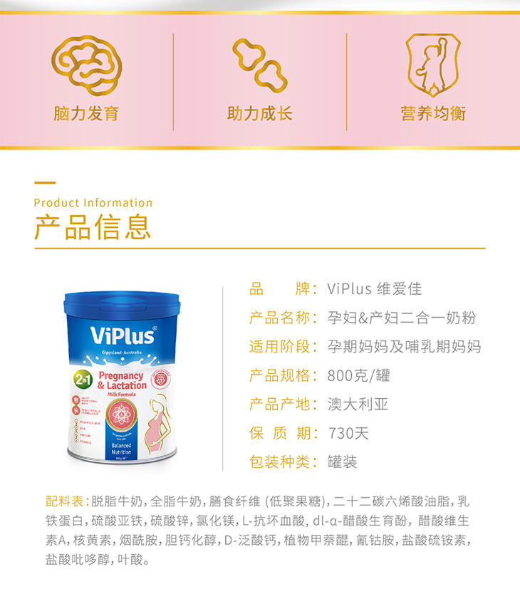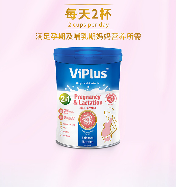 【孕产奶粉】当季新品Viplus维爱佳澳洲进孕妇&产妇二合一奶粉叶酸、乳铁蛋白、DHA孕期、哺乳期800g*1罐【维爱佳】