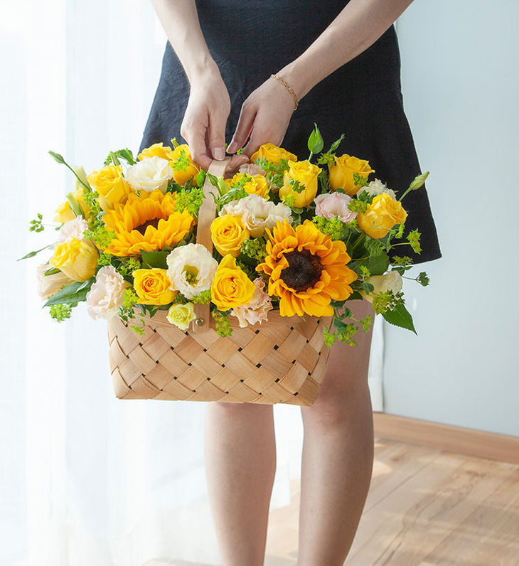 花材:向日葵2枝,金枝玉叶玫瑰13枝,香槟桔梗0.2扎,叶上黄金0.2扎