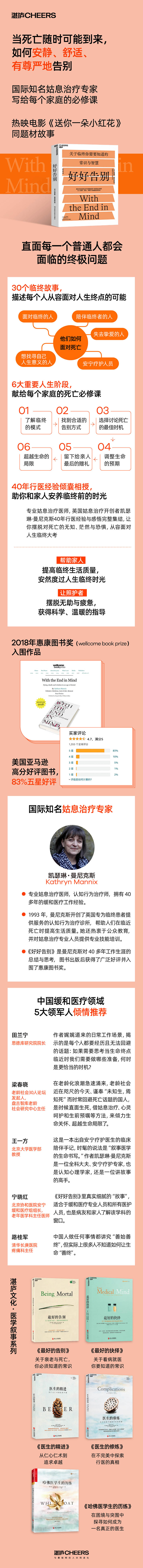 在这本书中,作者从了解临终模式、找到合适的告别方式、选择讨论死亡的更佳时机、调整生命的预期,到留下给世界的赠礼、超越生命的局限等6大方面,用30个娓娓道来的感人故事,写出了一本让读者了解缓和医疗与临终关怀的经典之作。