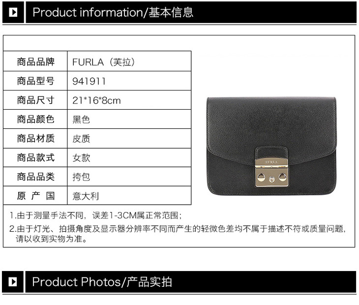 【香港直邮】Furla 芙拉 女士黑色皮革单肩包 941911