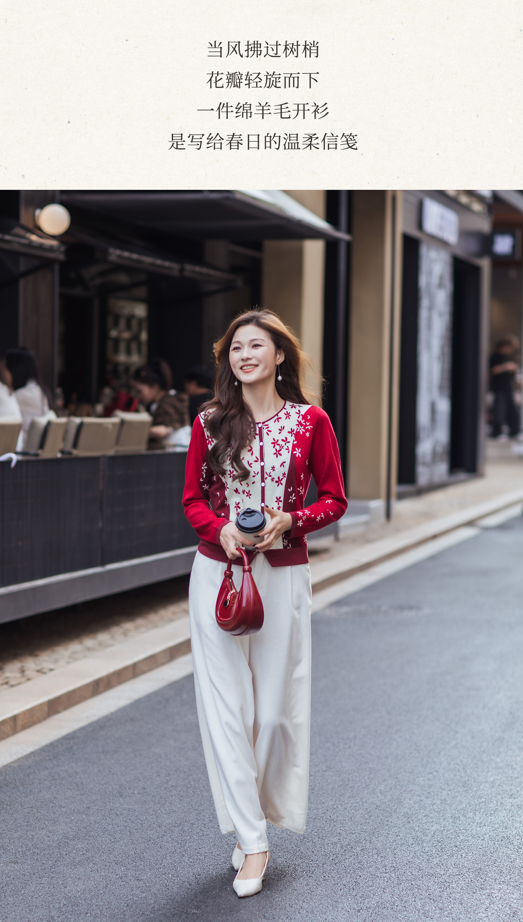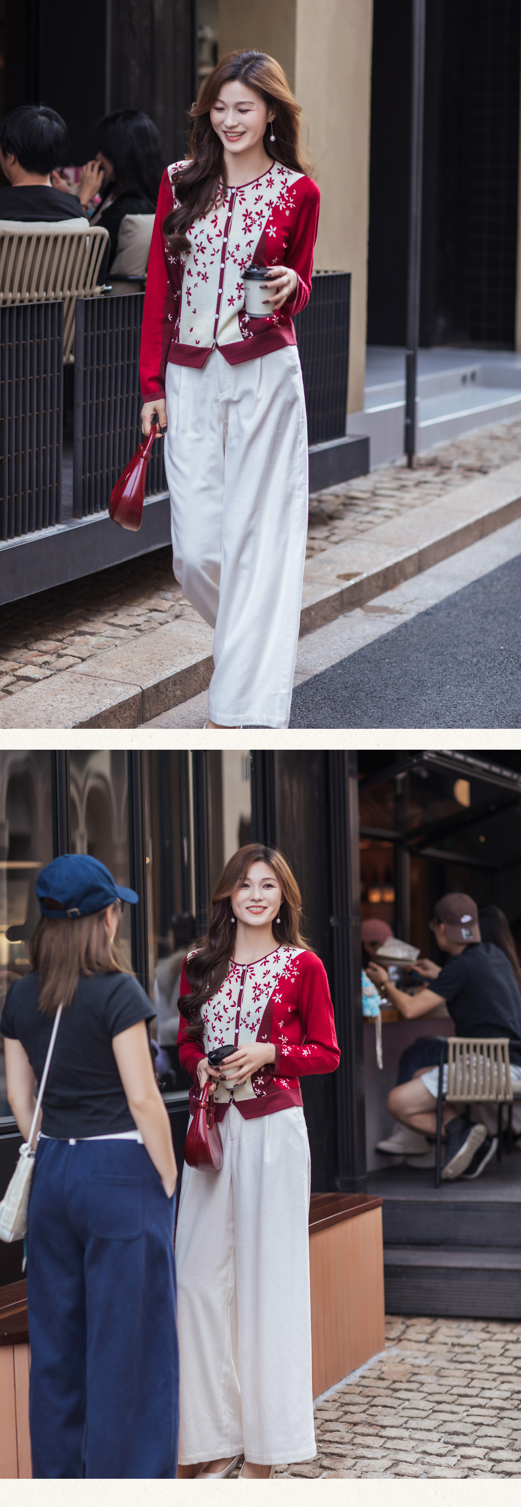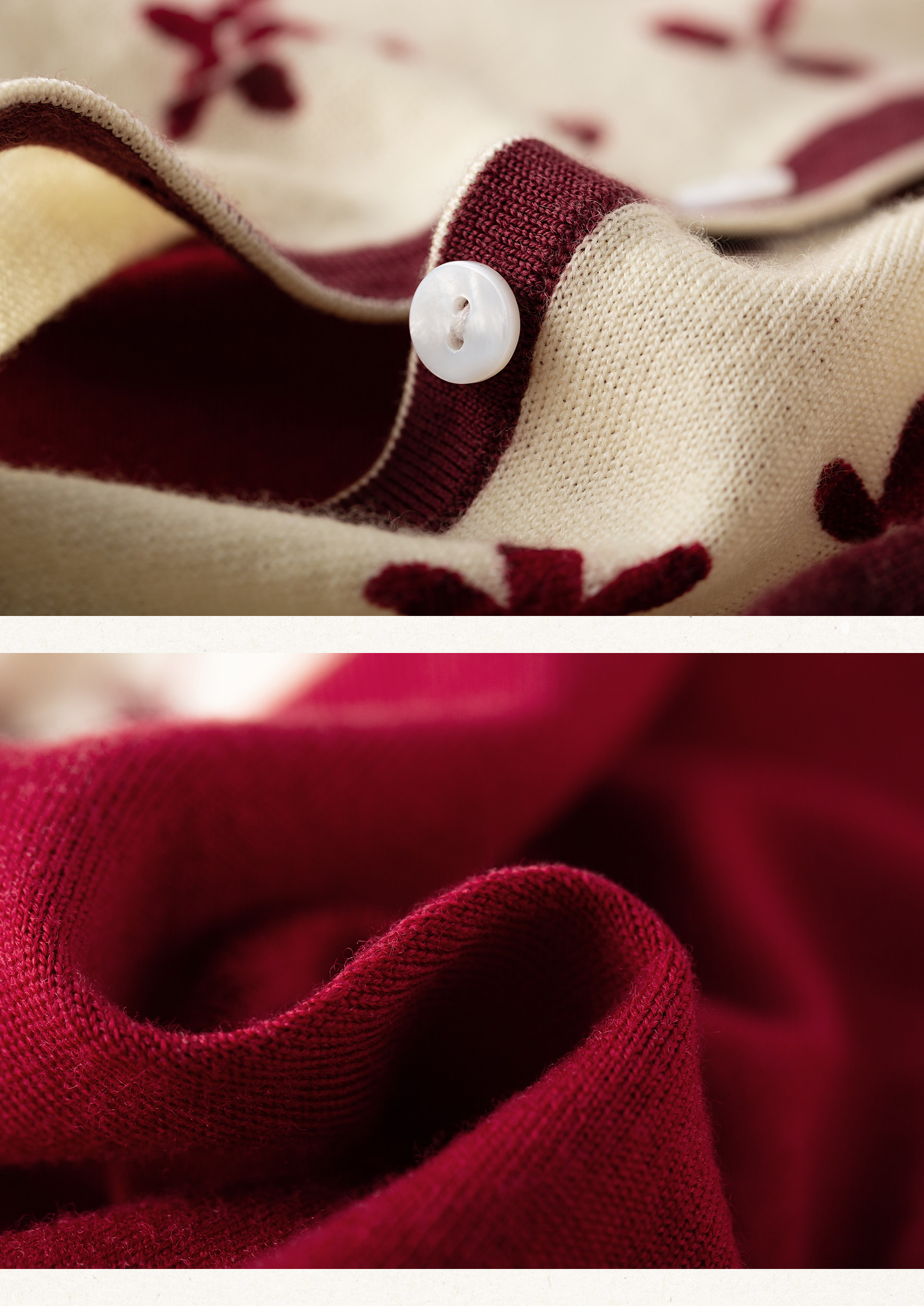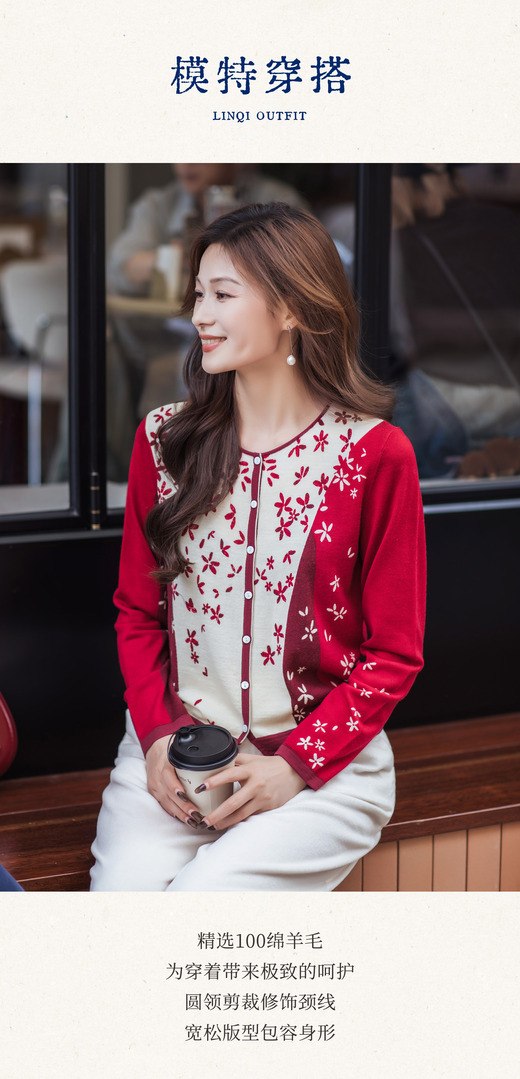 【林栖设计小店】【林栖推荐】(预售)2026早春新款红色与白色撞色羊毛印花针织开衫N1961279