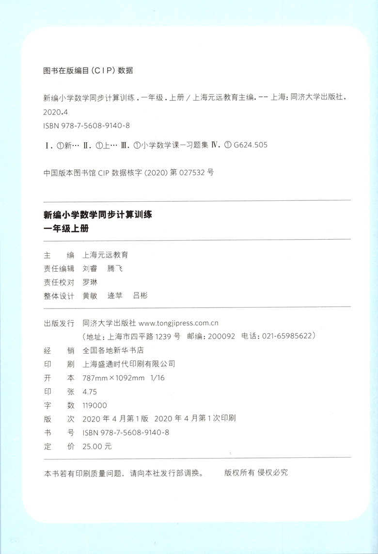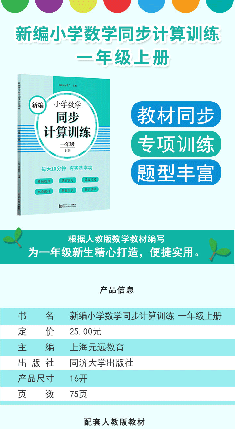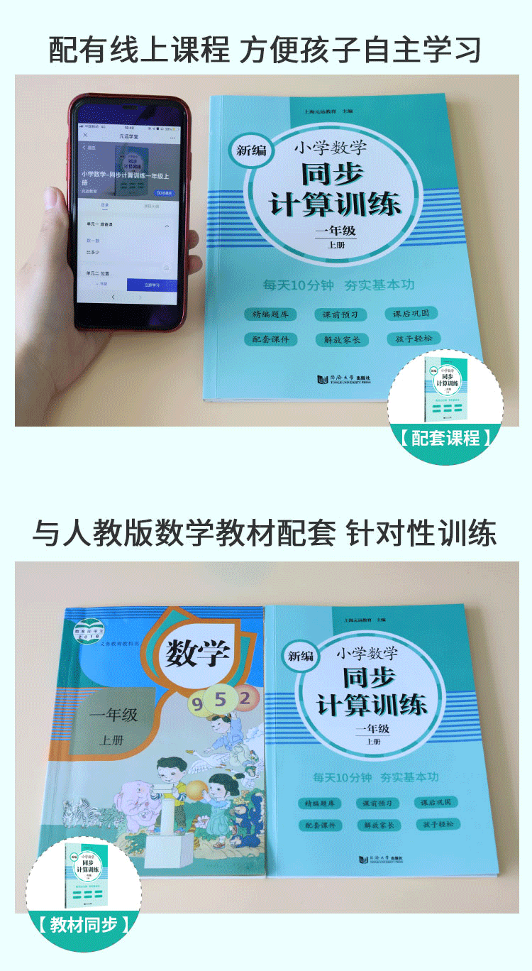 2020新版 新编小学数学同步计算训练 一年级上册/1年级第一学期 人教版数学教材配套练习 小学数学计算专项训练 同济大学出版社