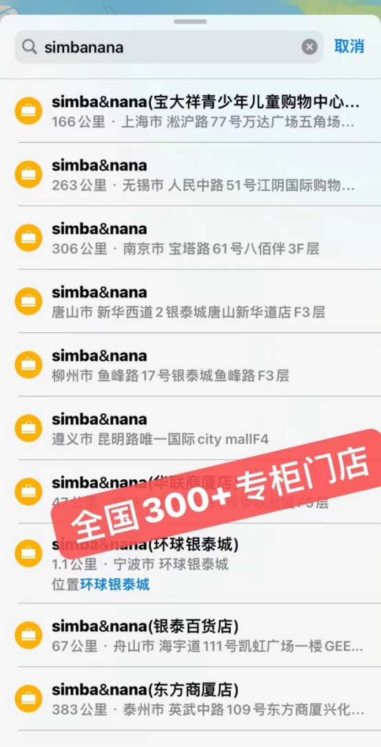 Simba&nana目前已进驻上海南京东路步行街购物中心 北京新中国、银泰百货、成都茂业 八佰伴系统、金鹰系统等国内一线商场 目前全国有300多家专柜店铺
