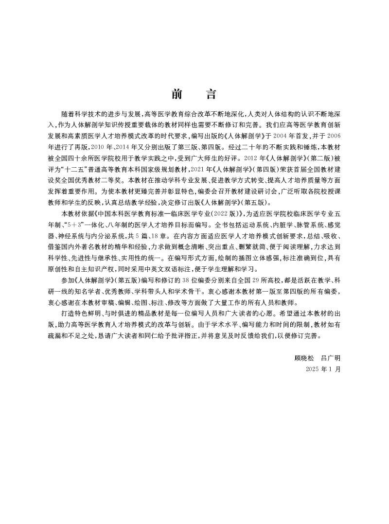 人体解剖学 第5五版 十四五普通高等教育本科规划教材 顾晓松 吕广明 主编 供医学生 教师 研究生等 9787030818232科学出版社