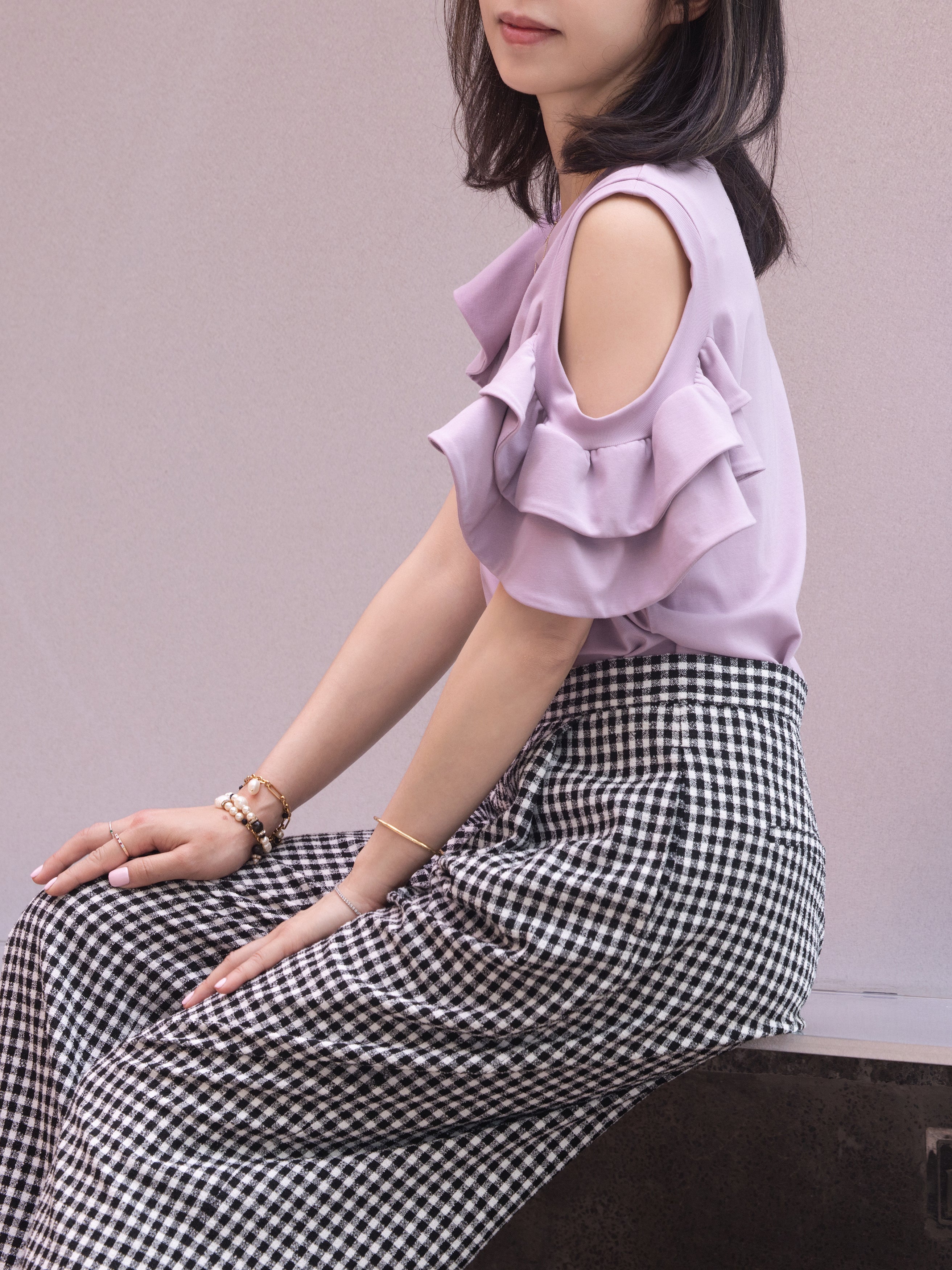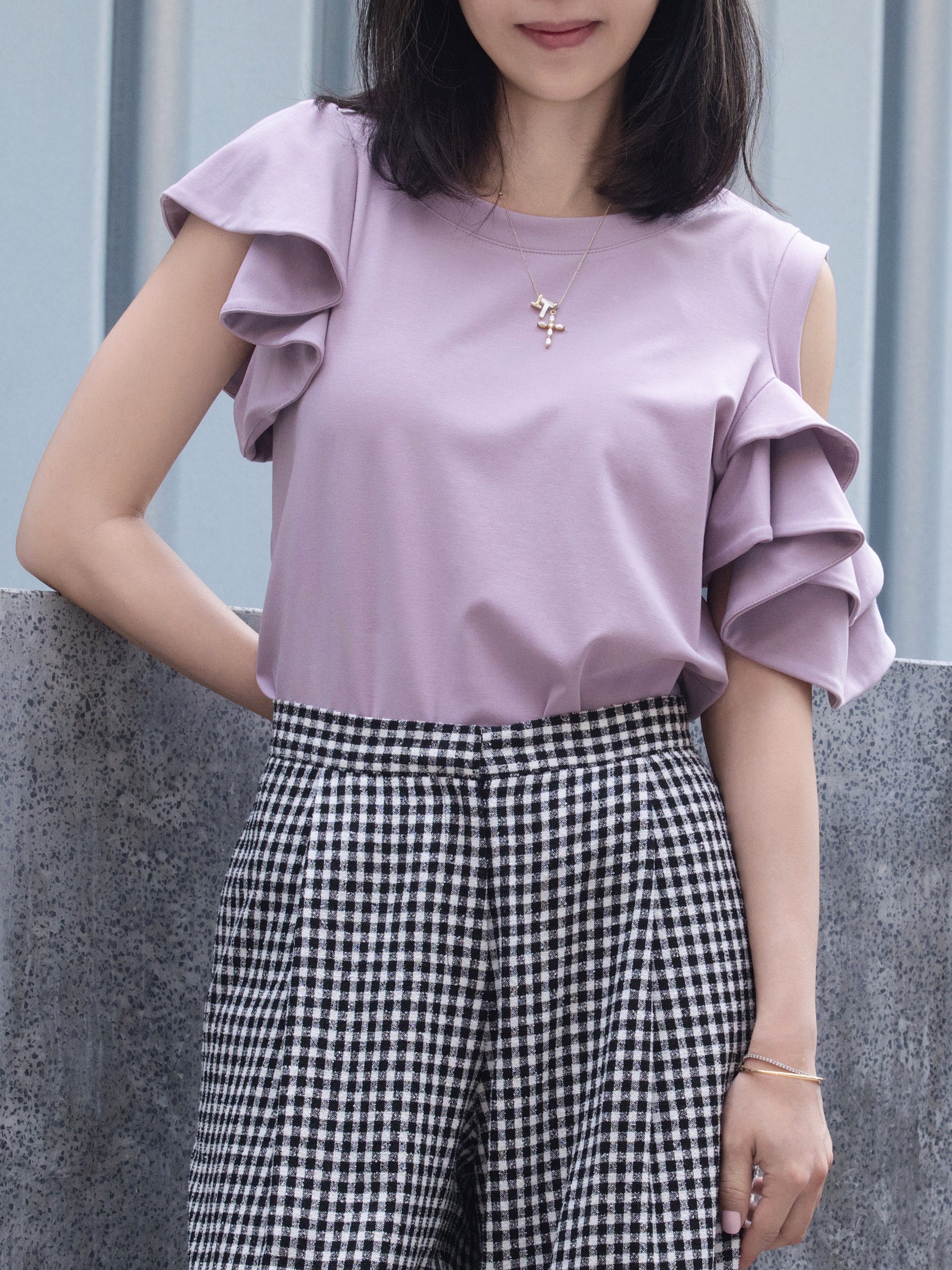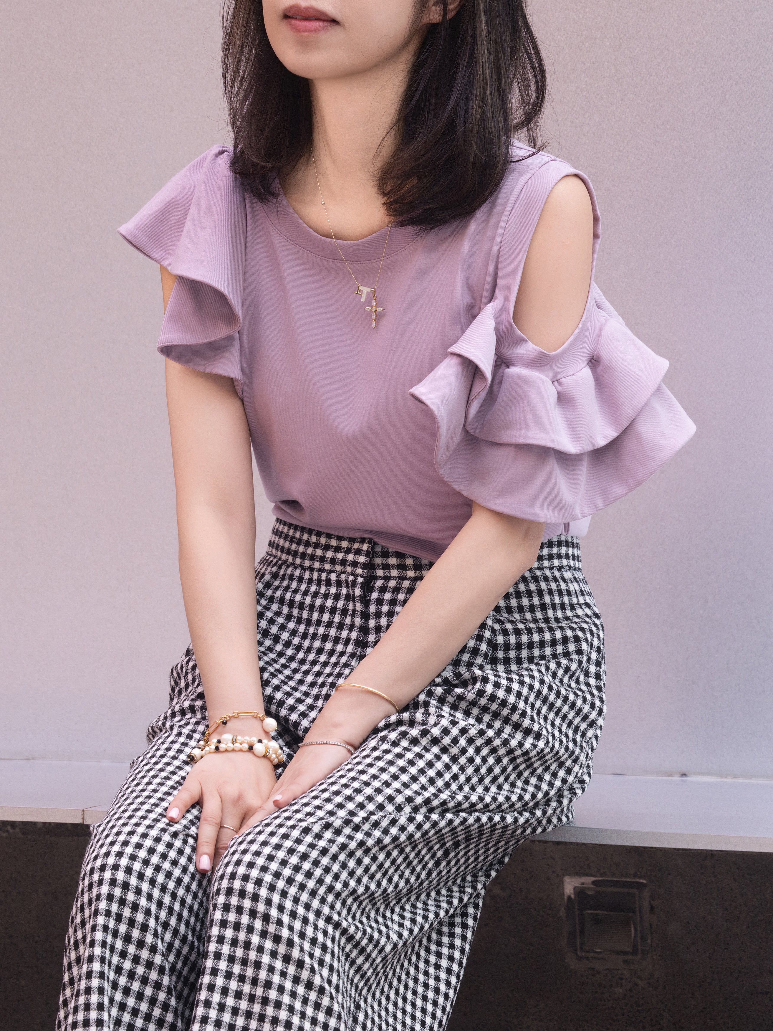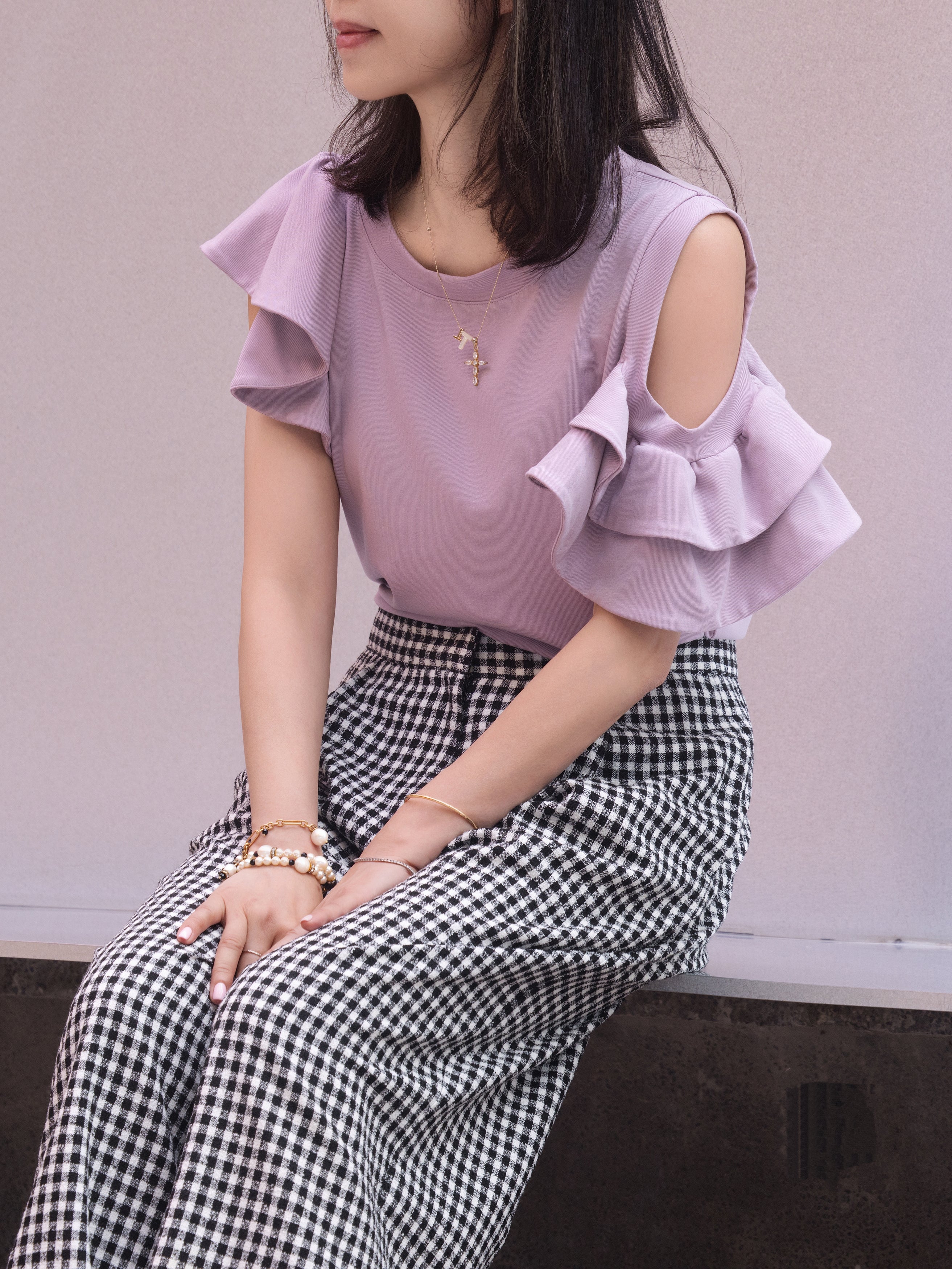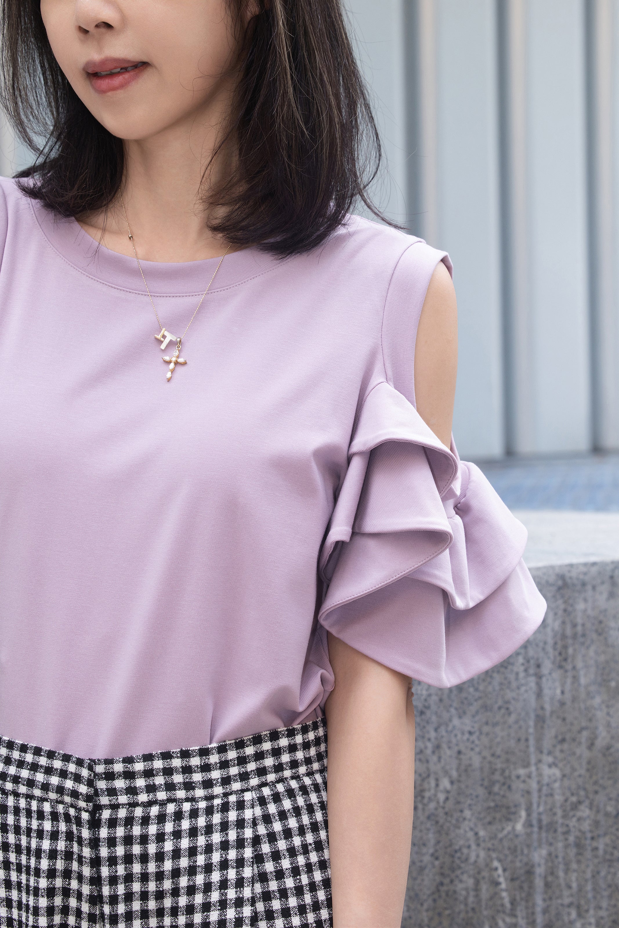 TYNVIE 平纹针织露肩荷叶边袖上衣 - 紫色