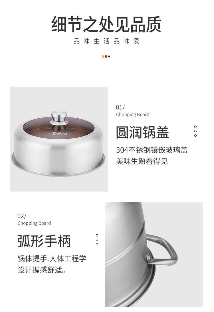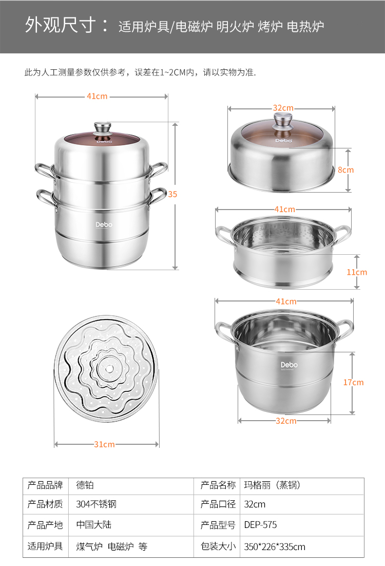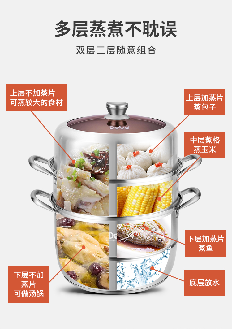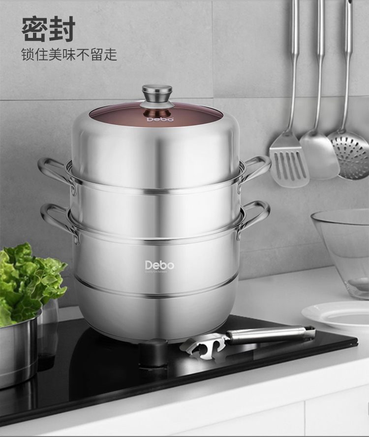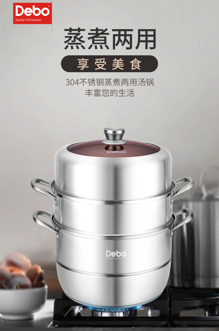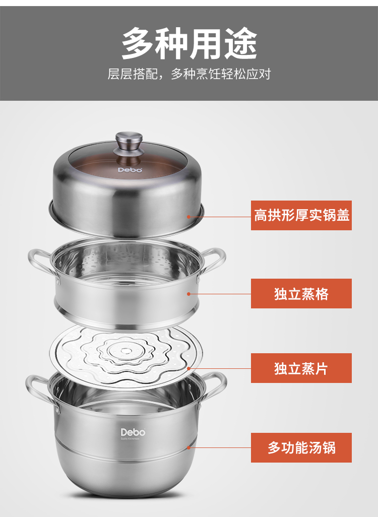 Debo 德铂玛格丽蒸锅304不锈钢32cm三层多用途汤锅蒸笼电磁炉燃气炉通用