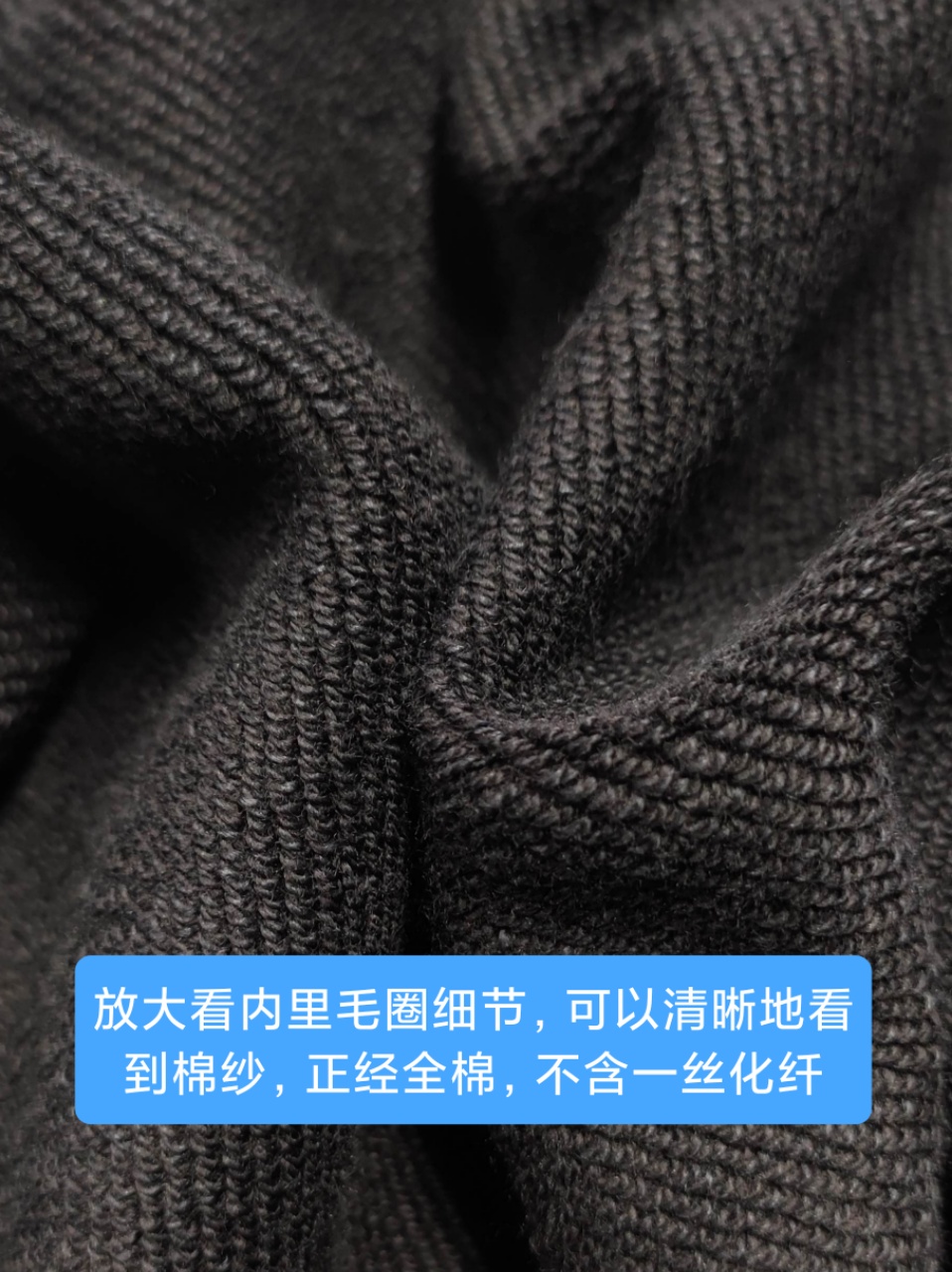 高达360克重的加厚毛圈面料,100%全棉,双面全精梳,内里的毛圈料也是全棉,成本昂贵。放大看内里毛圈细节,可以清晰地看到棉纱,正经全棉,不含一丝化纤。