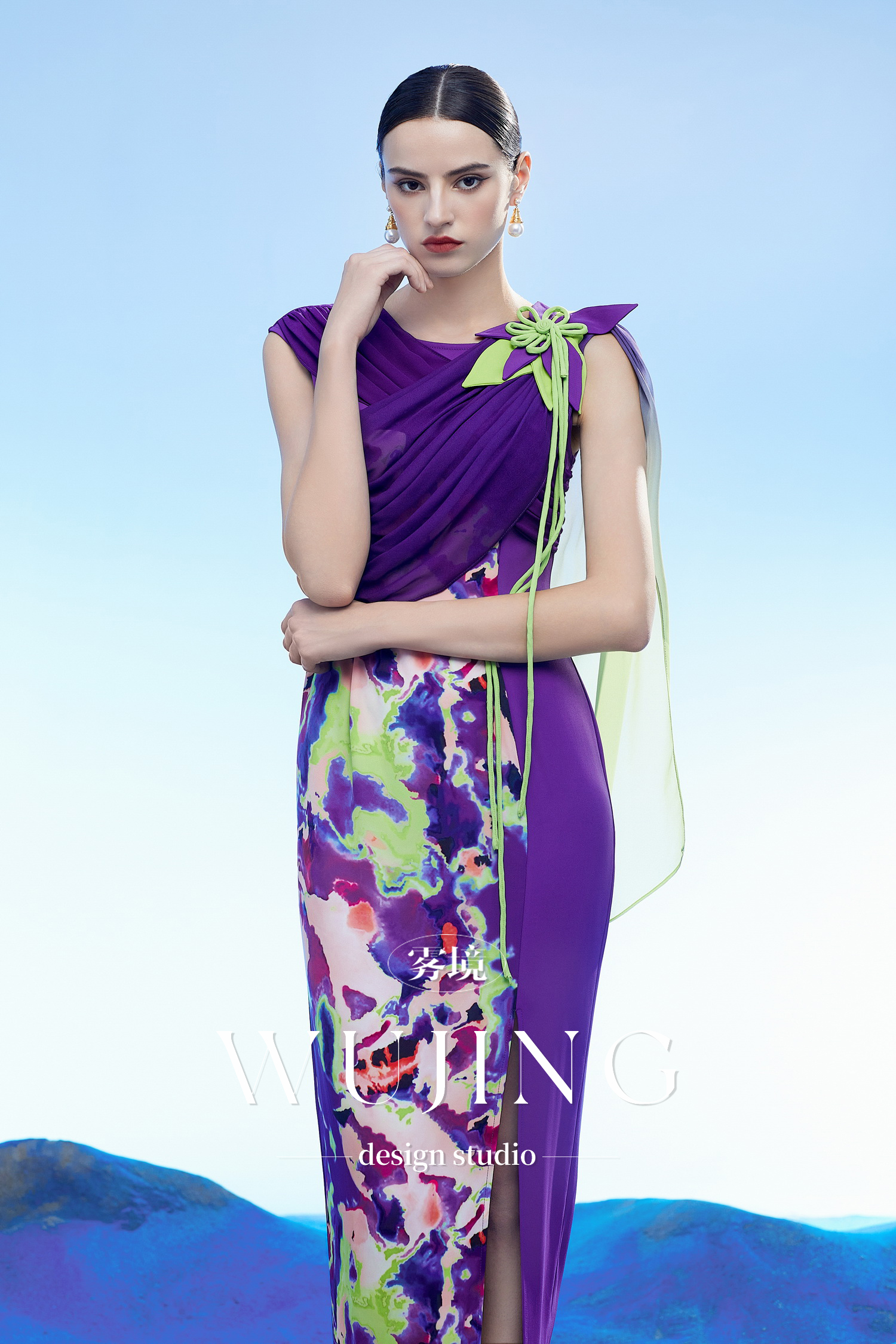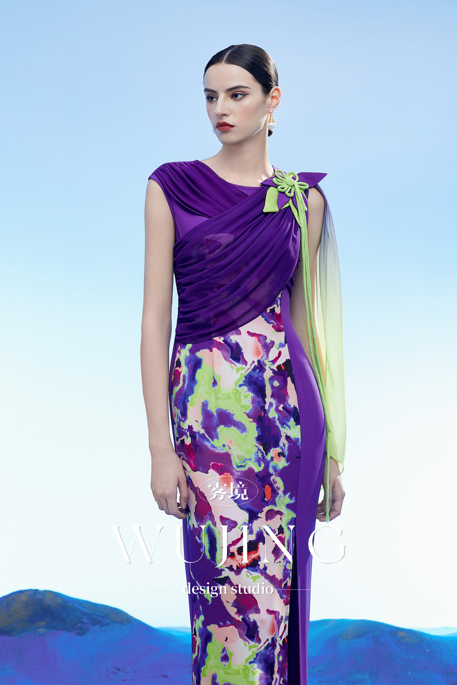 3204109 玉碧紫鸾 韩国进口水晶乔其纱进口纹理蜂窝缎连衣裙 雾境