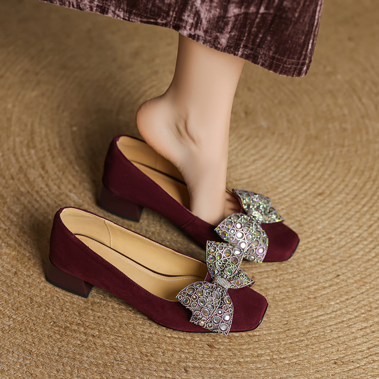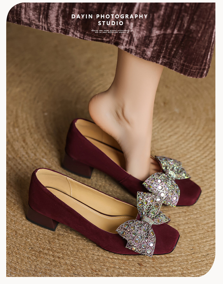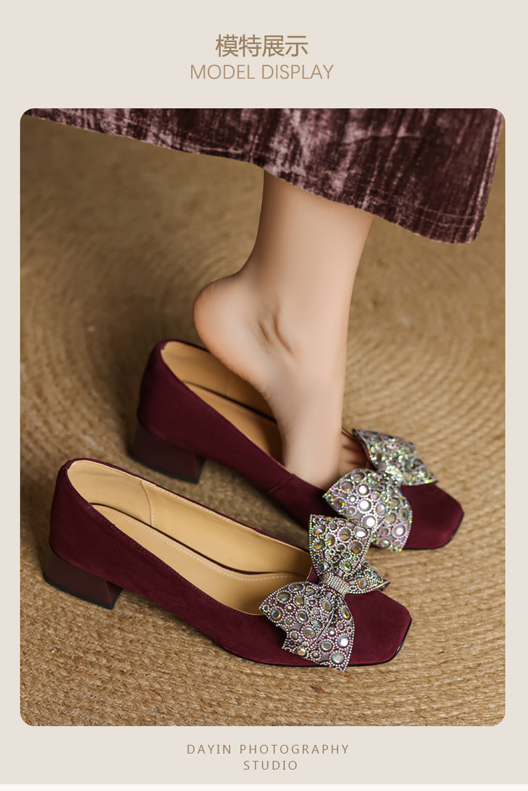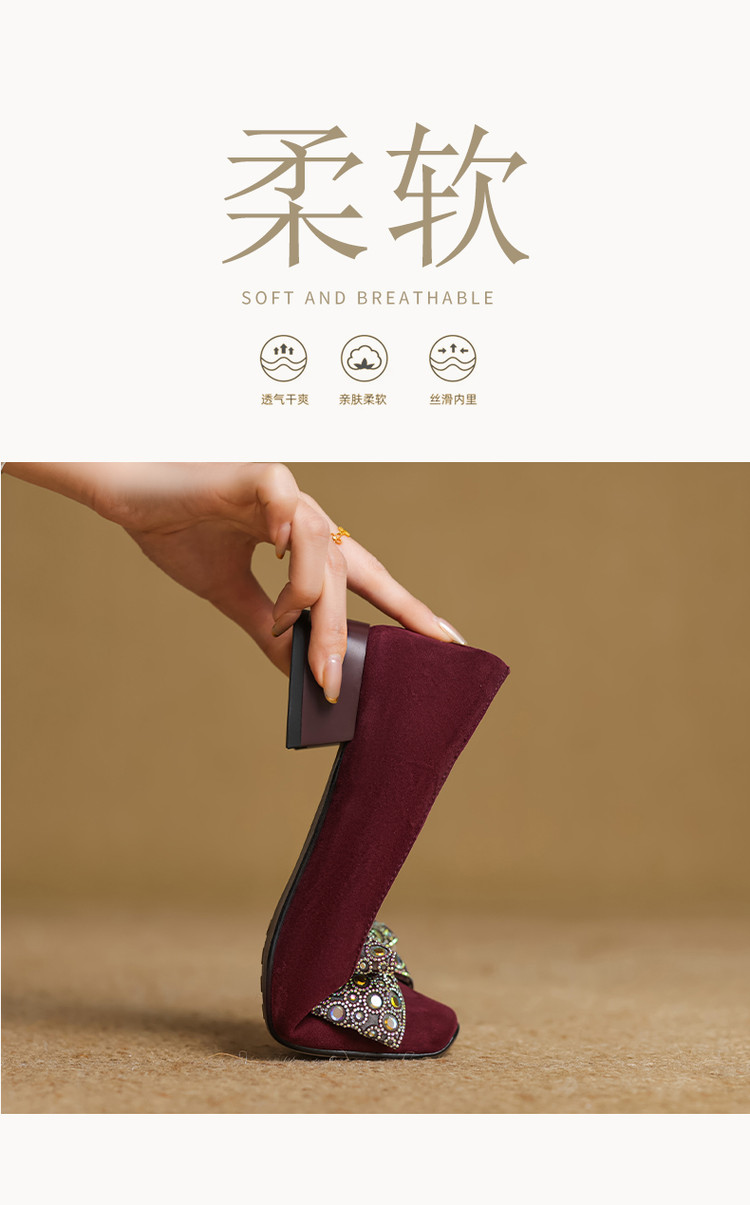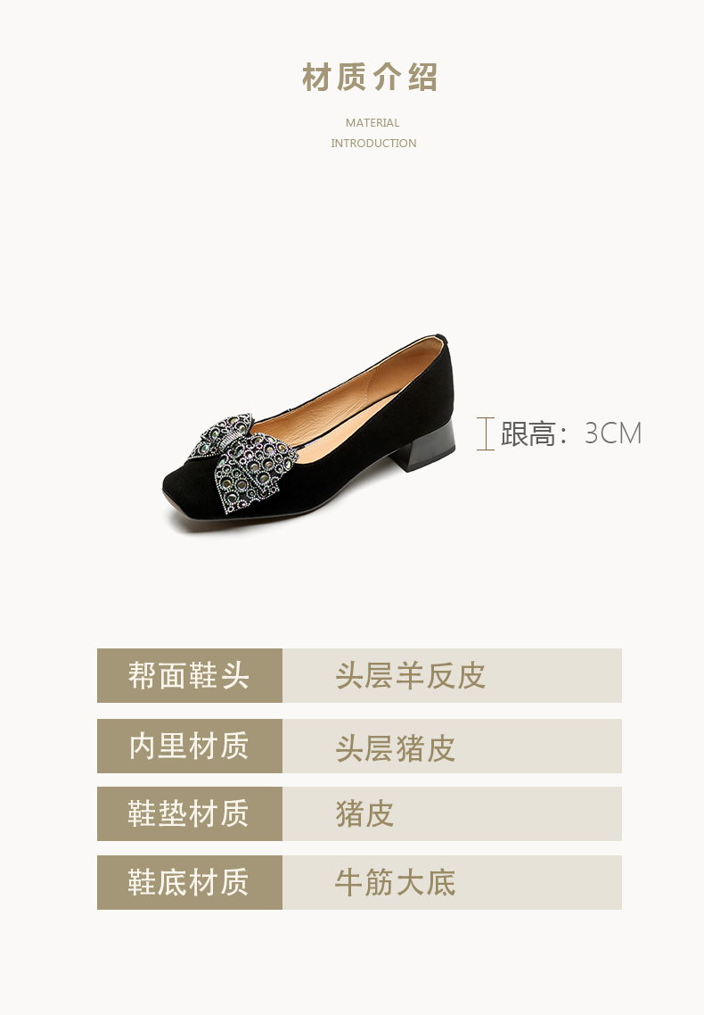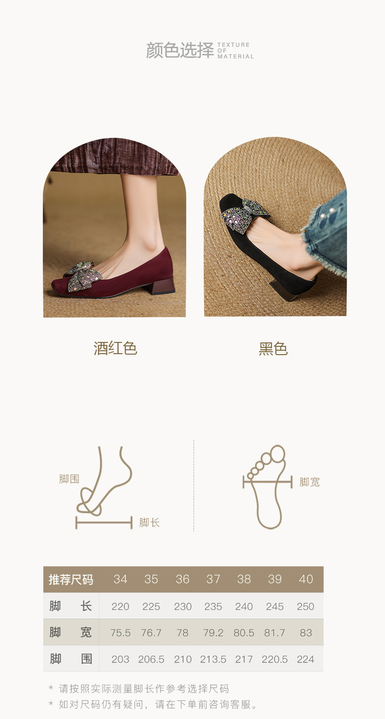 【货 号】75-2【鞋面材质】羊翻绒【内里材质】 头层猪皮 【垫 底】猪皮【跟 高】3cm【鞋底材质】牛筋底【颜 色】黑色 酒红色【尺 码】34 -- 40 (大小定制不退换)